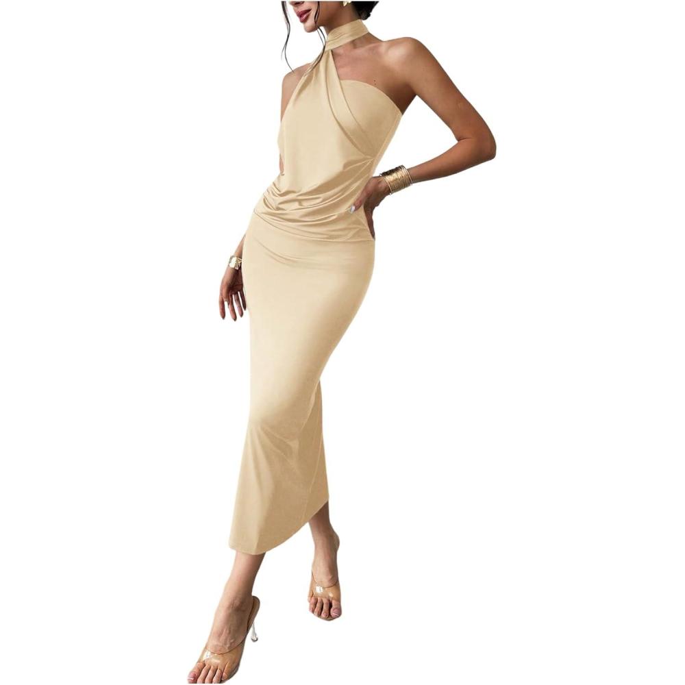 SOLY HUX Women’s Sleeveless Bodycon Dress One Shoulder Backless Ruched Cocktail Party Evening Long Dresses(Pure Khaki)