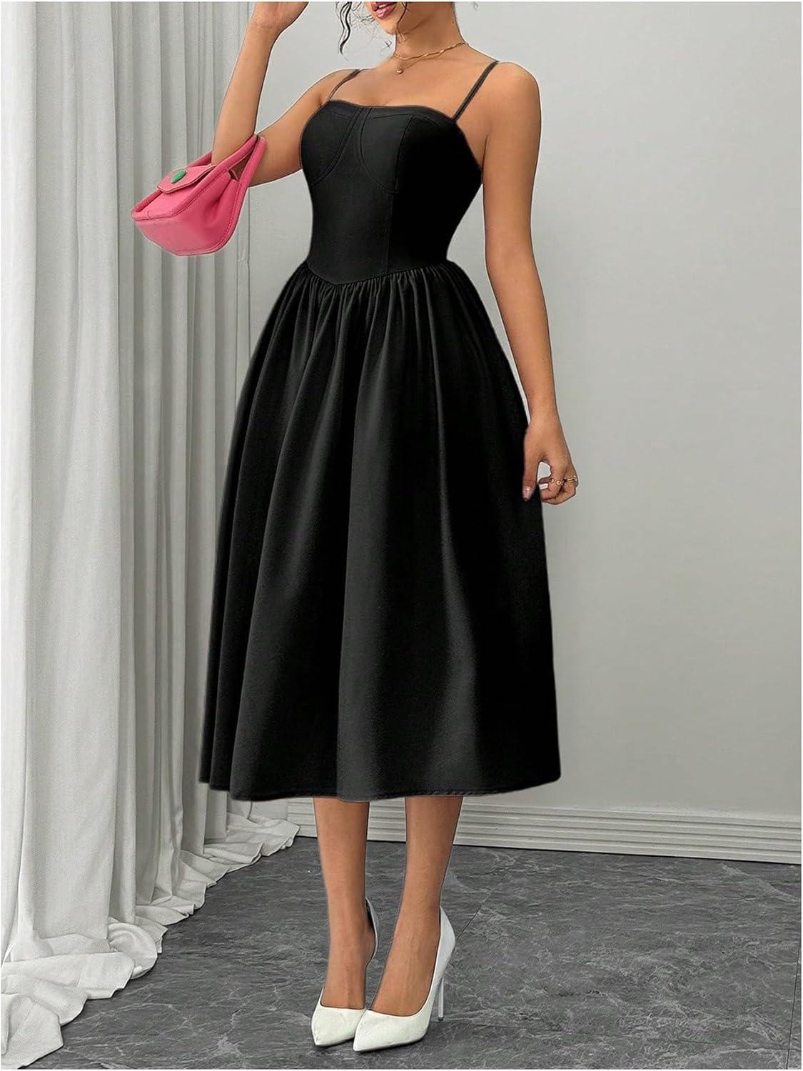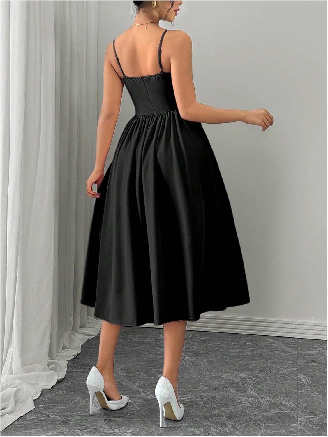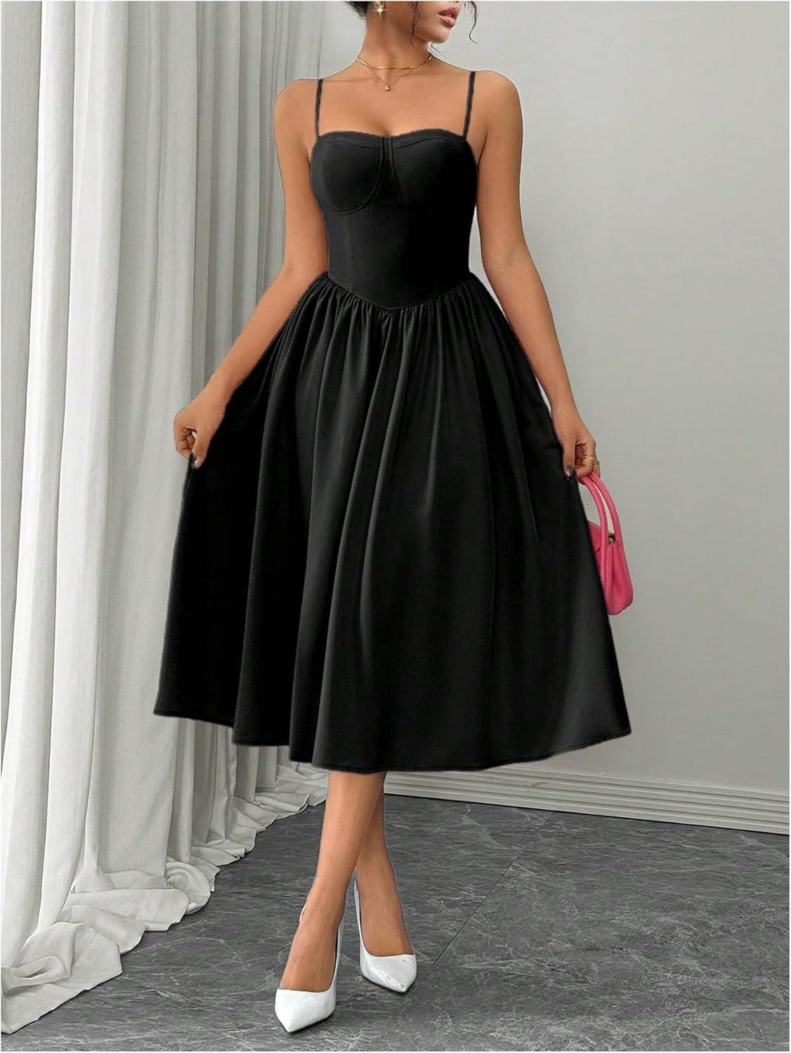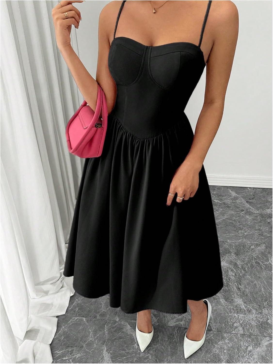 SOLY HUX Women’s Sleeveless Midi Corset Dress Flared A Line Flowy Party Cami Dresses(Pure Black)
