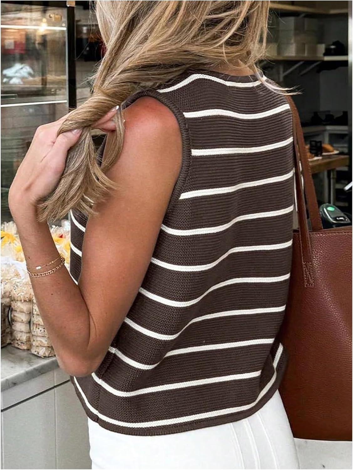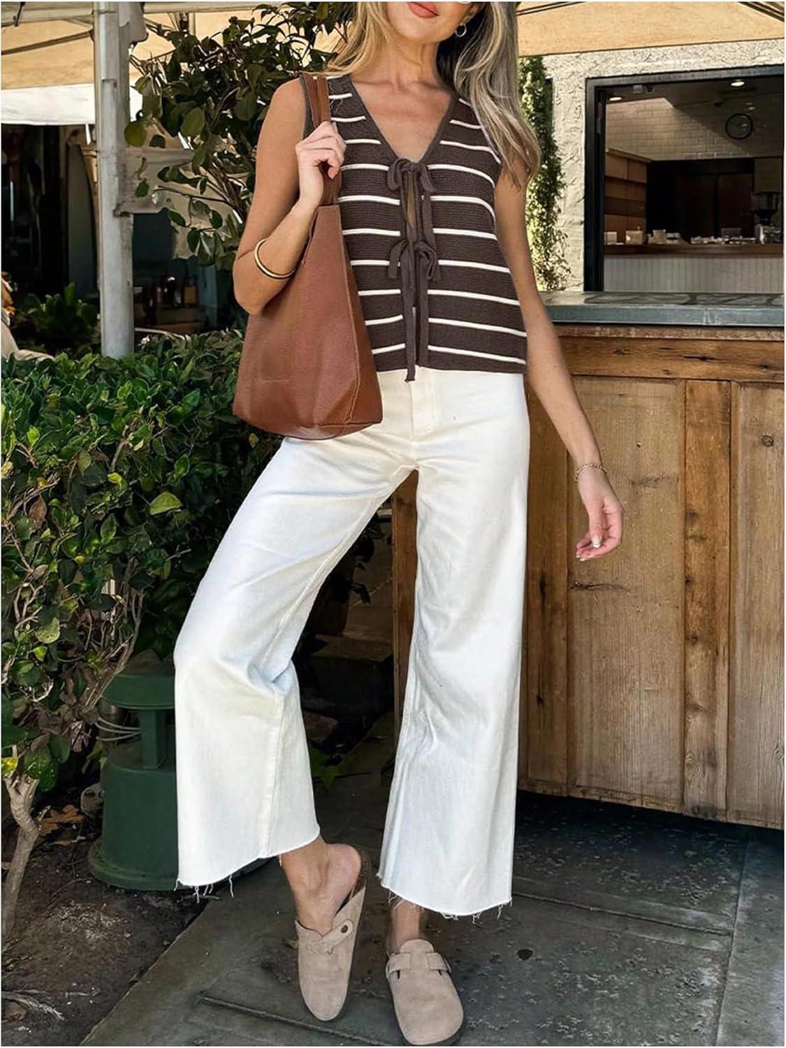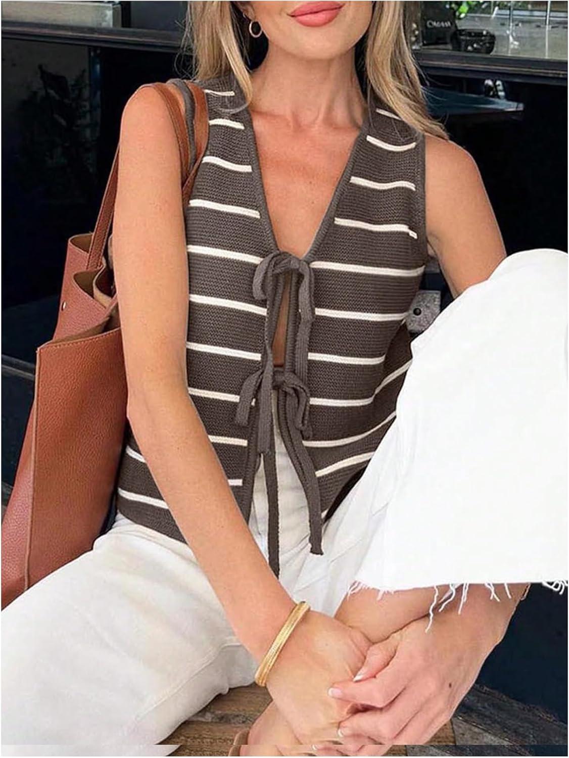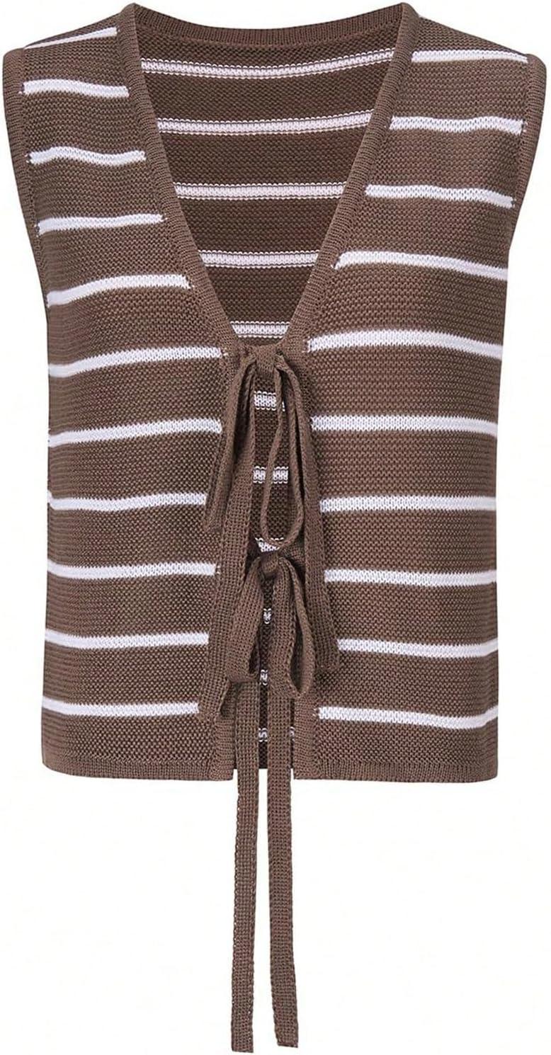 SOLY HUX Women’s Sleeveless Striped Sweater Vest V Neck Tie Bow Crochet Knit Tank Tops Casual Loose Cardigan(Brown Striped)