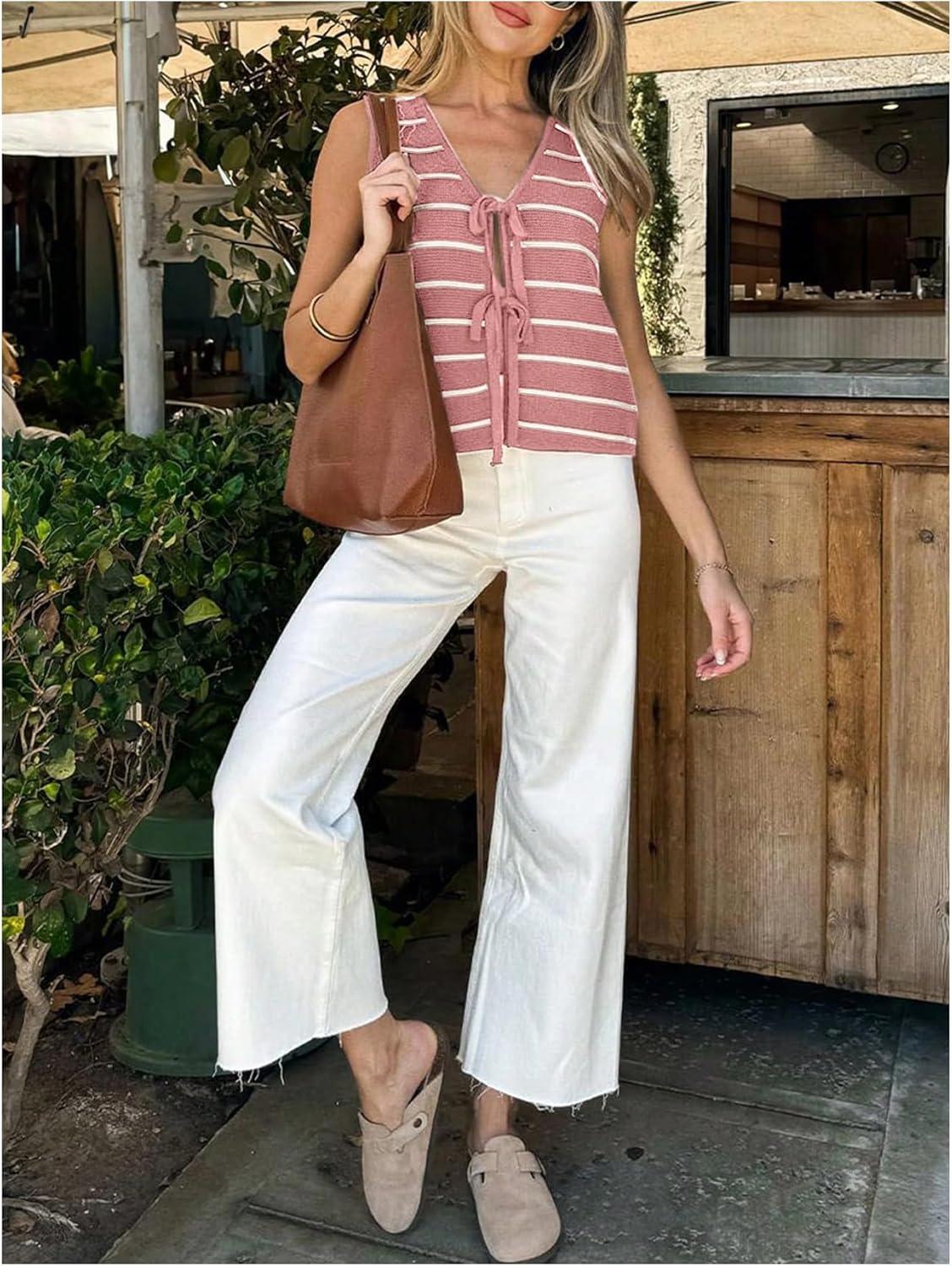SOLY HUX Women’s Sleeveless Striped Sweater Vest V Neck Tie Bow Crochet Knit Tank Tops Casual Loose Cardigan(White Striped)