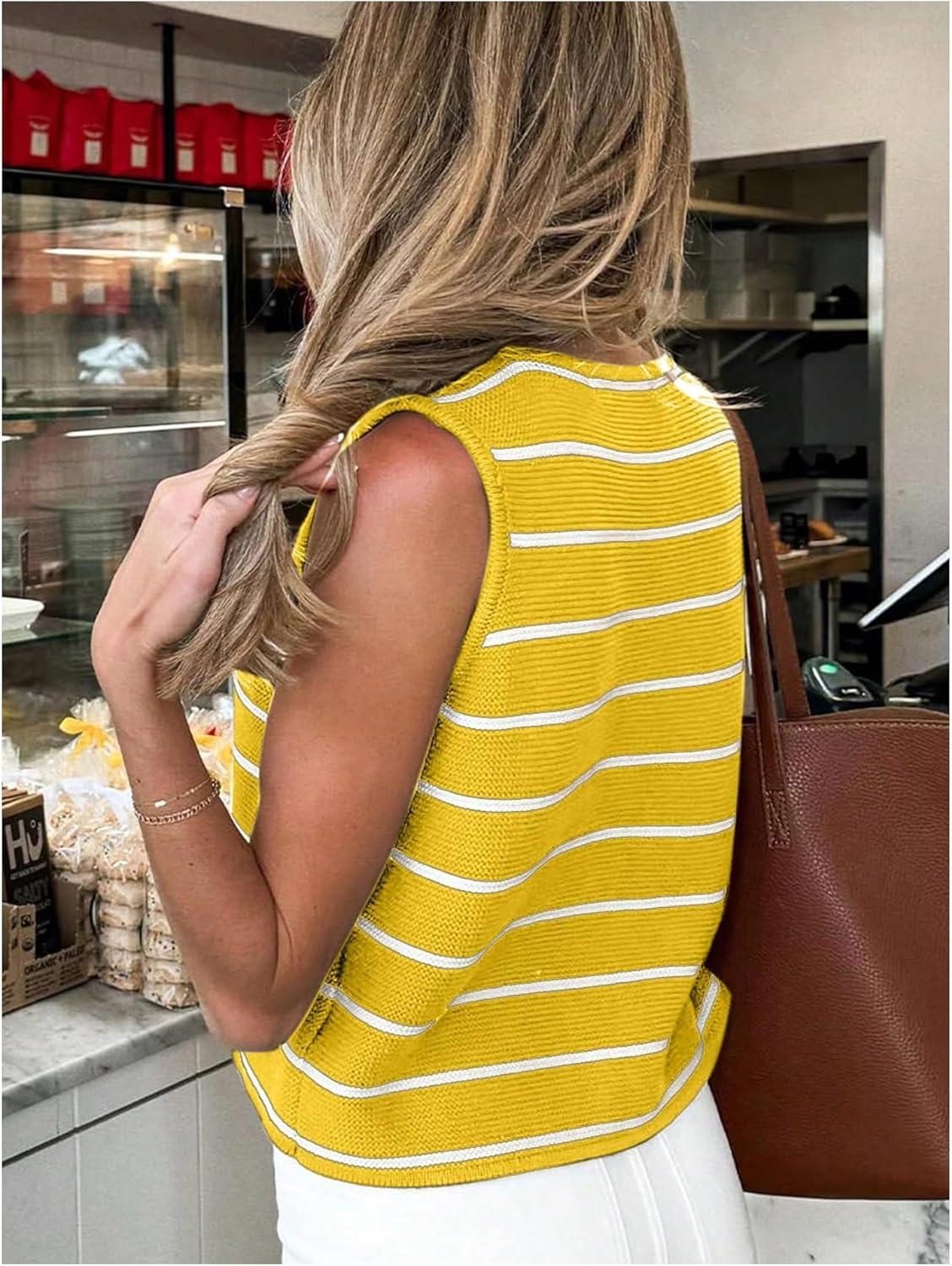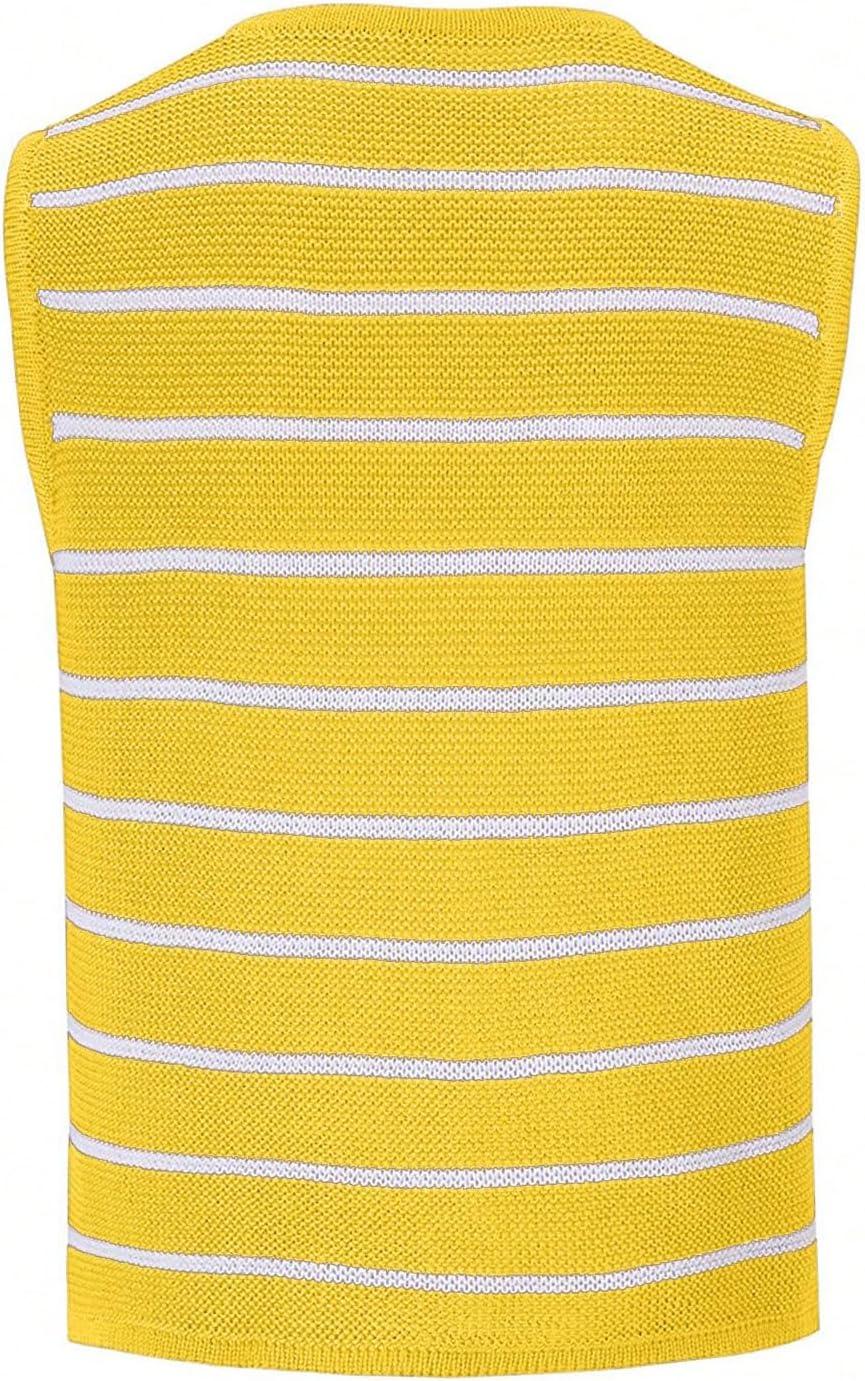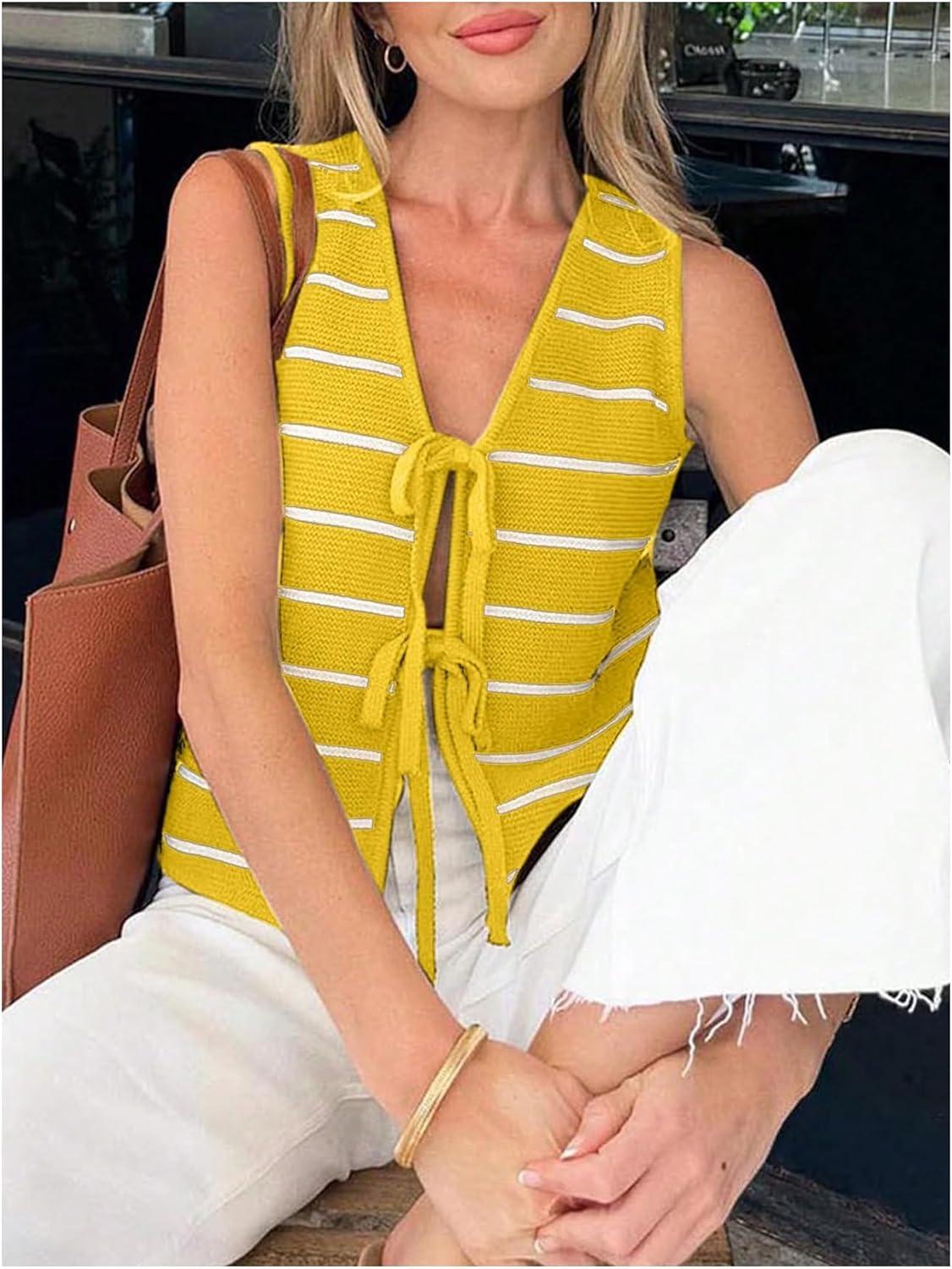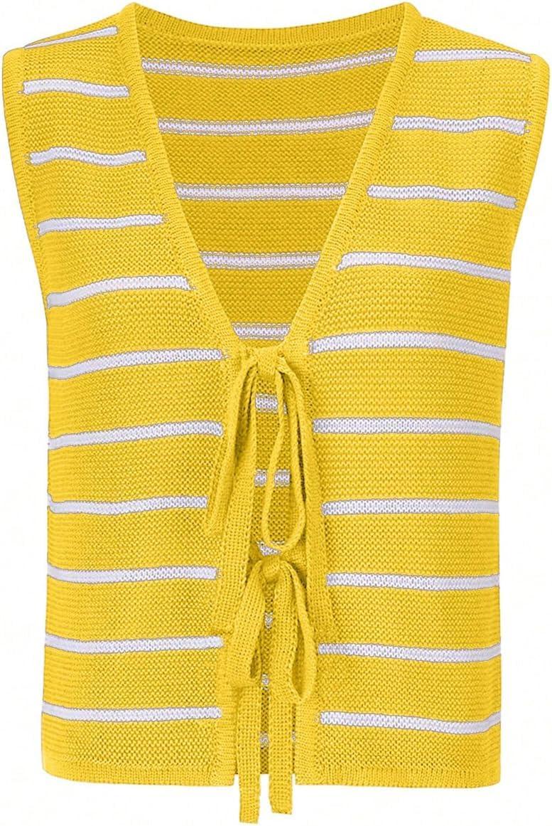 SOLY HUX Women’s Sleeveless Striped Sweater Vest V Neck Tie Bow Crochet Knit Tank Tops Casual Loose Cardigan(Yellow Striped)