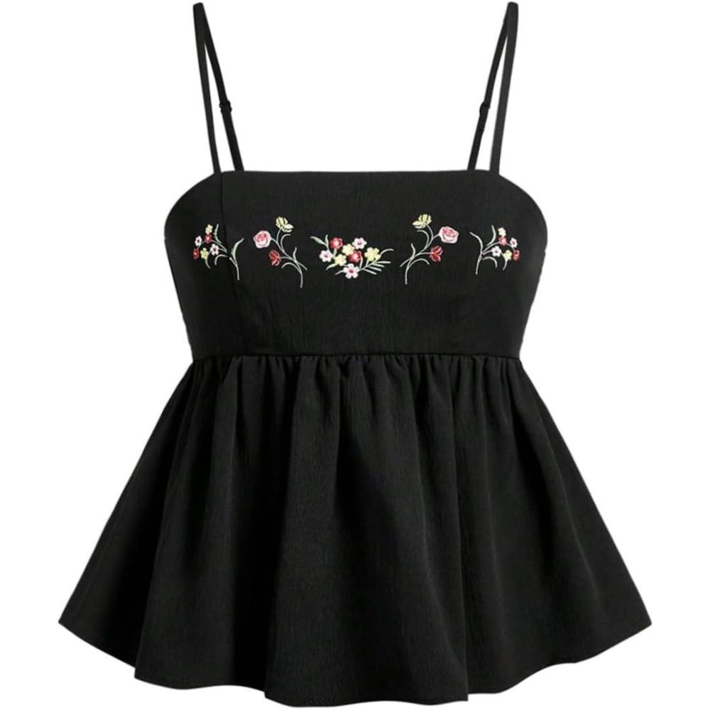 SOLY HUX Women’s Spaghetti Strap Ruffle Hem Peplum Cami Top Jacquard Camisole(Black Floral)