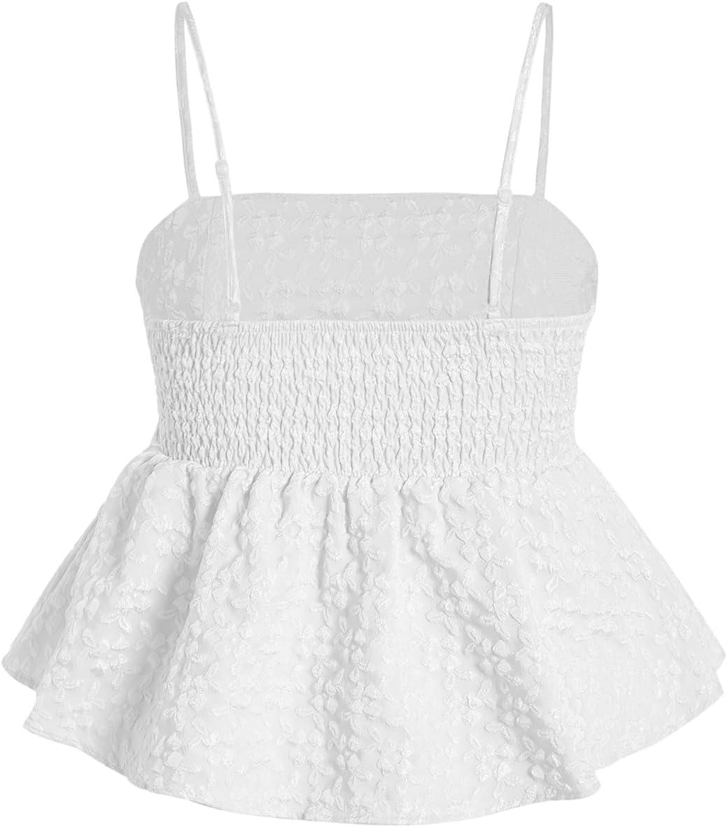 SOLY HUX Women’s Spaghetti Strap Ruffle Hem Peplum Cami Top Jacquard Camisole(Plain White Jacquard)