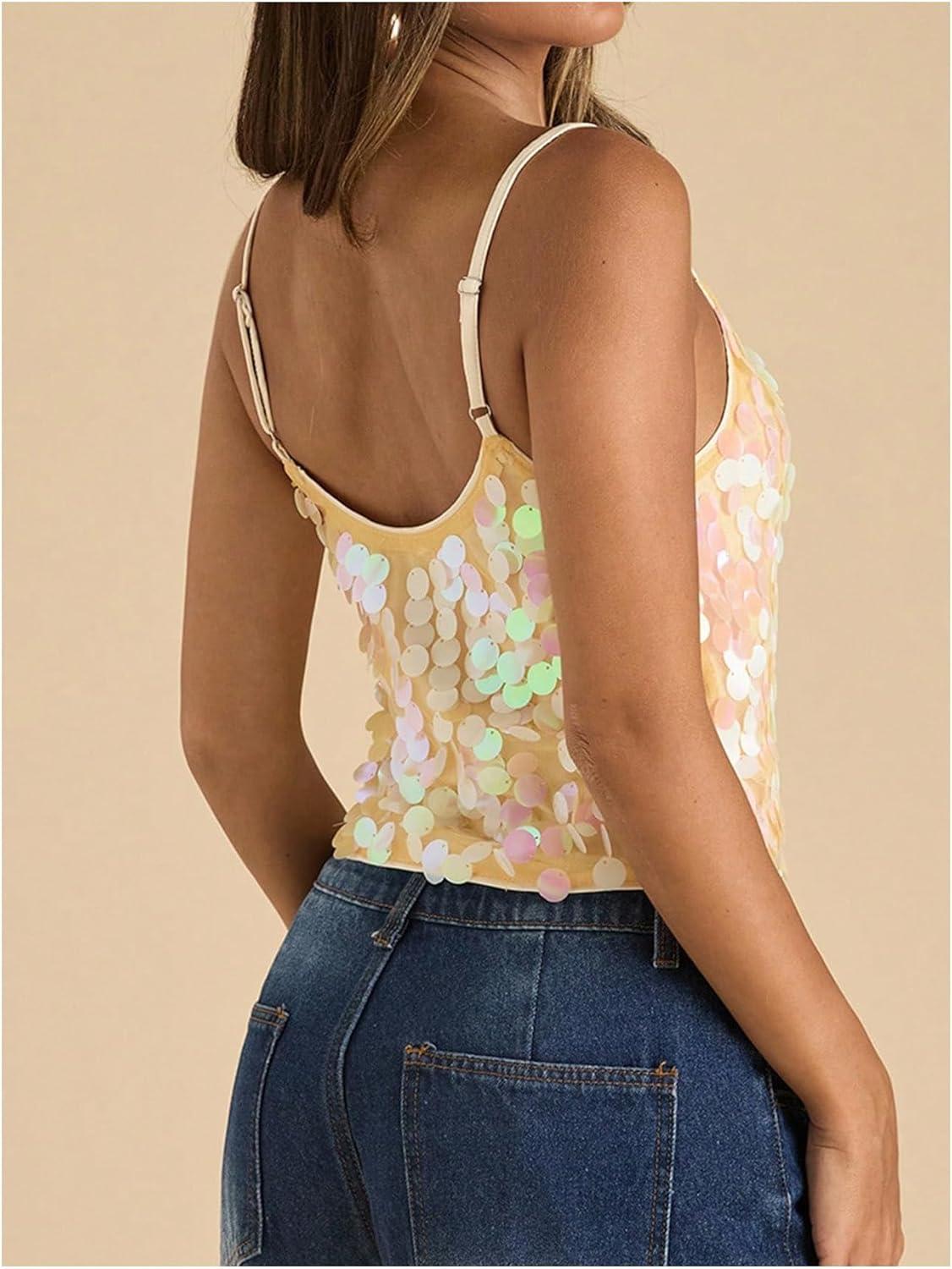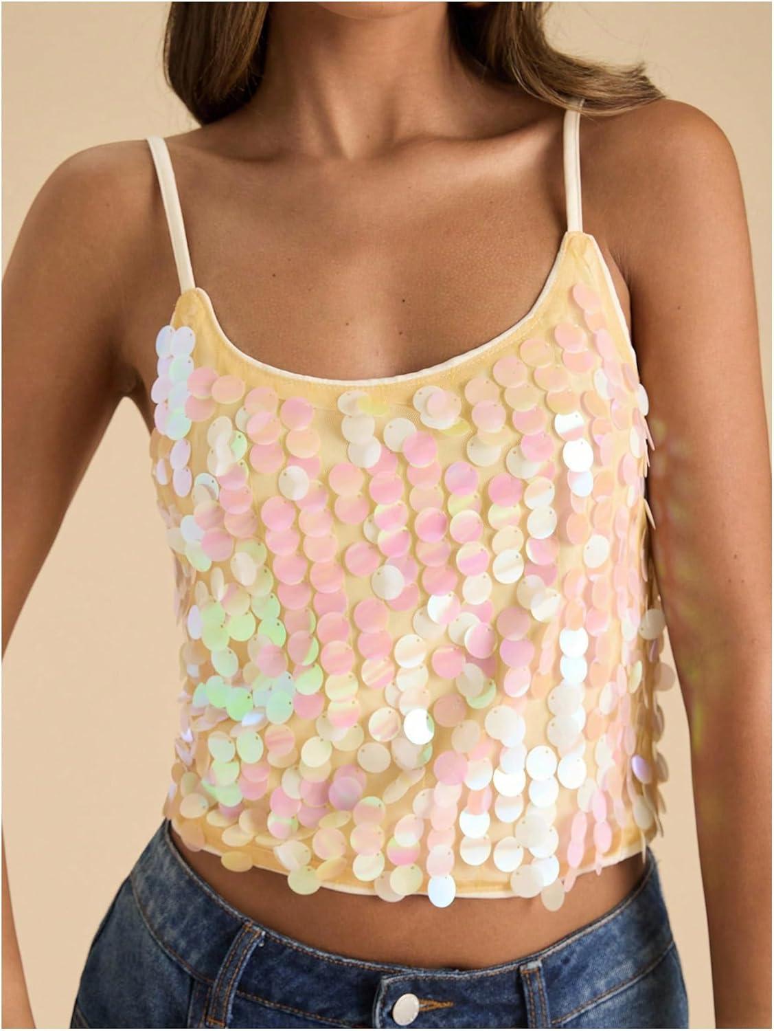SOLY HUX Women’s Sparkly Sequin Tops Spaghetti Strap Scoop Neck Summer Camisole Going Out Party Club Top(Multicoloured)