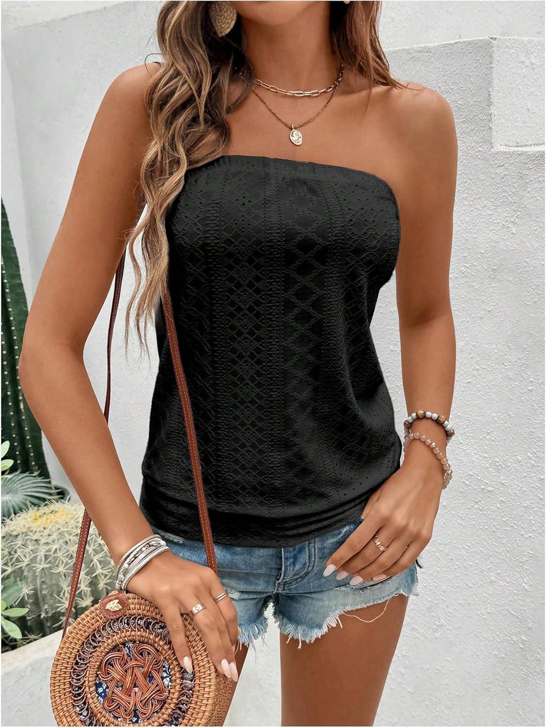SOLY HUX Women’s Strapless Bandeau Tank Top Casual Summer Sleeveless Eyelet Tube Tops(Plain Black)