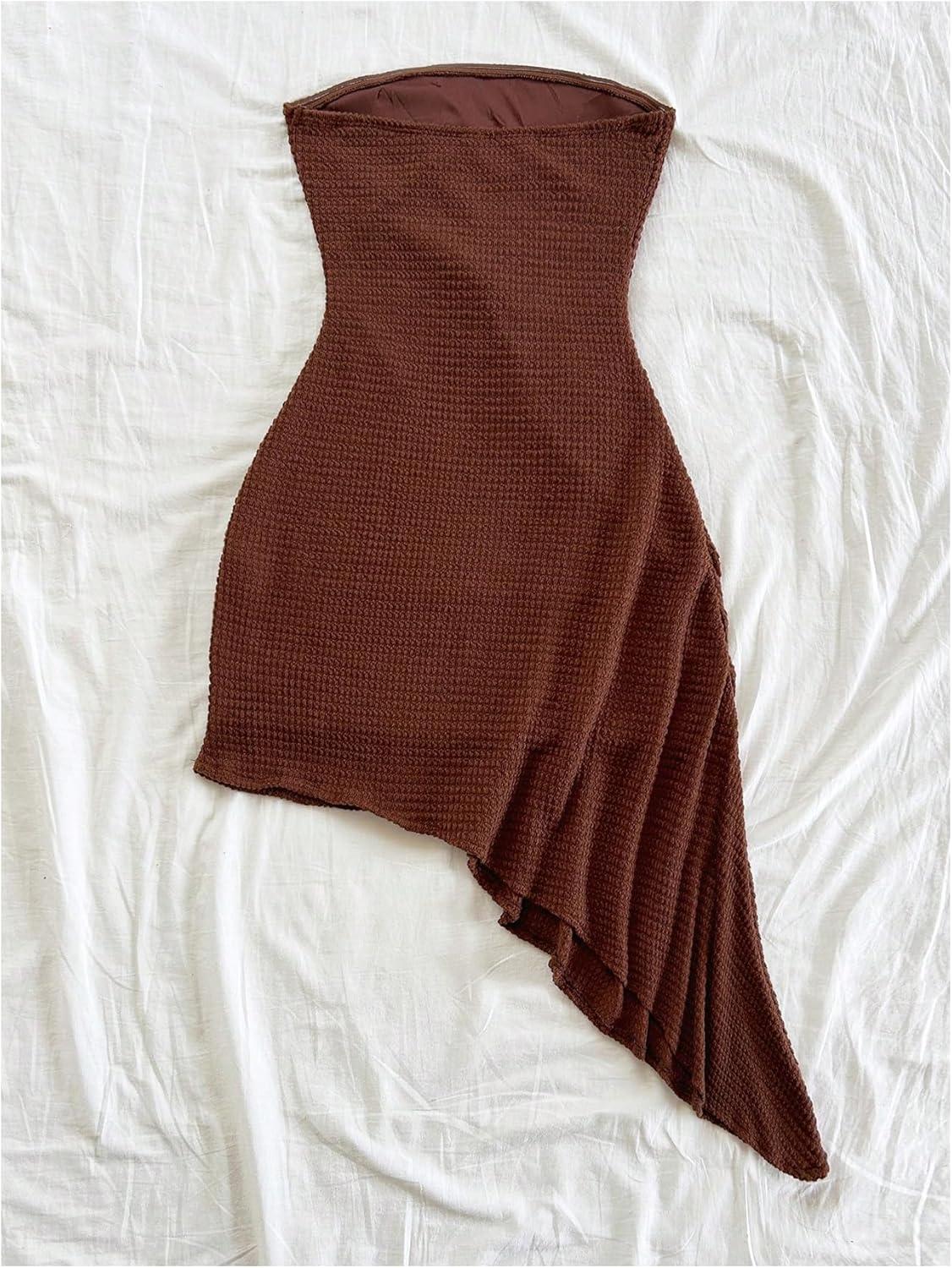 SOLY HUX Women’s Strapless Tube Mini Dress Ruched Sleeveless Asymmetrical Hem Vacation Summer Dresses(Plain Coffee Brown)
