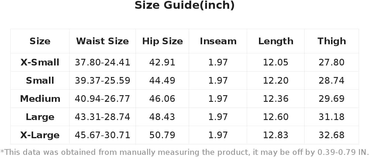 XL:Hip Size:50.8IN,Thigh:32.7IN,Length:12.8IN,Waist Size:45.7-30.7IN,Inseam:2.0IN