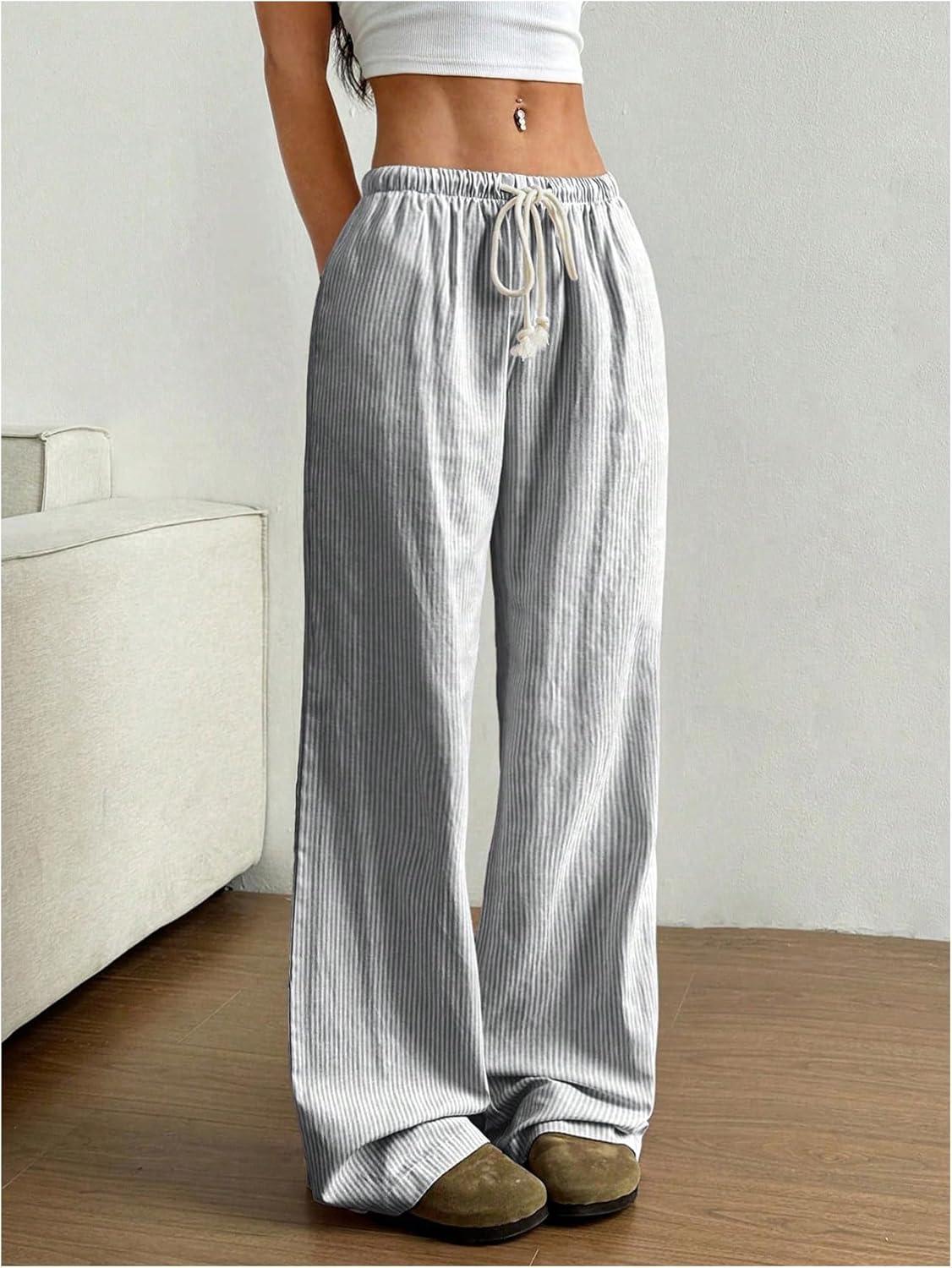 SOLY HUX Women’s Striped Drawstring Pants Straight Leg Casual Lounge Pajama Pants Boxer Bottoms Y2k Trousers with Pocket(Solid Grey)