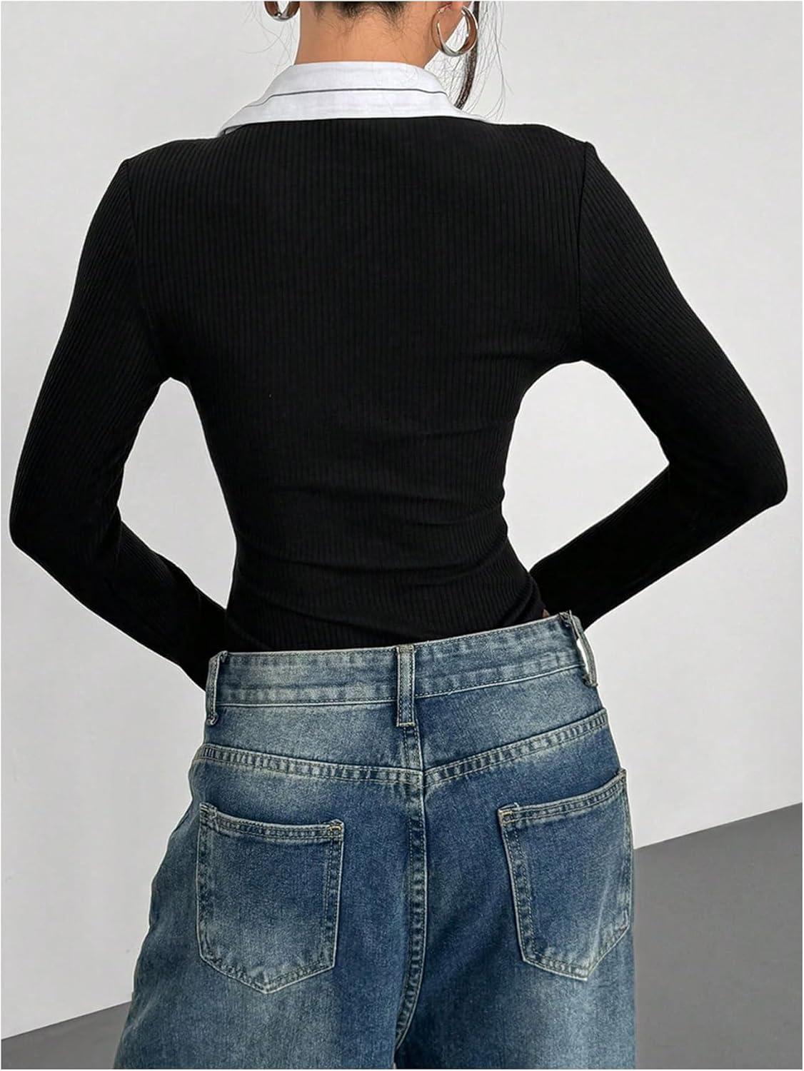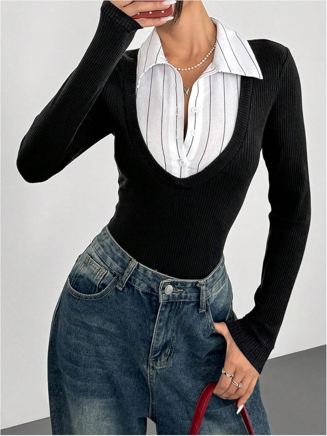 SOLY HUX Women’s Striped Long Sleeve Bodysuits Button Down Tshirts Collared 2 in 1 Tops Preppy Clothes(Black and White)