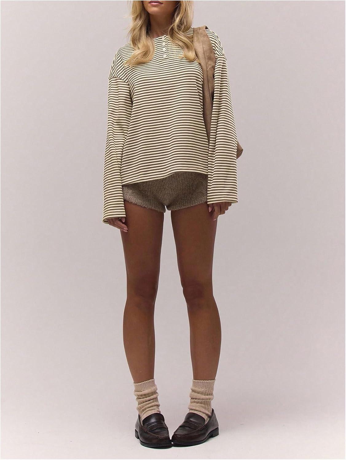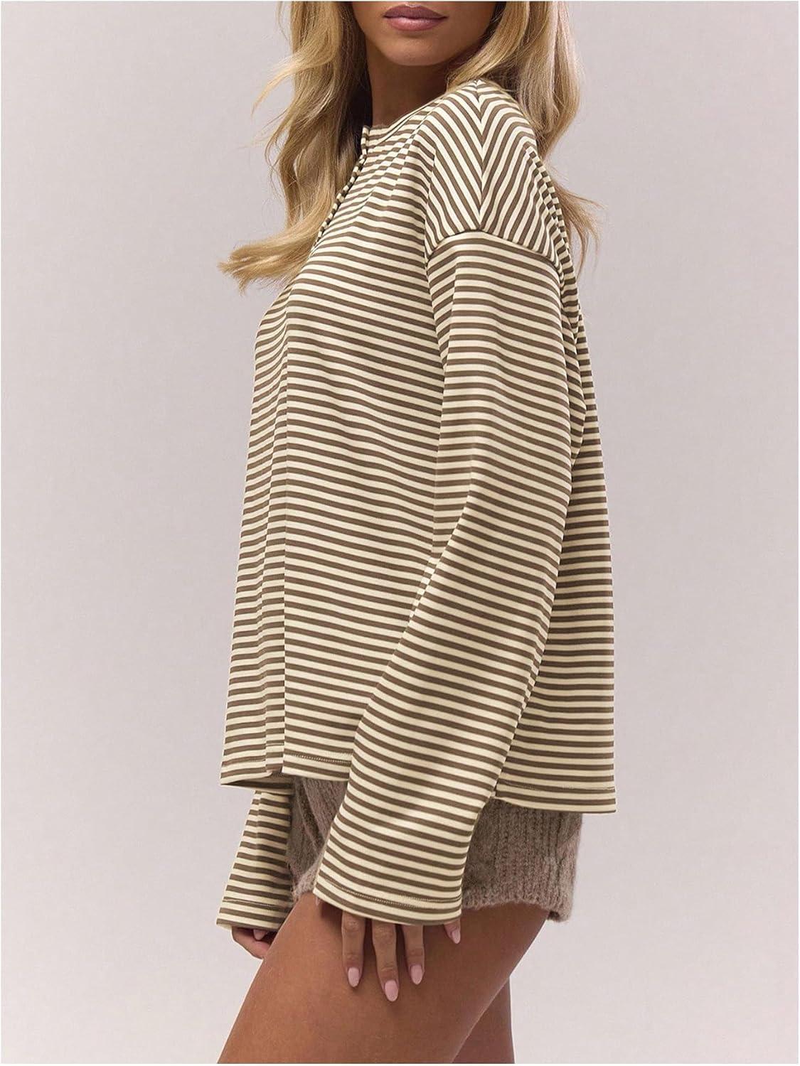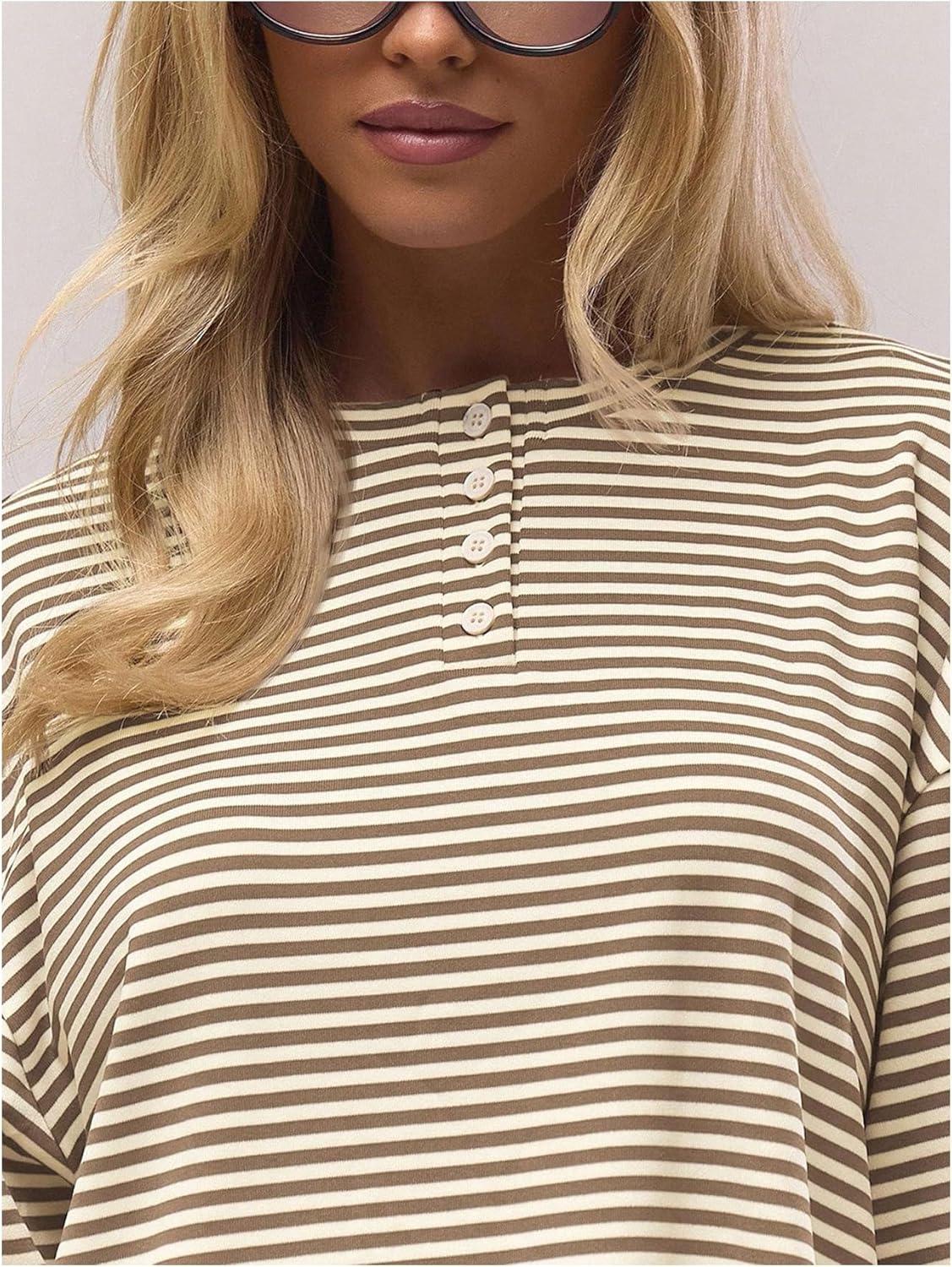SOLY HUX Women’s Striped Long Sleeve T Shirts Henley Tops Crew Neck Button Classic Tees Fall Clothes(Brown Striped)