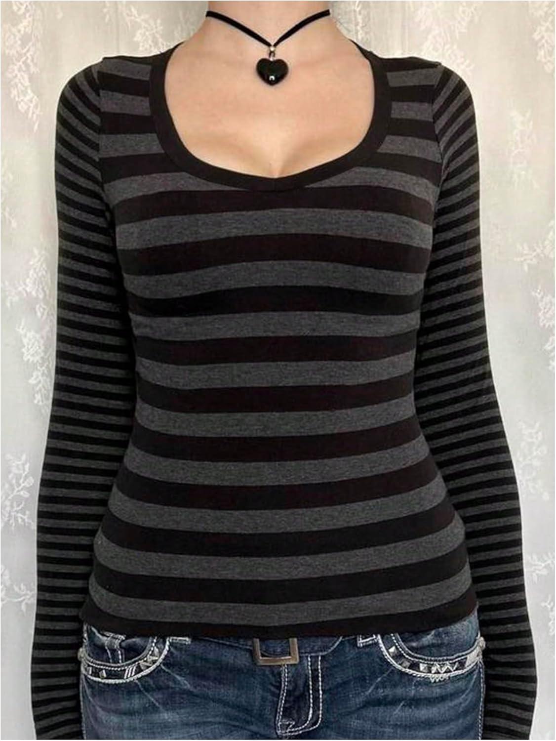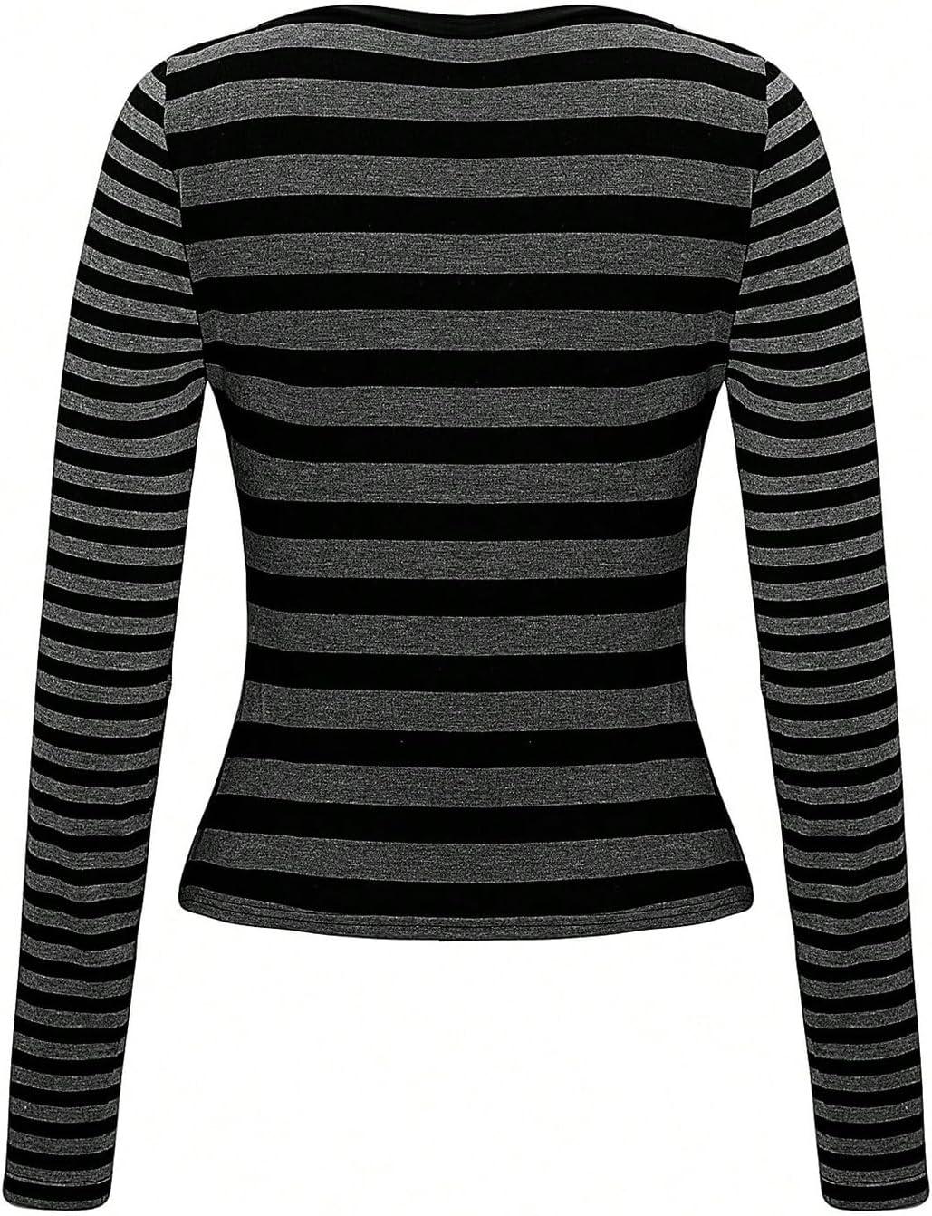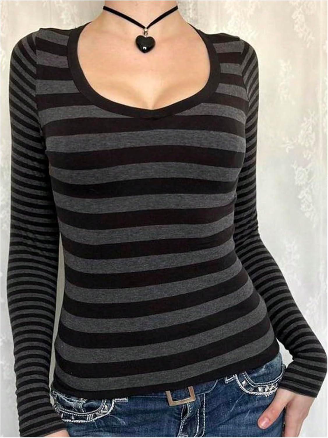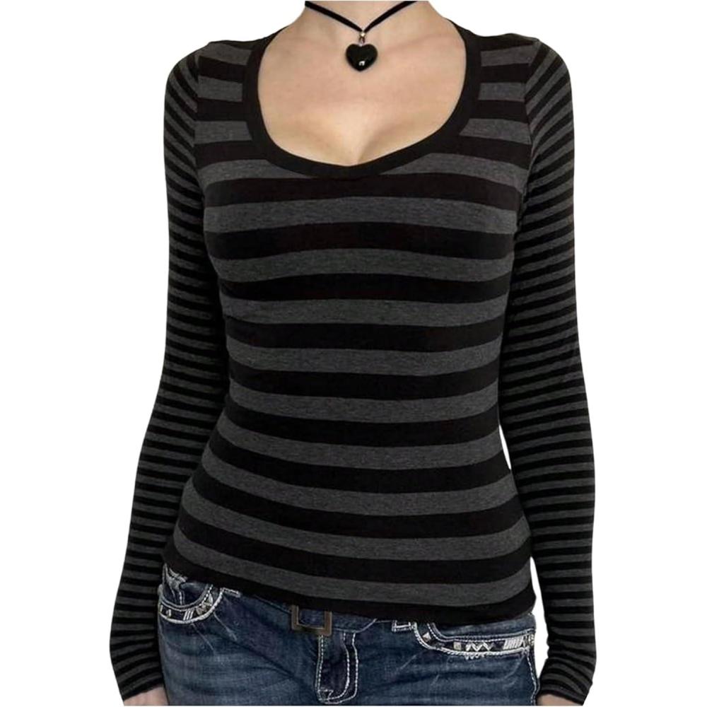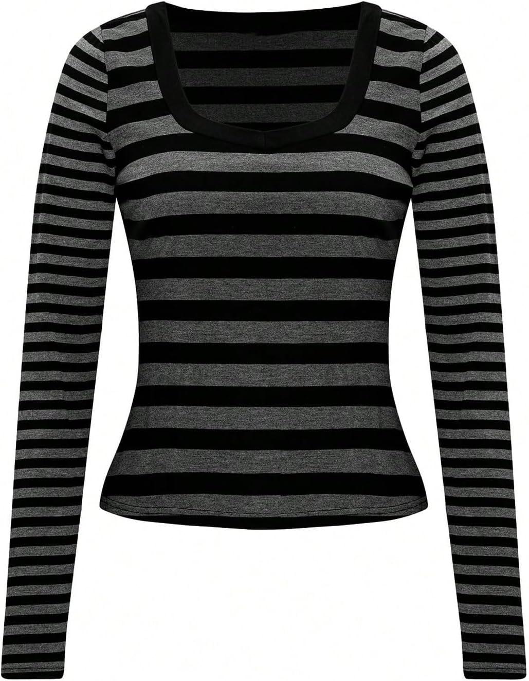 SOLY HUX Women’s Striped Long Sleeve T Shirts Scoop Neck Fitted Aesthetic Tees Y2k Grunge Top(Black and Grey)