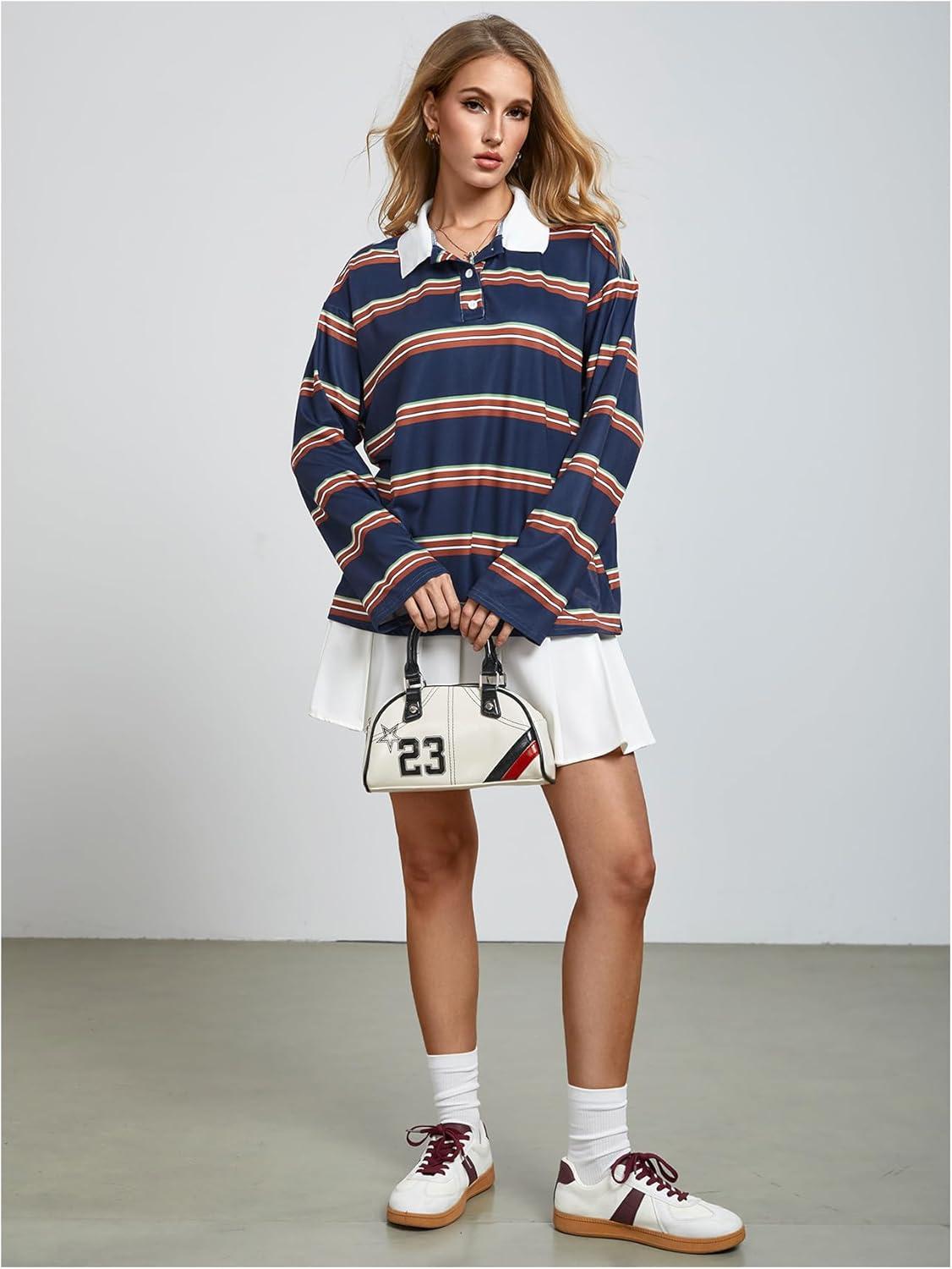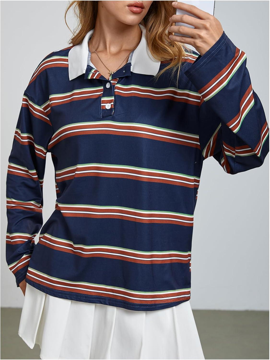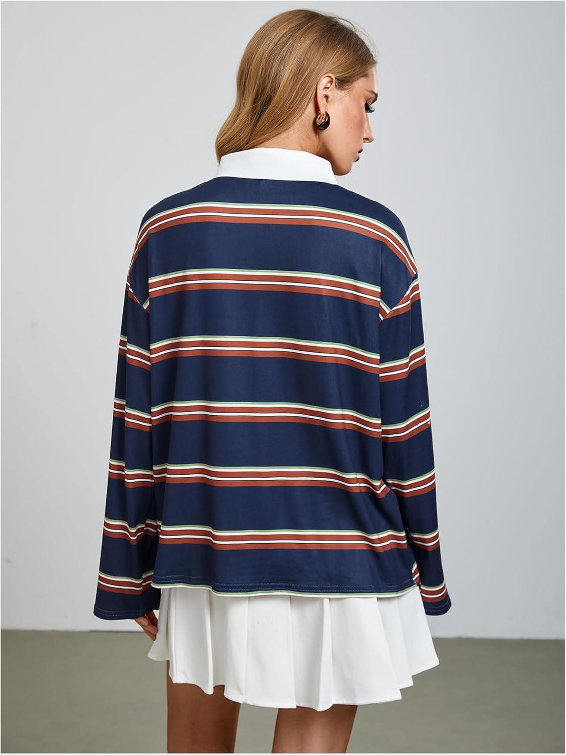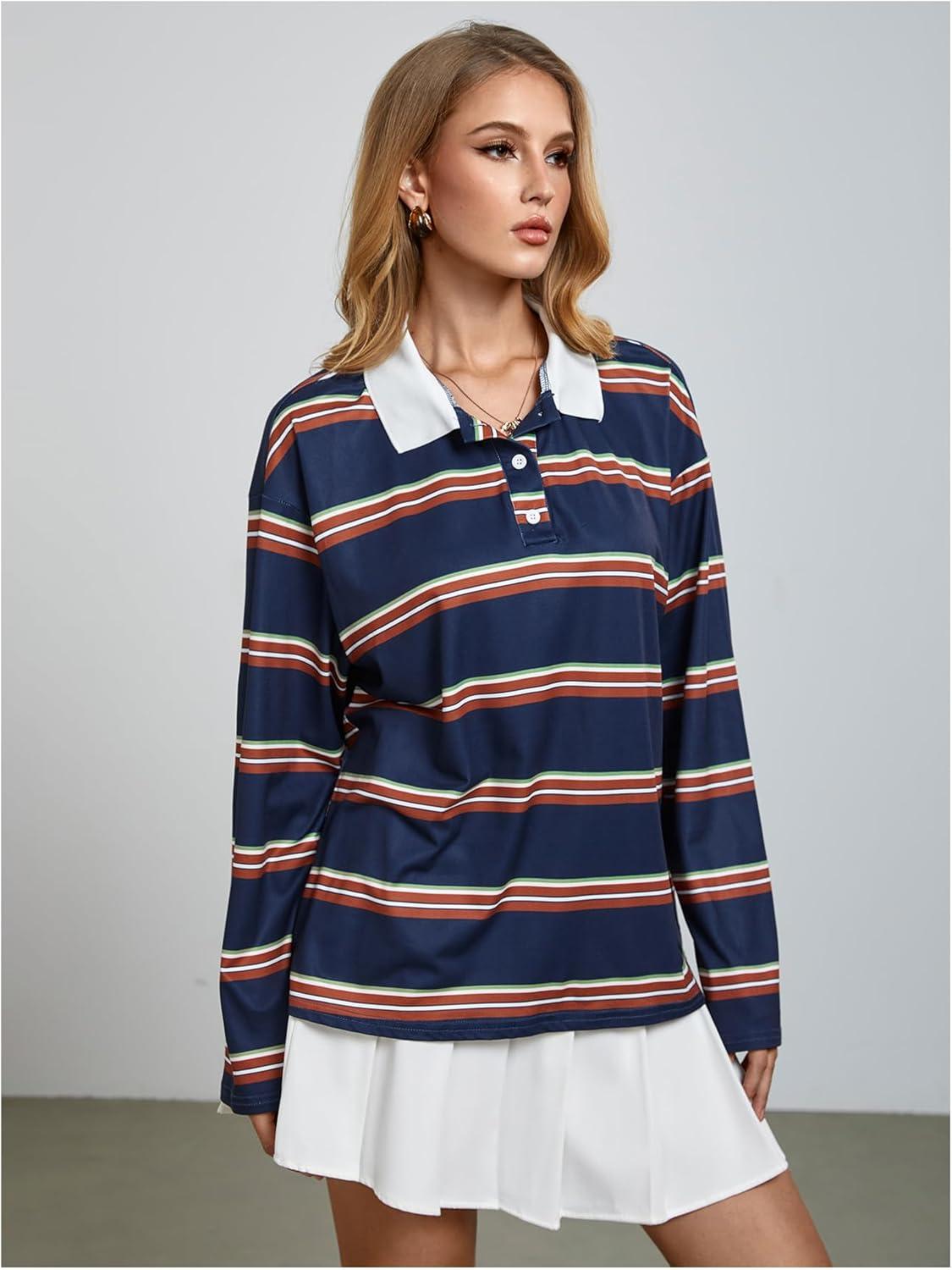 SOLY HUX Women’s Striped Oversized T Shirts Collared Long Sleeve Vintage Tees Streetwear(Multicolor Striped)
