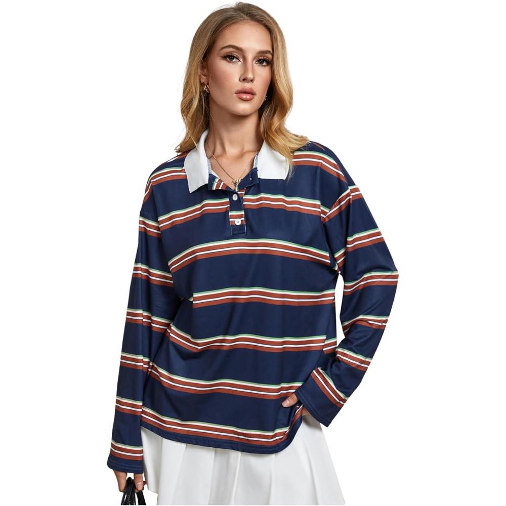 SOLY HUX Women’s Striped Oversized T Shirts Collared Long Sleeve Vintage Tees Streetwear(Multicoloured Striped)