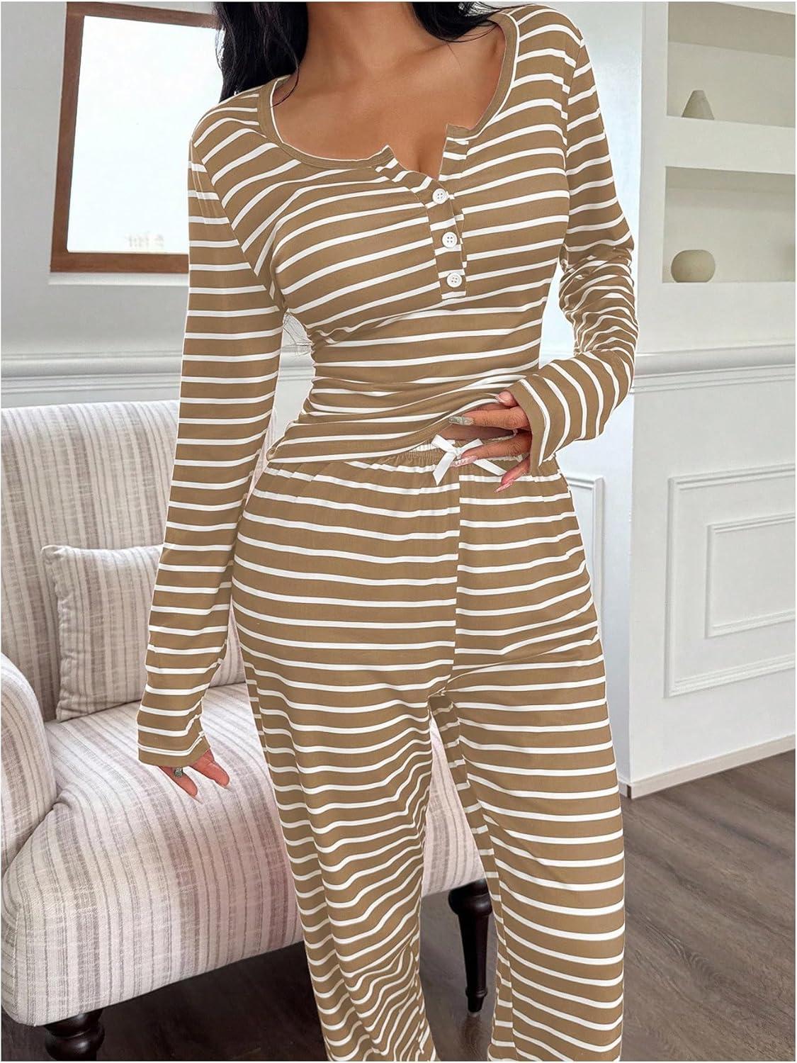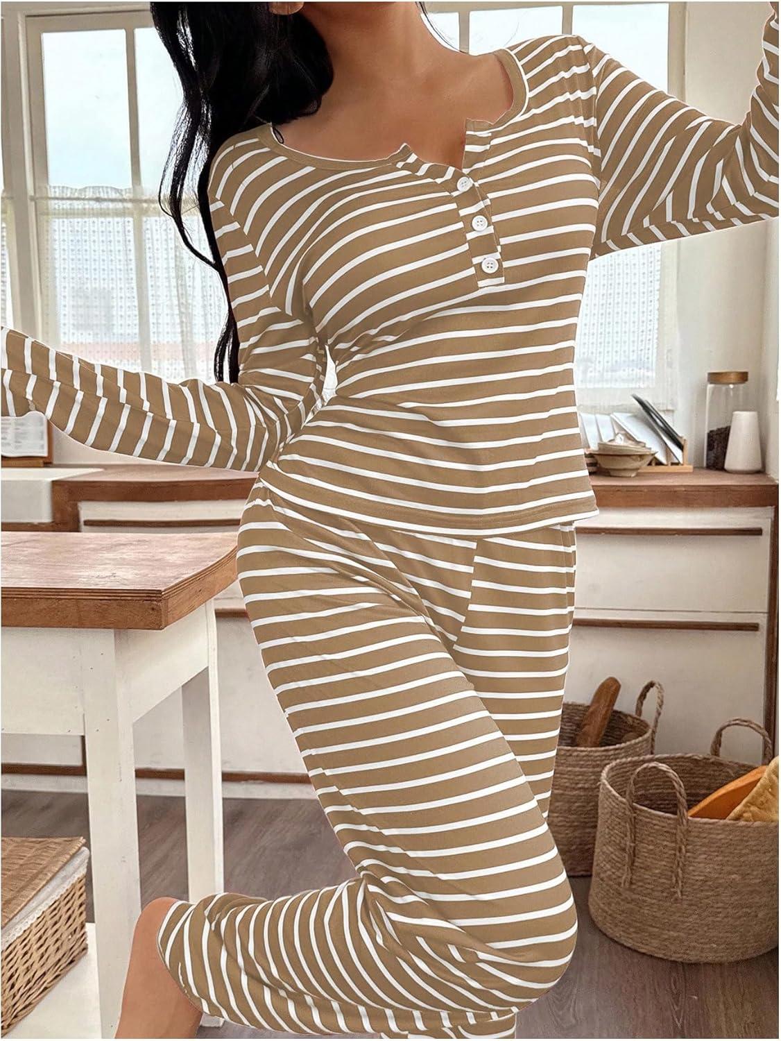 SOLY HUX Women’s Striped Pajama Set Long Sleeve T Shirt Tops and Pants Fall Loungewear Sleepwear(Khaki Striped)