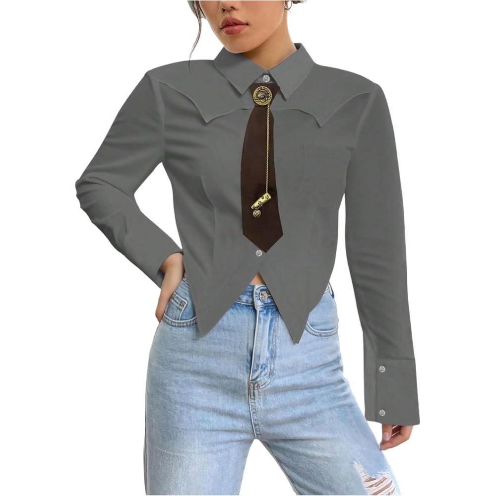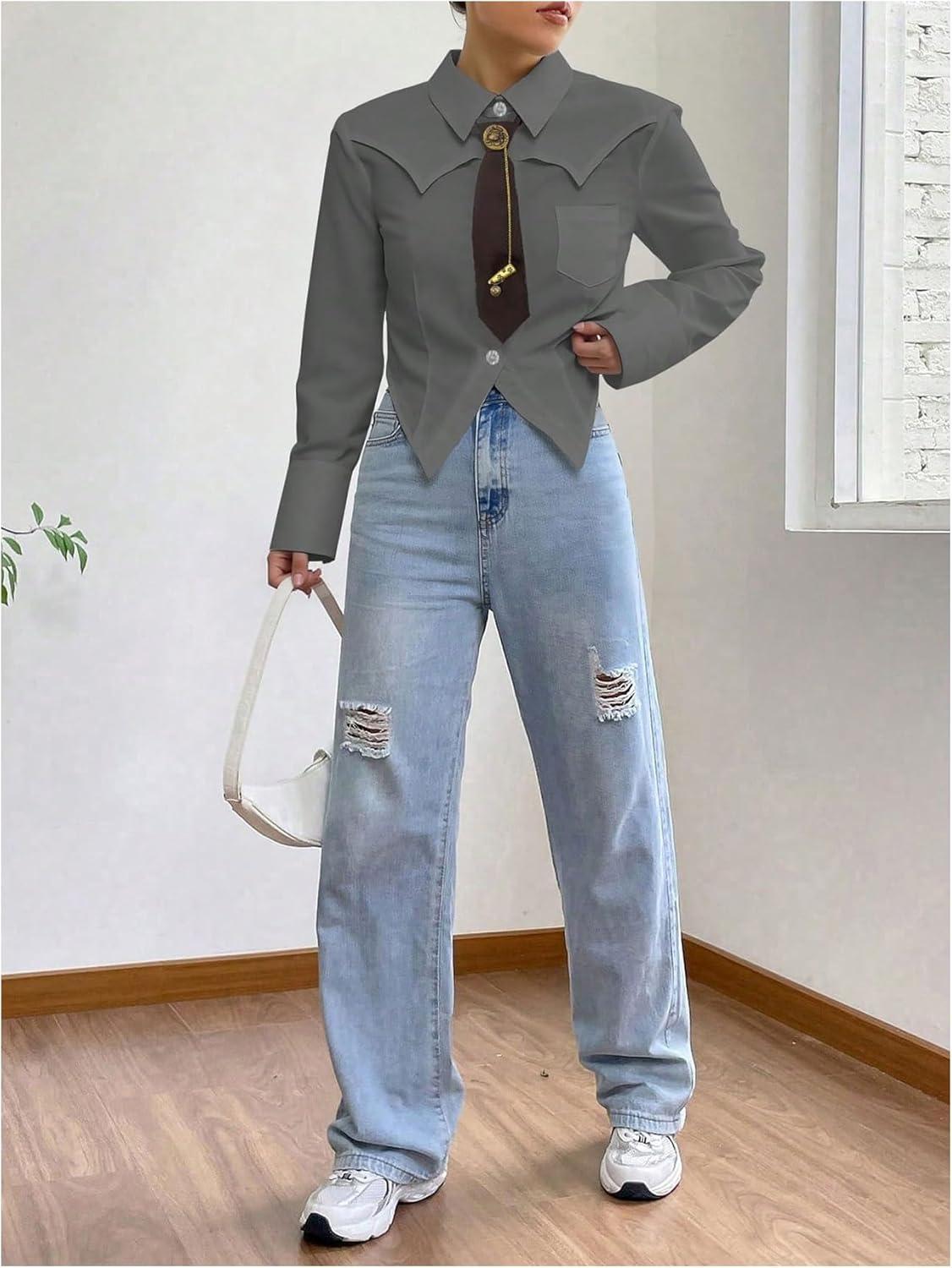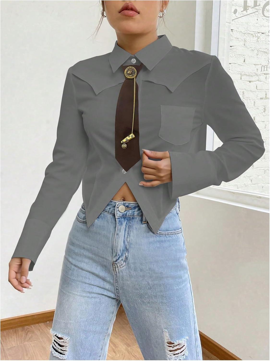 SOLY HUX Women’s Striped Print Button Down College Shirts Long Sleeve Tie Blouse Tops Preppy Clothes(Plain Grey)