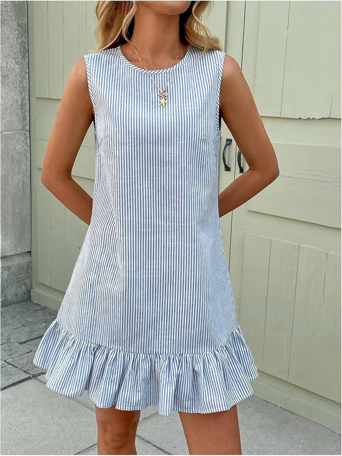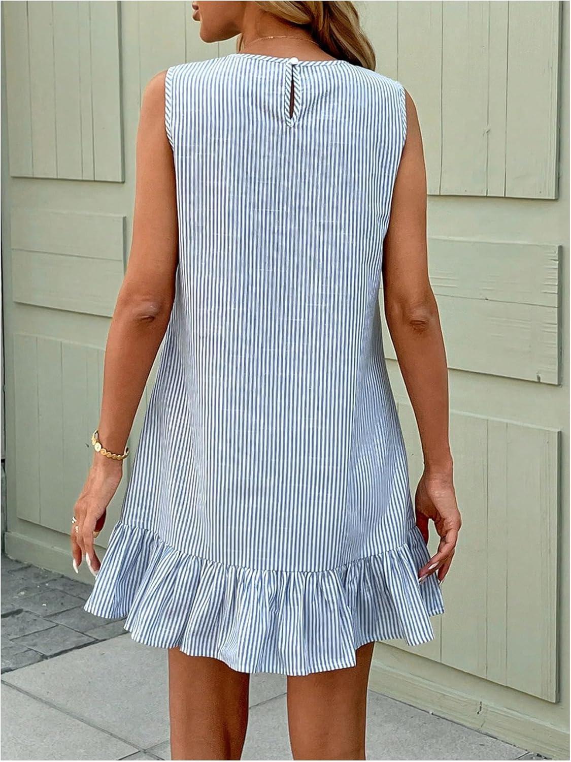 SOLY HUX Women’s Striped Print Sleeveless Ruffle Tunic Dress Summer Swing Flowy Mini Dresses(Dark Blue and White)
