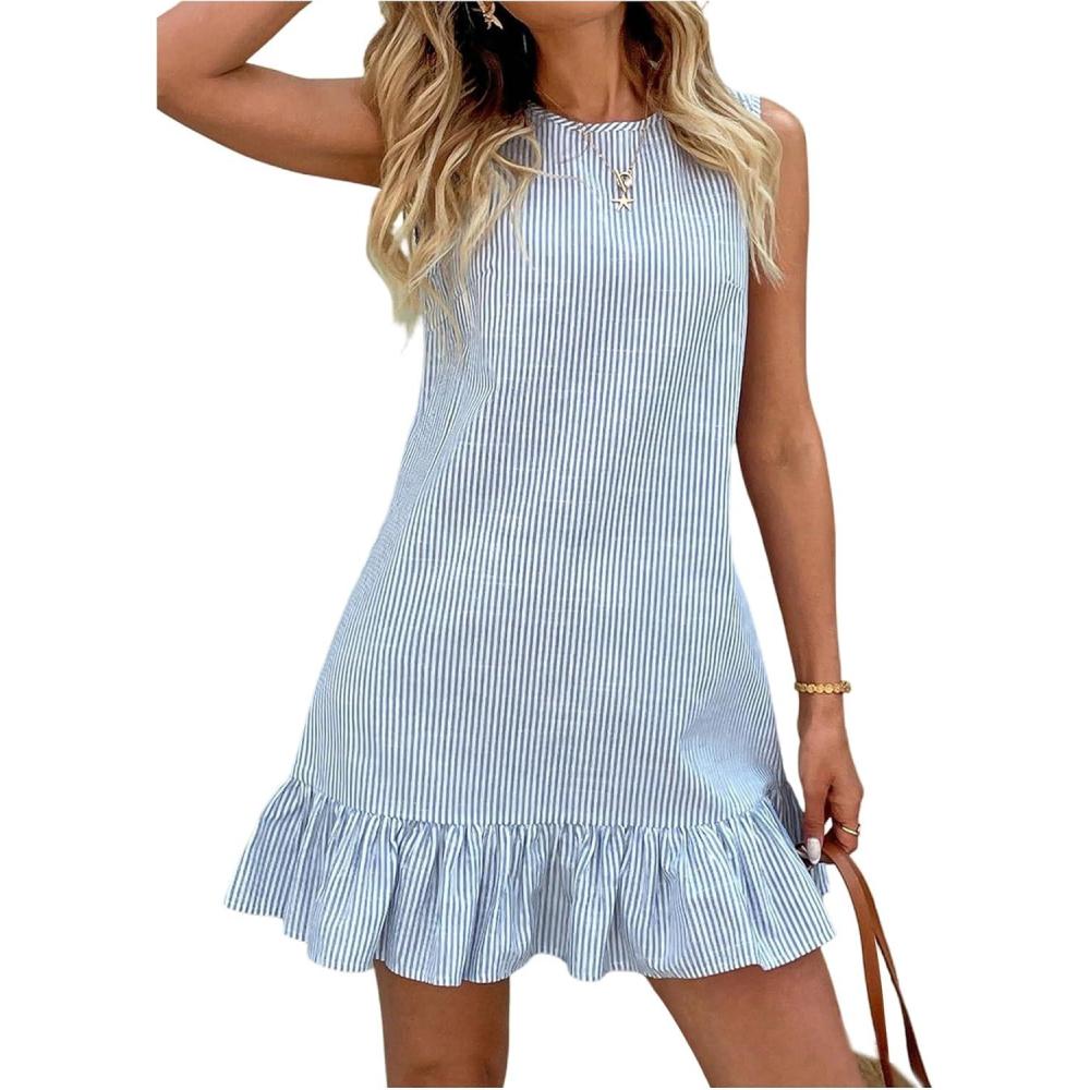 SOLY HUX Women’s Striped Print Sleeveless Ruffle Tunic Dress Summer Swing Flowy Mini Dresses(Blue White Striped)