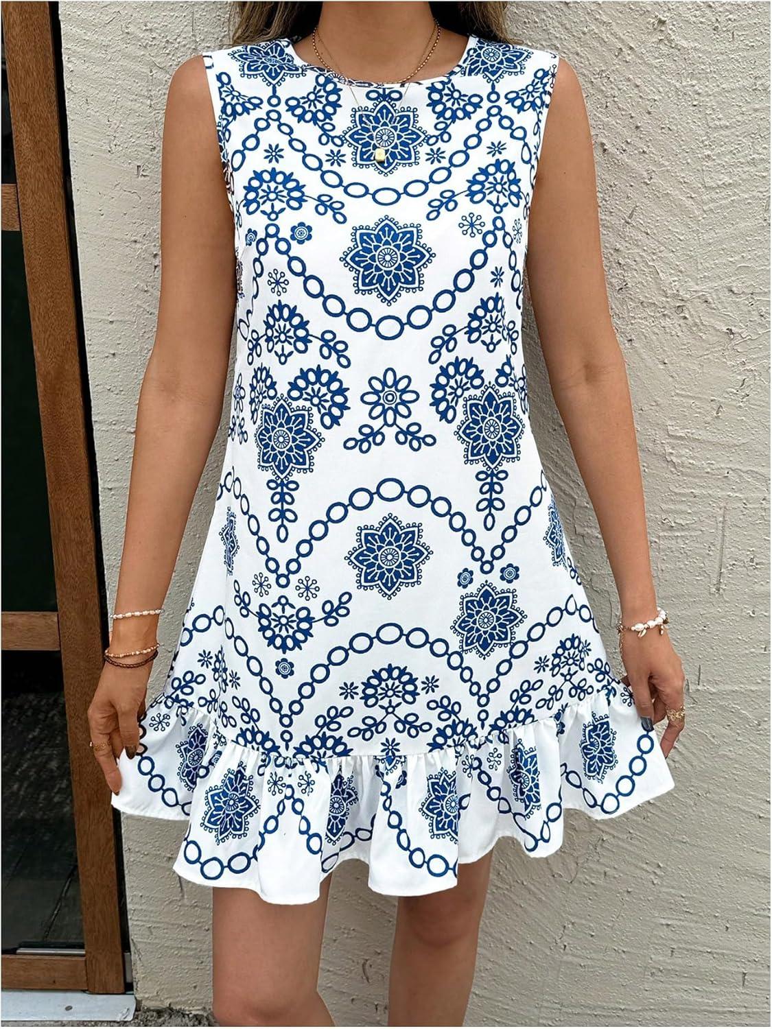 SOLY HUX Women’s Striped Print Sleeveless Ruffle Tunic Dress Summer Swing Flowy Mini Dresses(Blue White Floral)