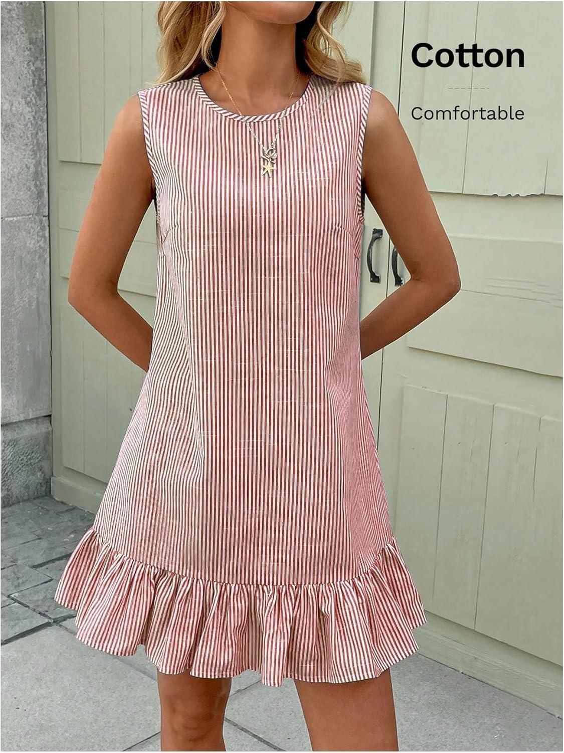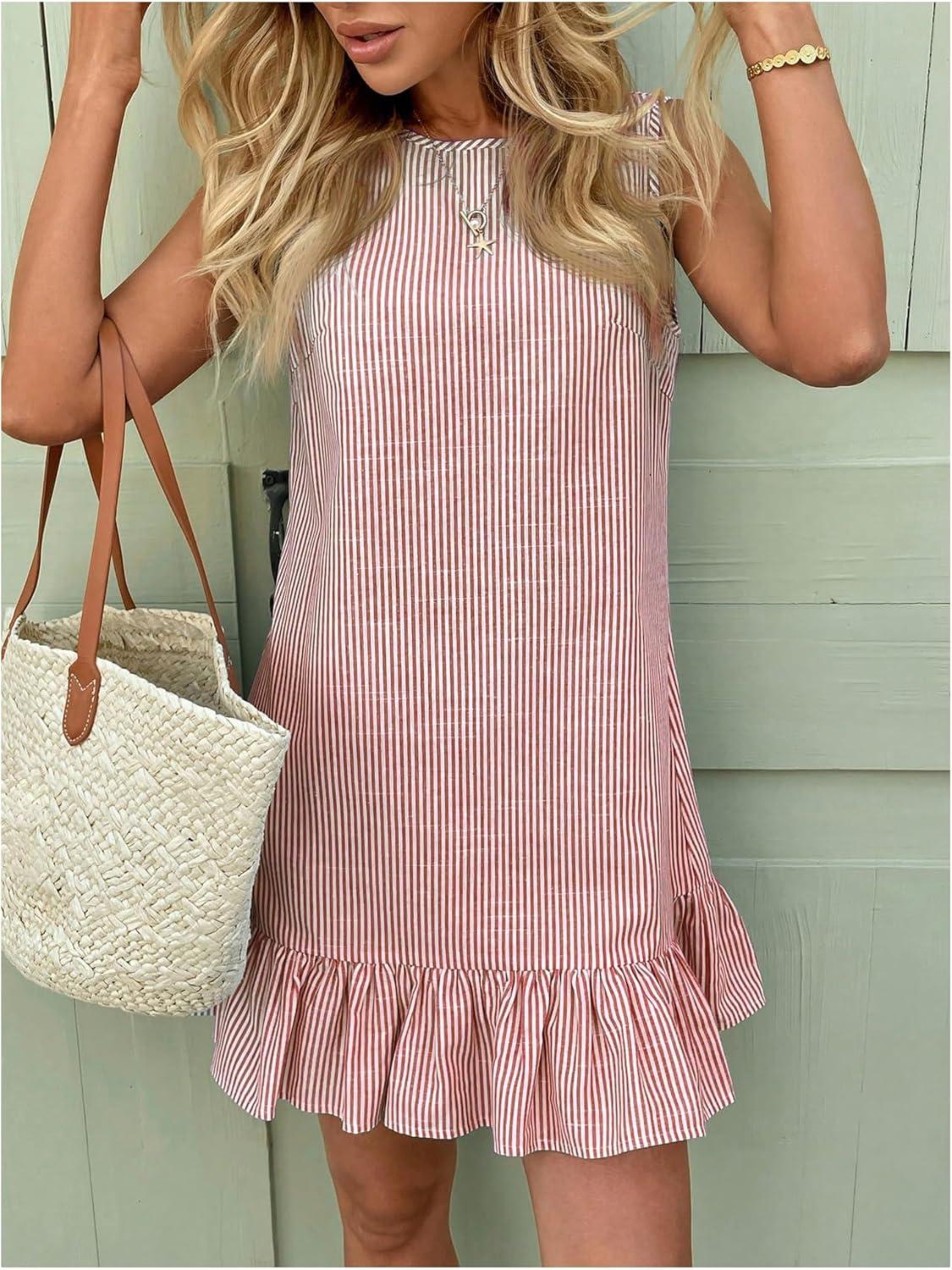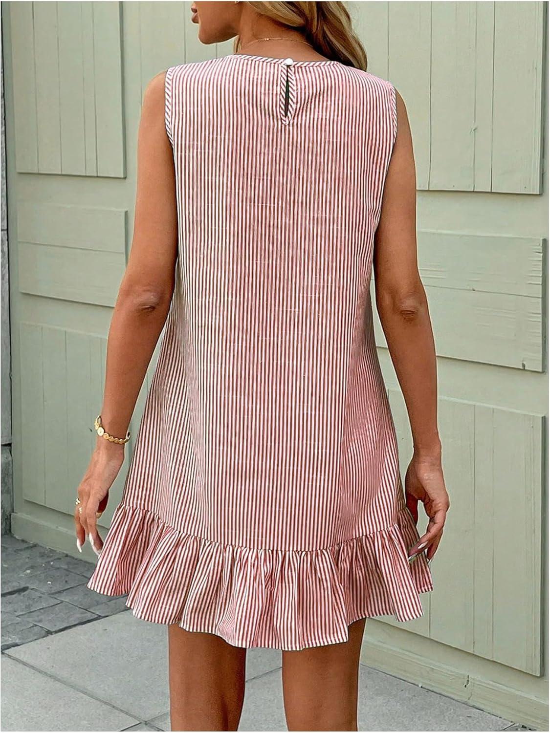SOLY HUX Women’s Striped Print Sleeveless Ruffle Tunic Dress Summer Swing Flowy Mini Dresses(Pink Striped)