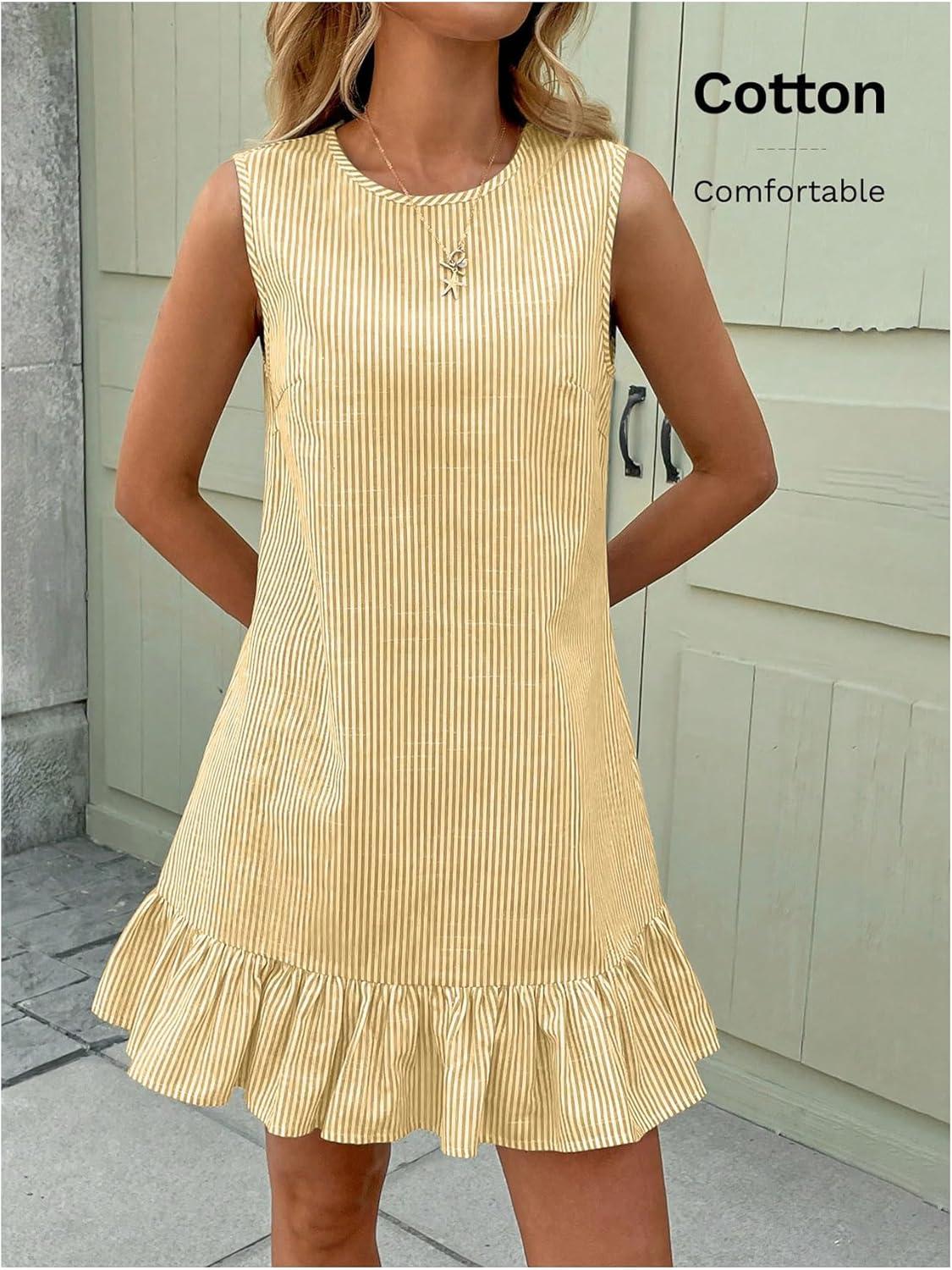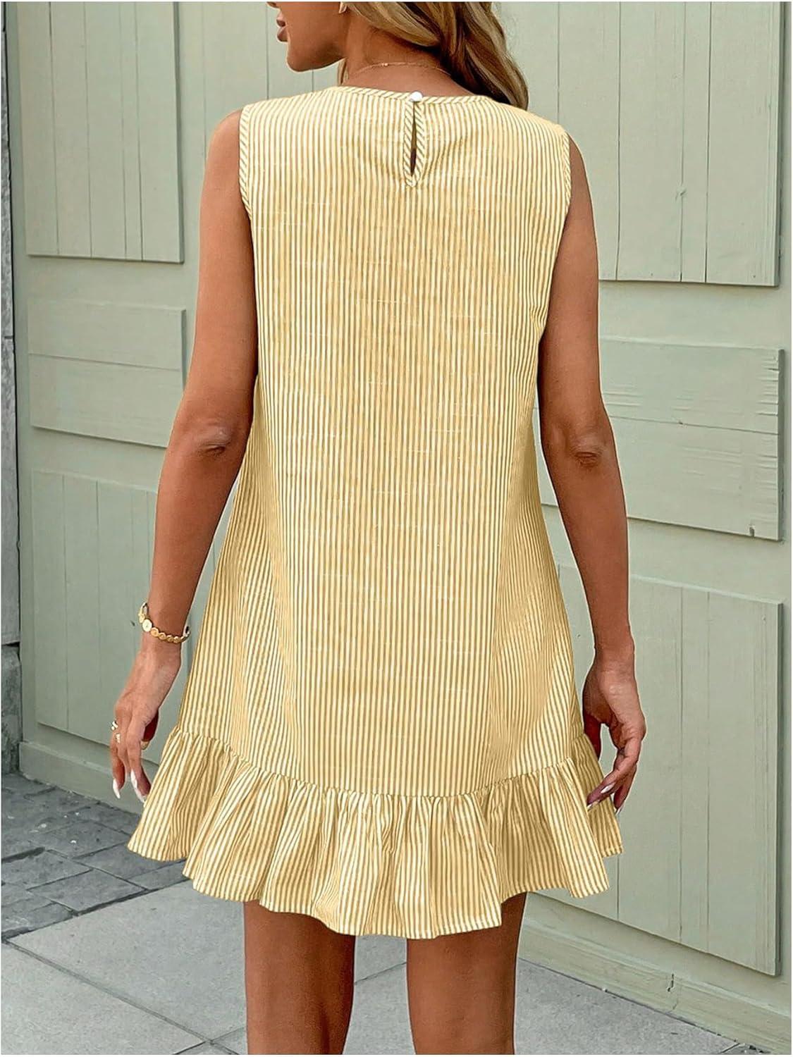 SOLY HUX Women’s Striped Print Sleeveless Ruffle Tunic Dress Summer Swing Flowy Mini Dresses(Yellow and White)