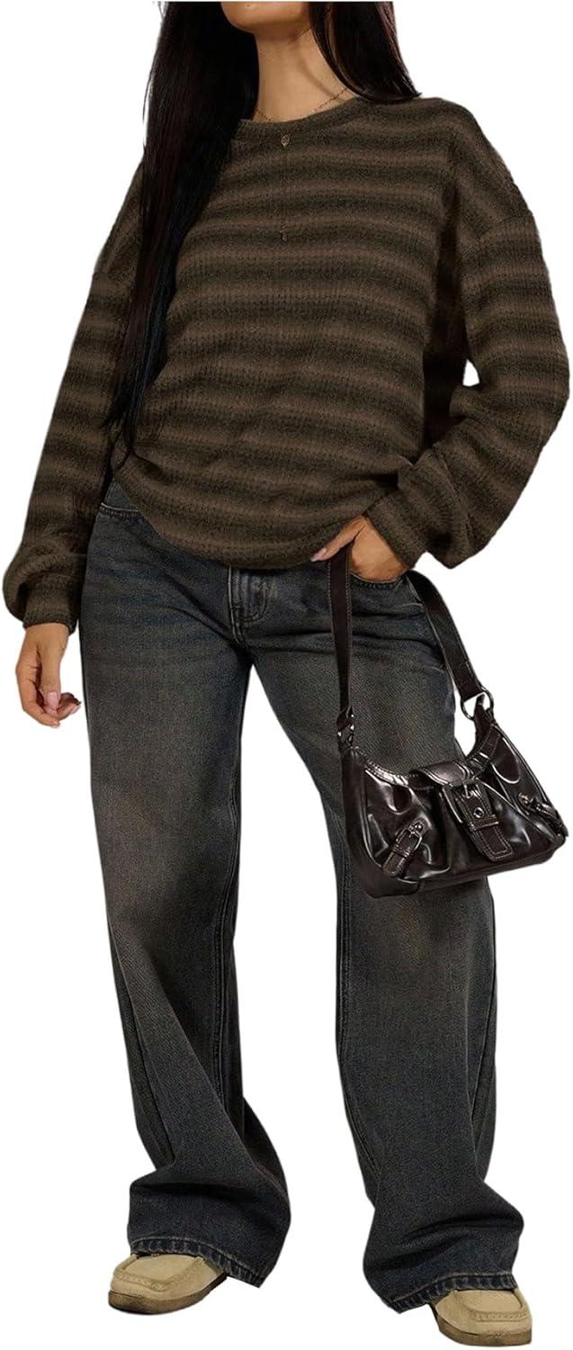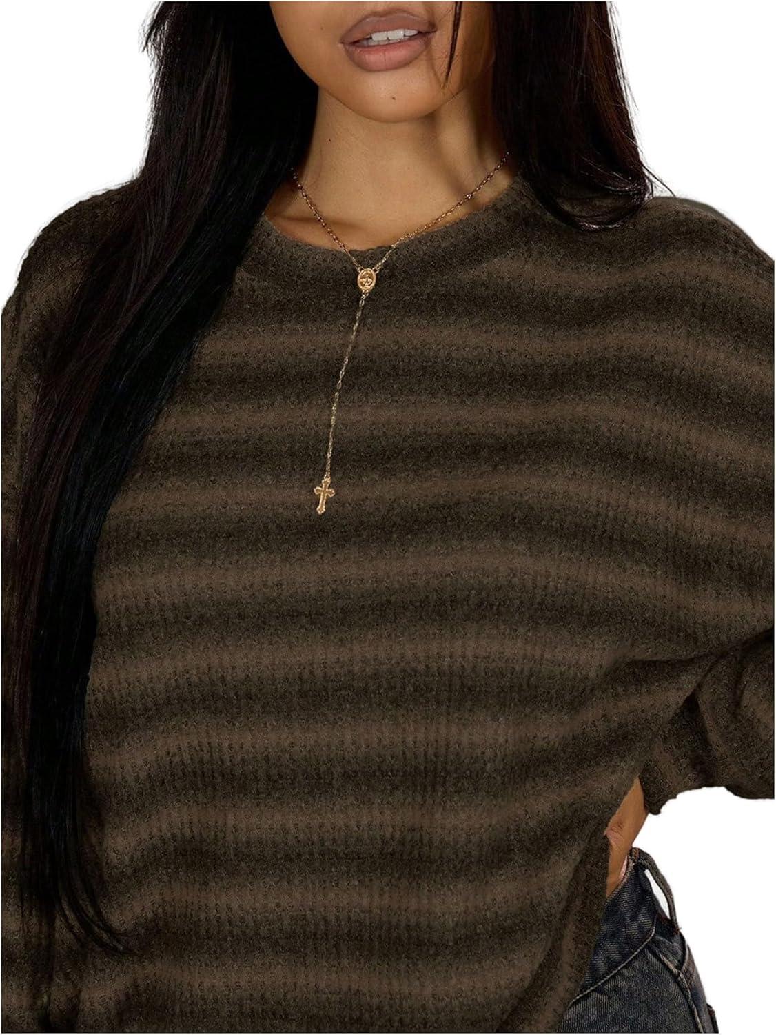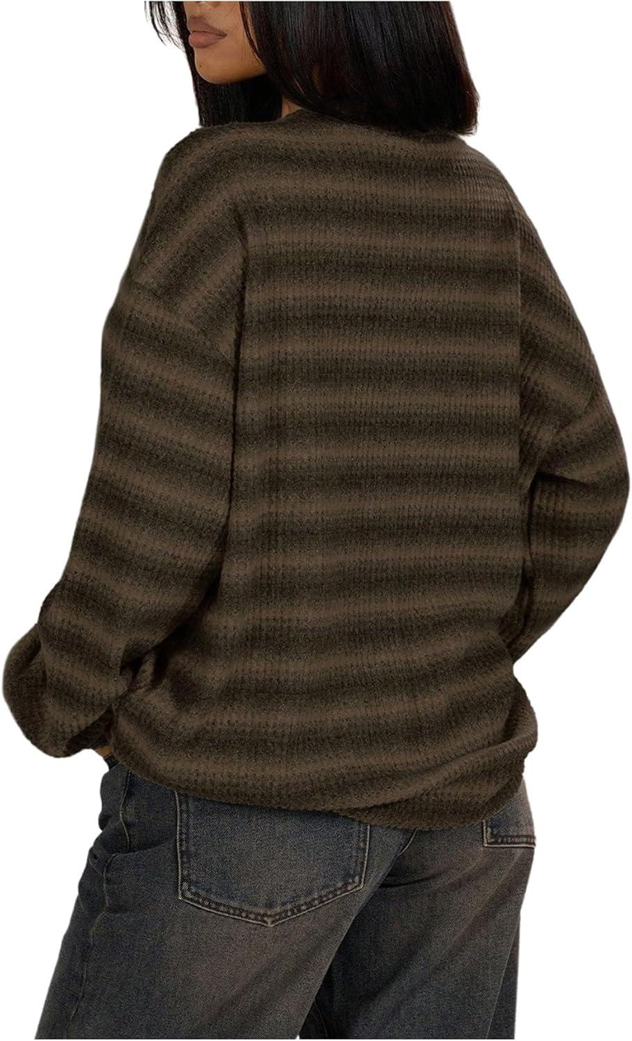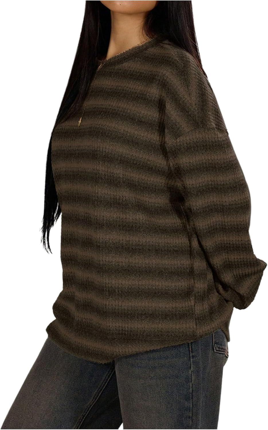 SOLY HUX Women’s Striped Sweater Waffle Knit Tops for Women Long Sleeve Shirts Casual Lightweight Fall Tops(Brown Striped)