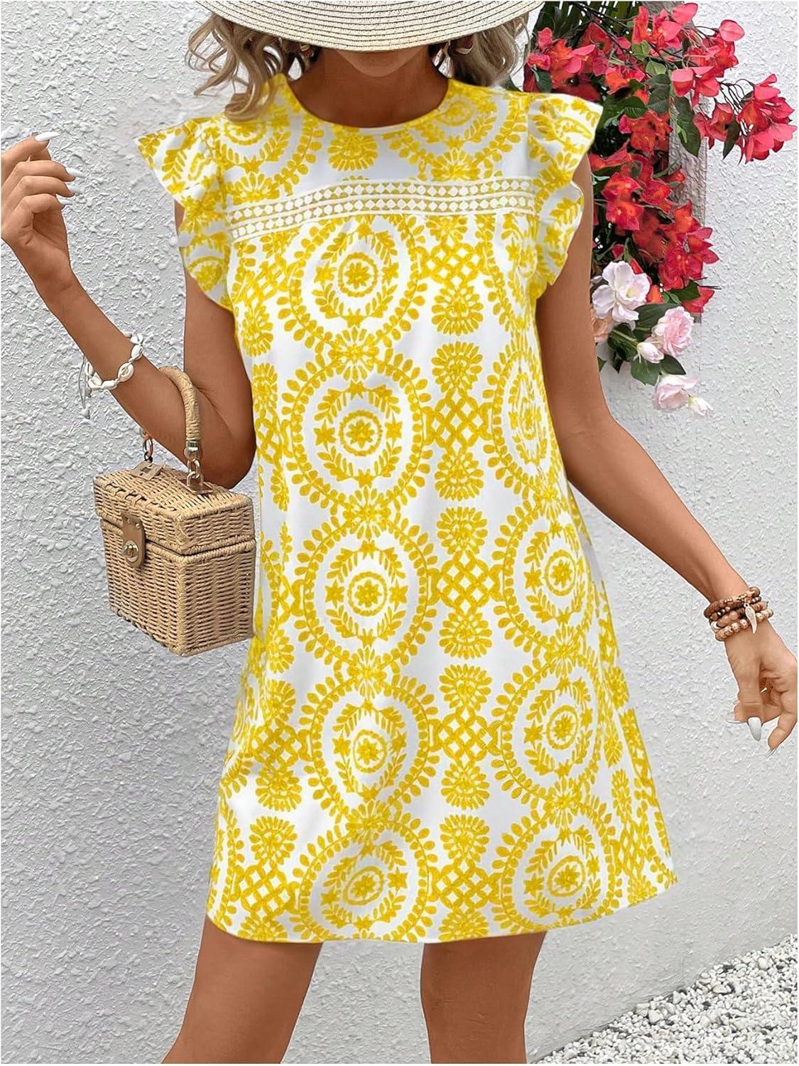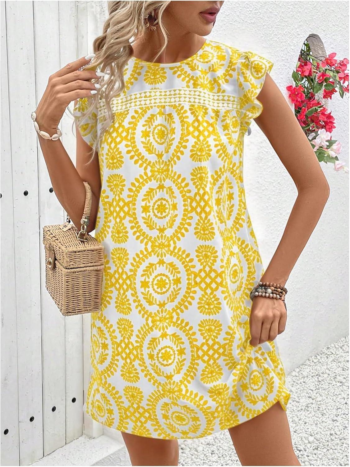 SOLY HUX Women’s Summer Boho Tunic Dress Ruffle Cap Sleeve Crewneck Vacation Beach Short Dresses(Yellow Print)