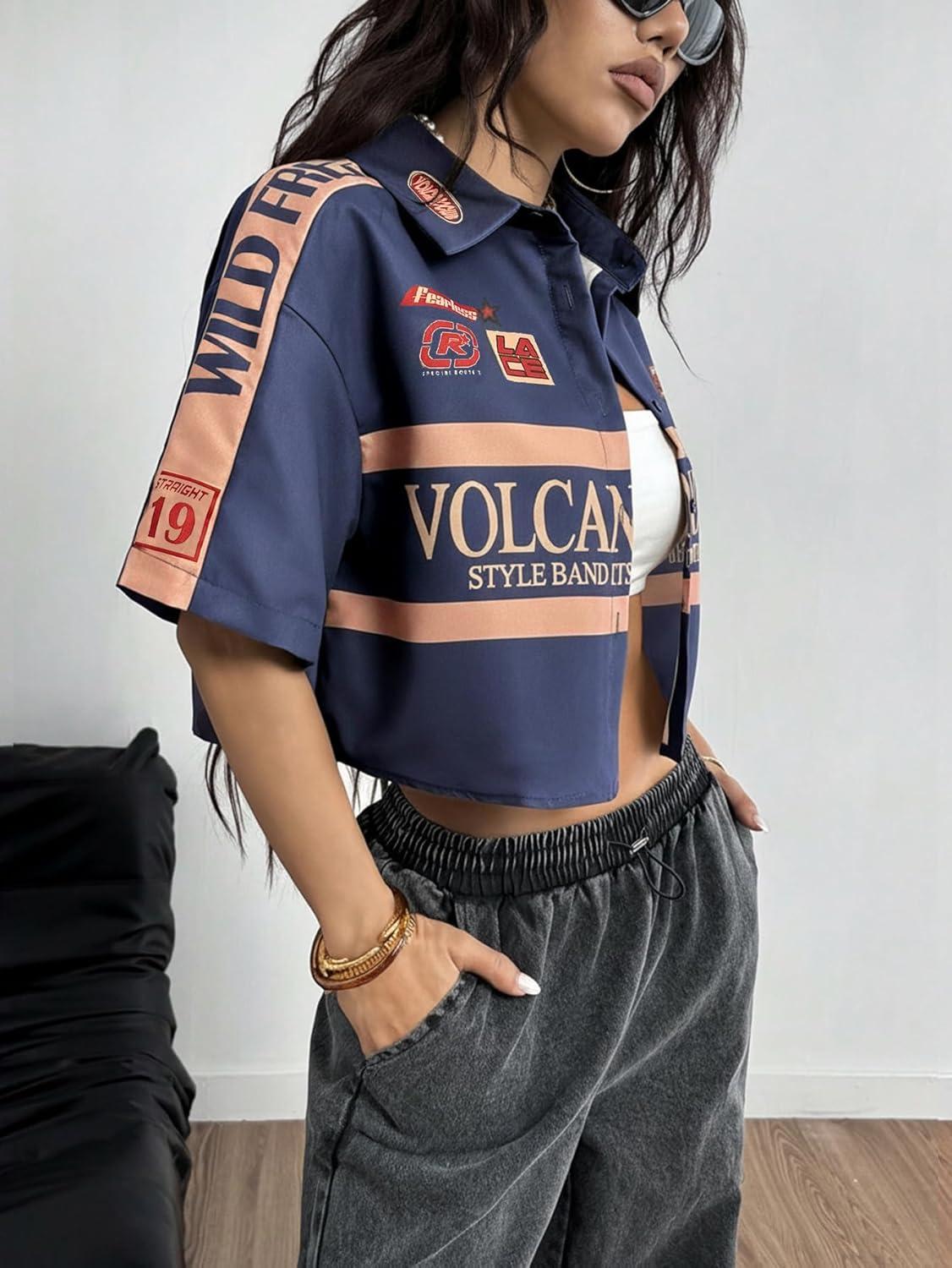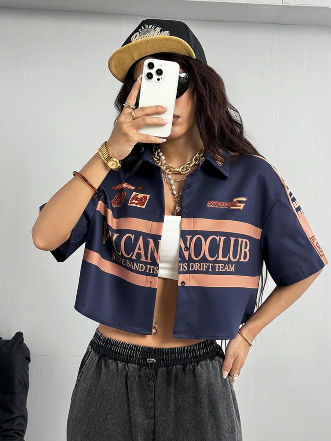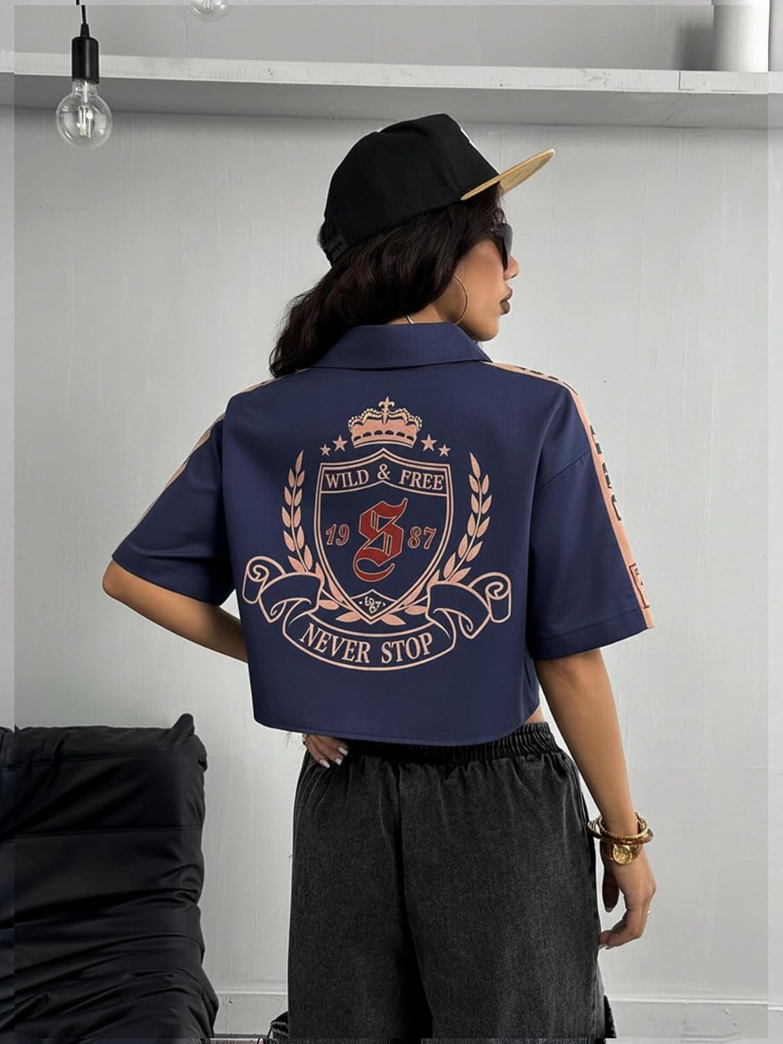 SOLY HUX Women’s Summer Button Down Vintage Shirt Short Sleeve Graphic Crop Tops Motorcycle Blouse(Dark Blue)