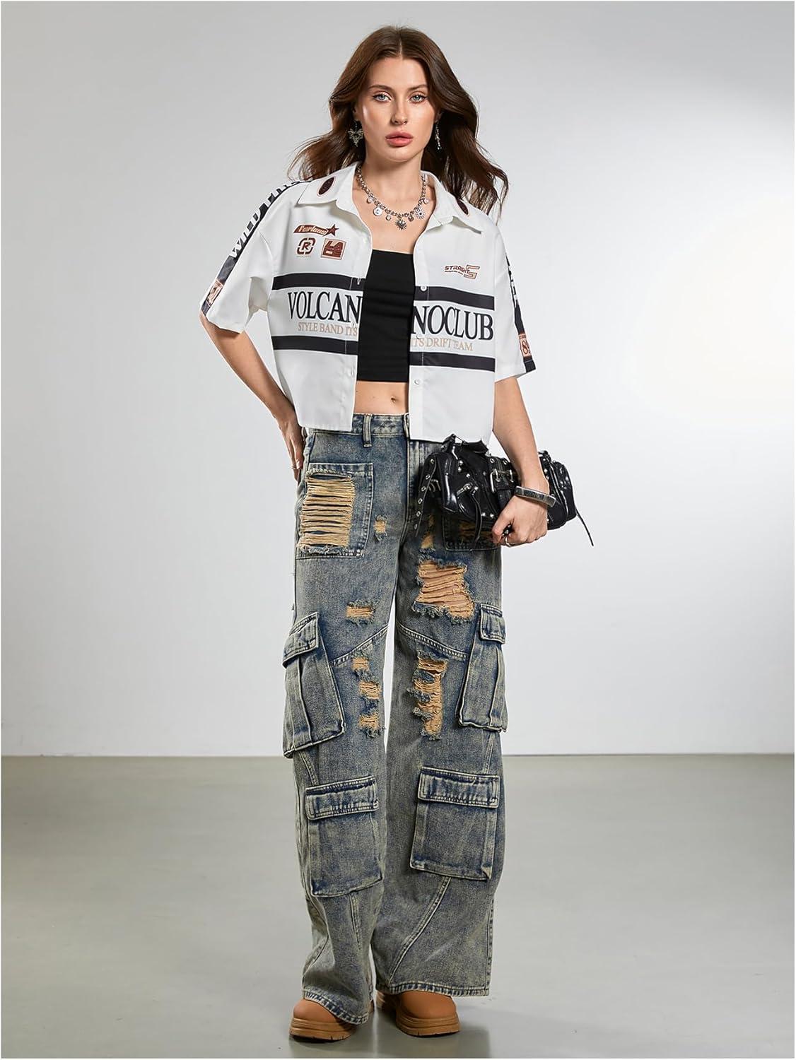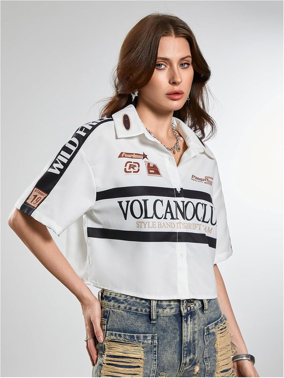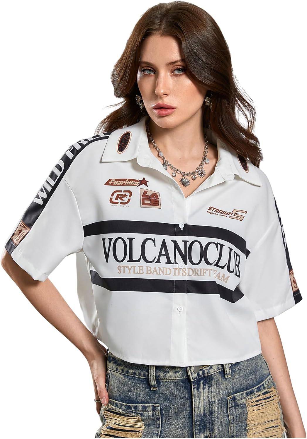 SOLY HUX Women’s Summer Button Down Vintage Shirt Short Sleeve Graphic Crop Tops Motorcycle Blouse(White Graphic)
