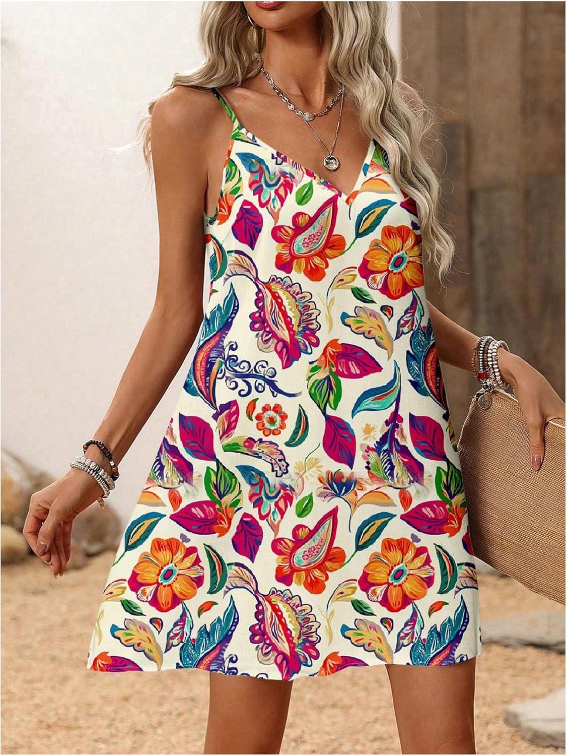 SOLY HUX Women’s Summer Dress Floral Print V Neck Spaghetti Strap Cami Short Dresses Vacation Sundress(Multi Floral Print)