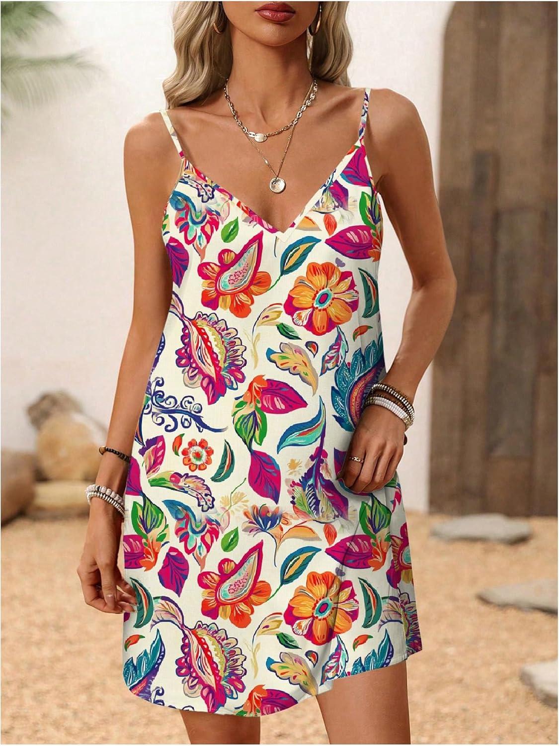 SOLY HUX Women’s Summer Dress Floral Print V Neck Spaghetti Strap Cami Short Dresses Vacation Sundress(Multicoloured Floral)