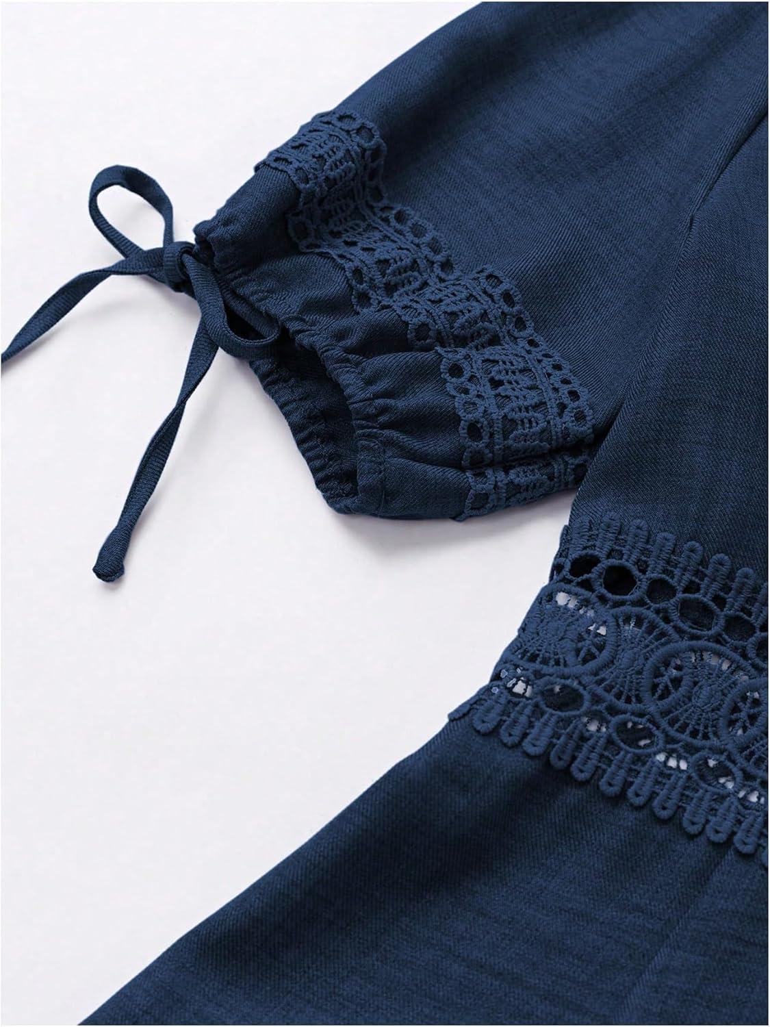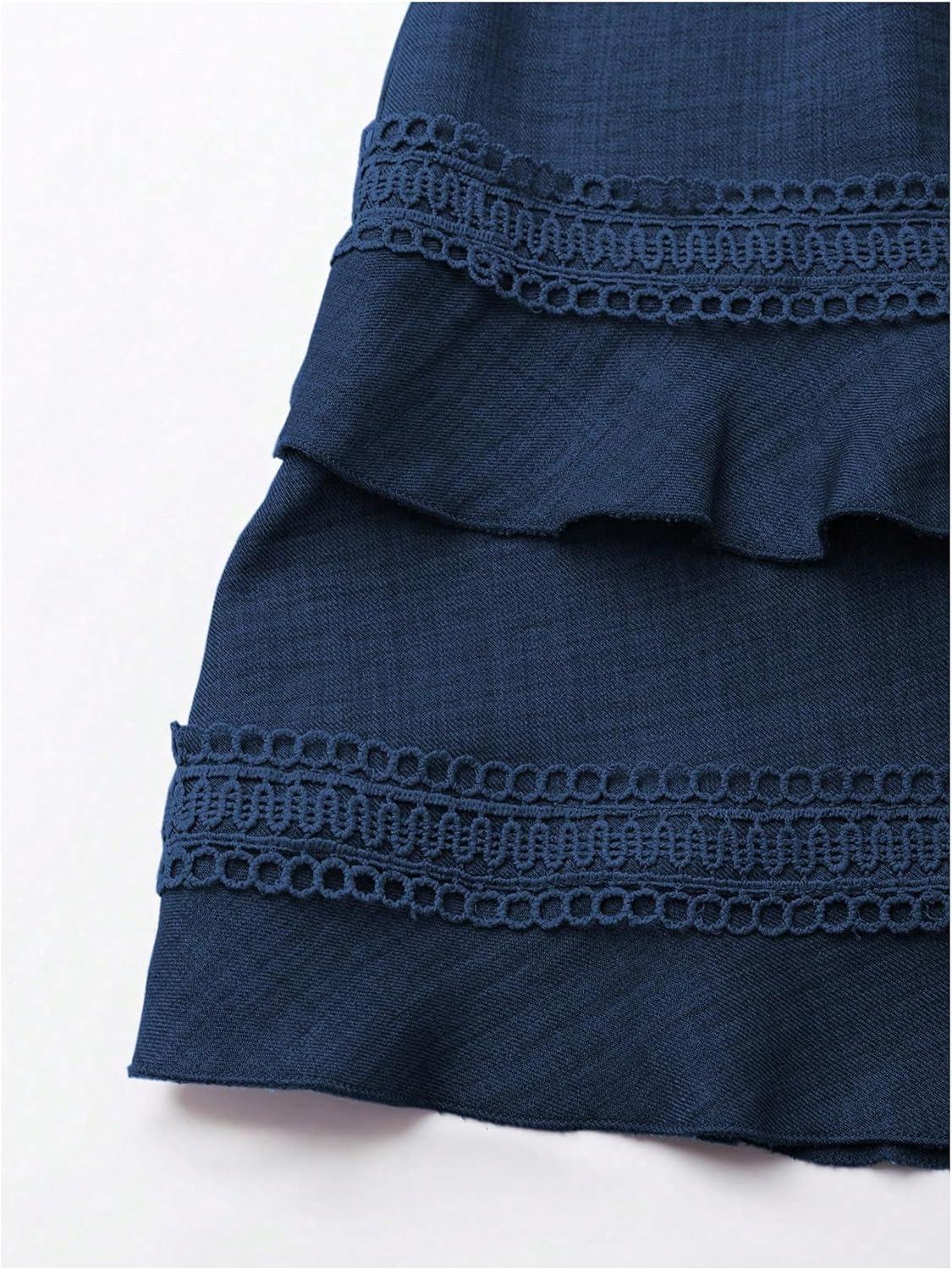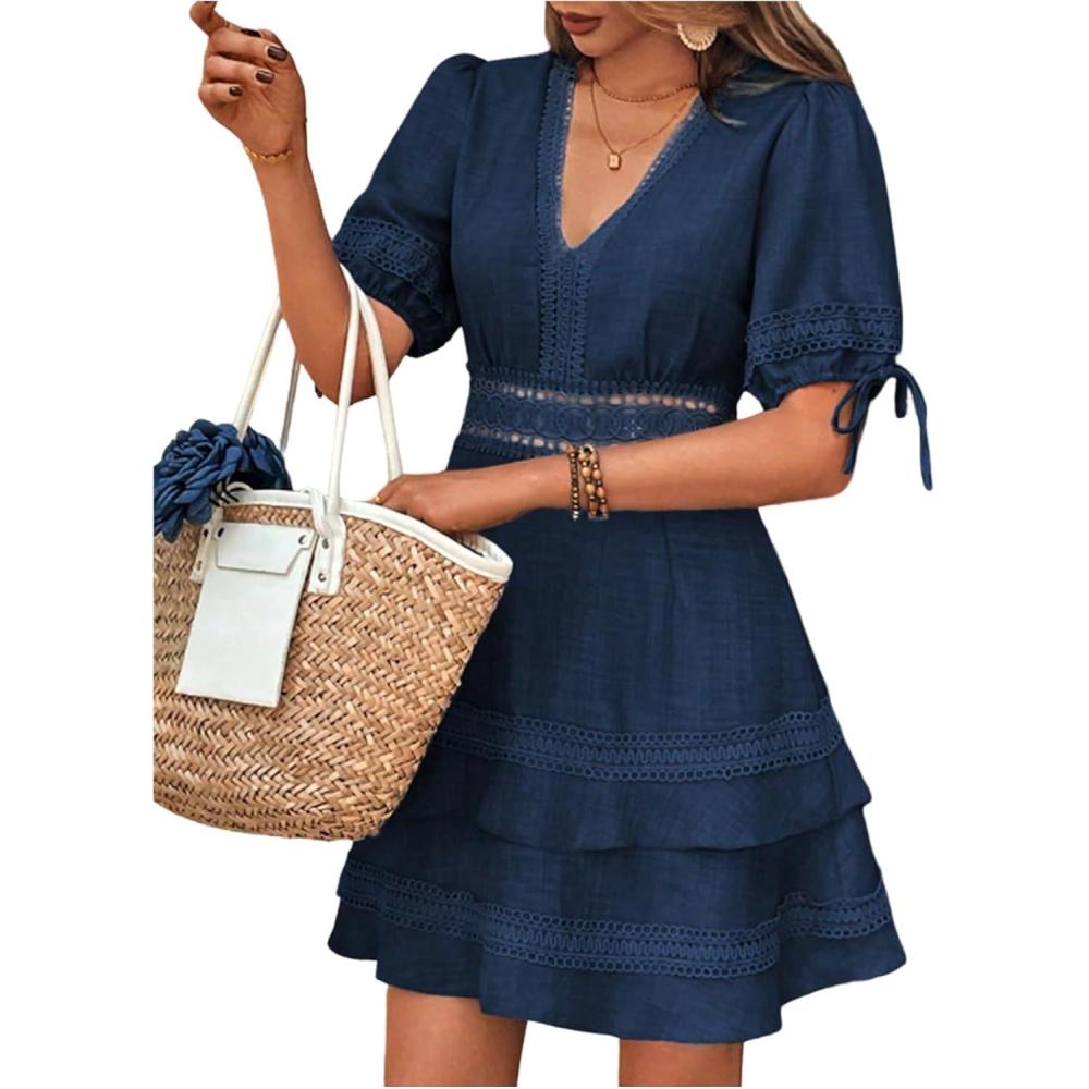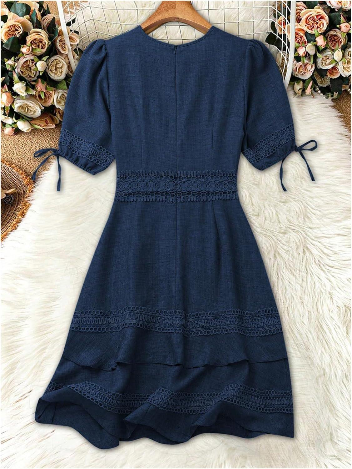 SOLY HUX Women’s Summer Dress Hollow Out Lace V Neck Puff Short Sleeve A Line Layered Short Dresses(Plain Dark Blue)