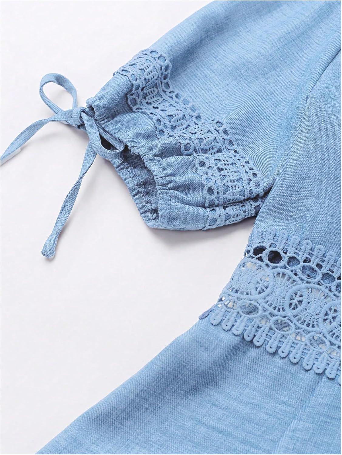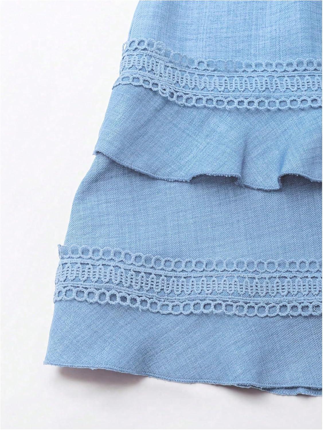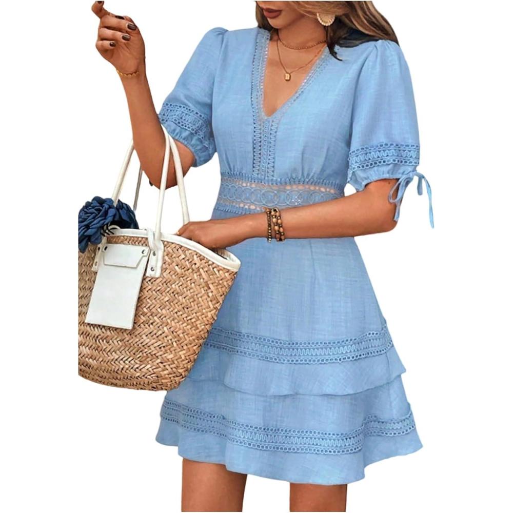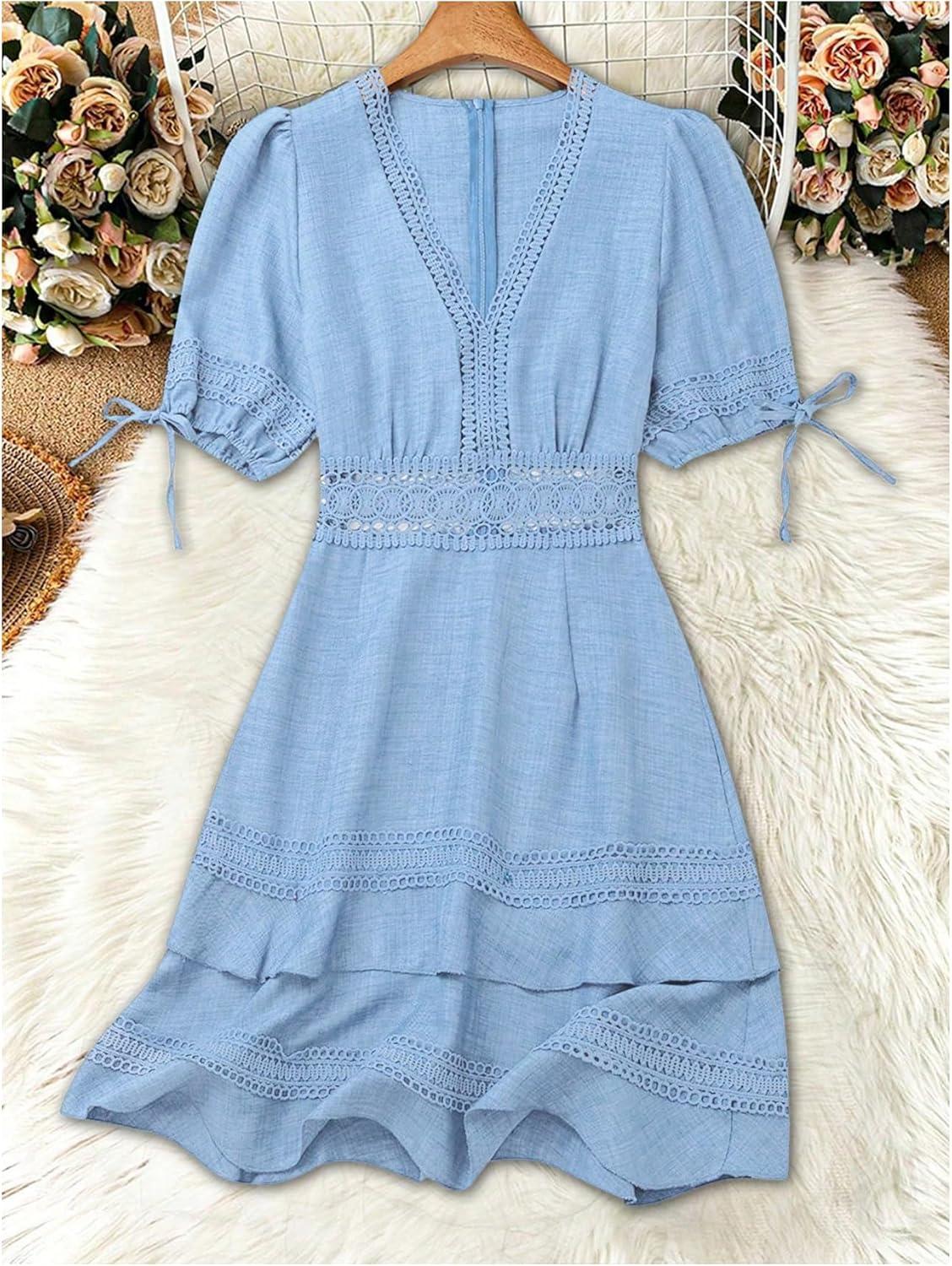 SOLY HUX Women’s Summer Dress Hollow Out Lace V Neck Puff Short Sleeve A Line Layered Short Dresses(Pure Light Blue)