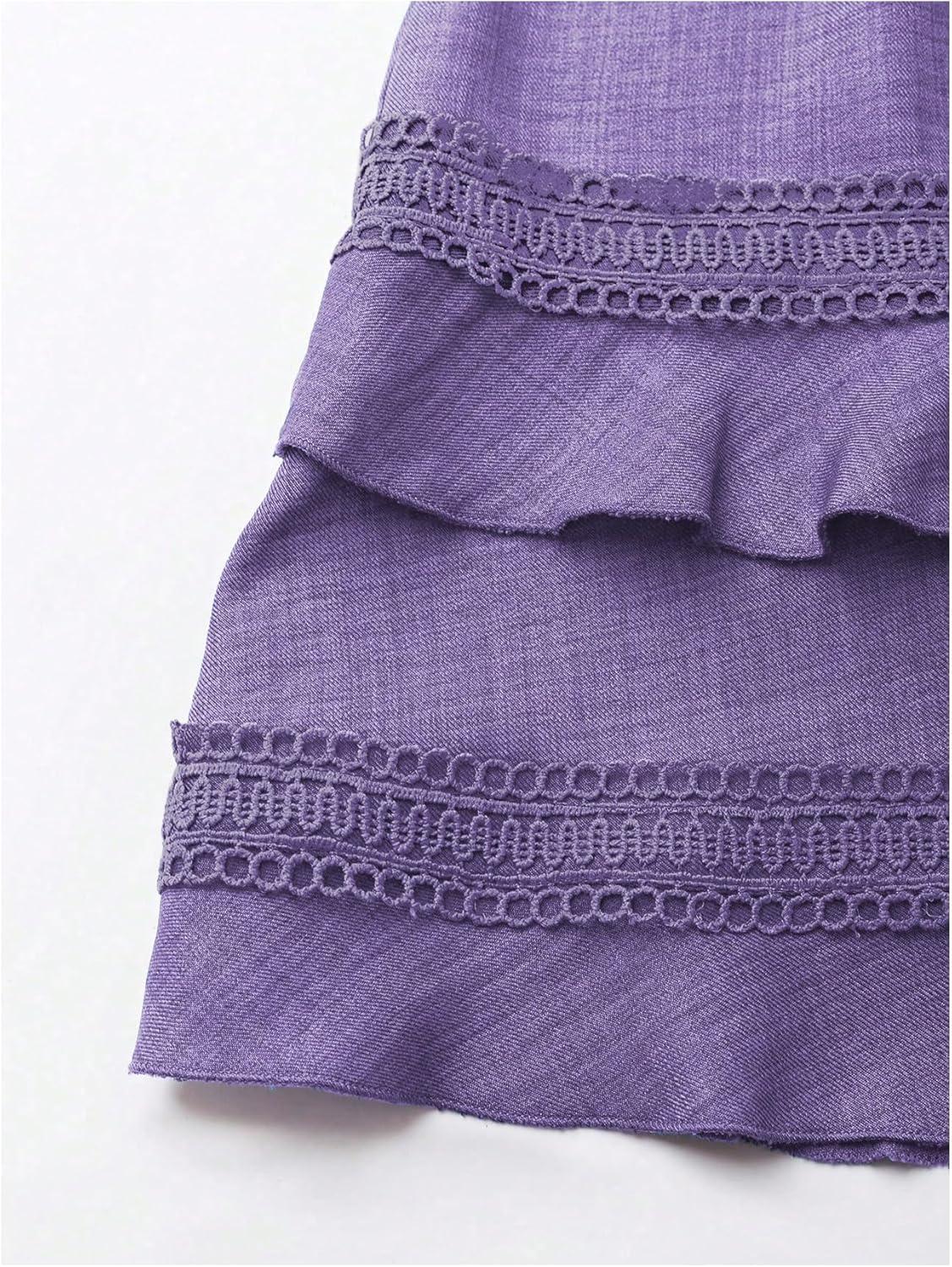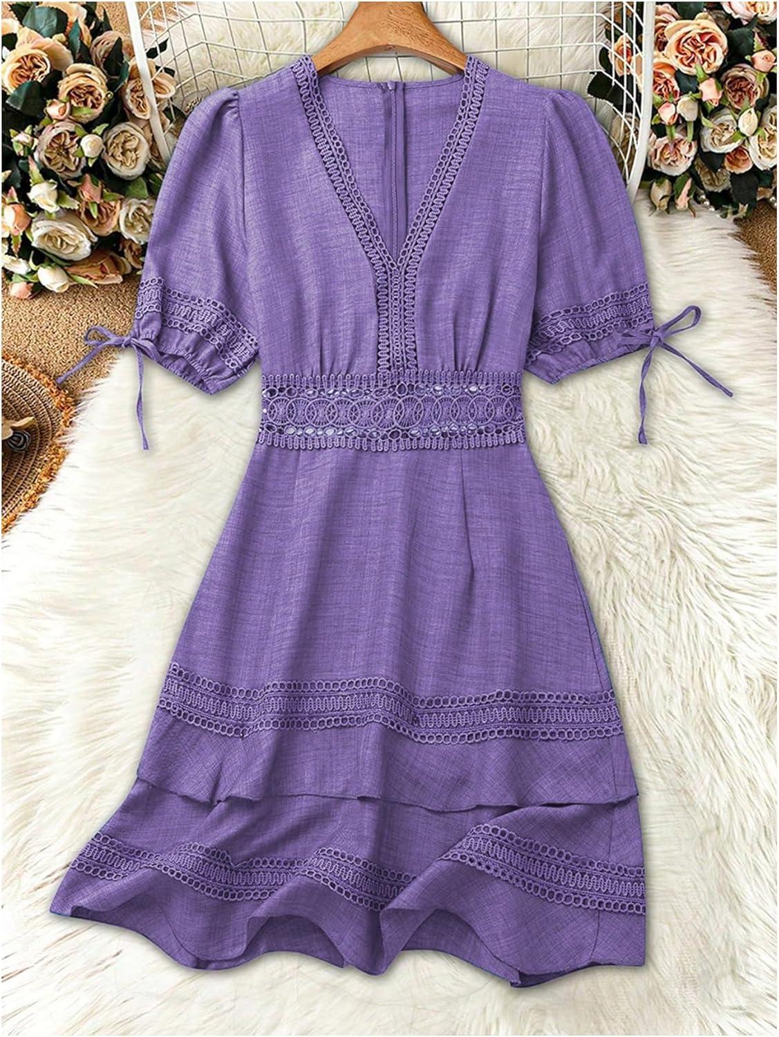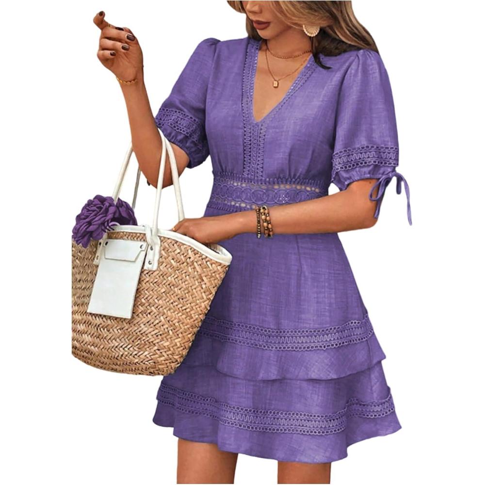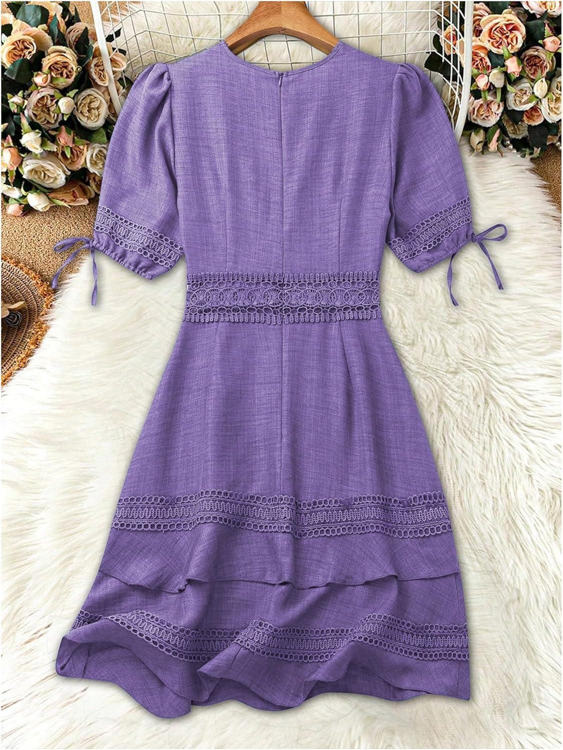 SOLY HUX Women’s Summer Dress Hollow Out Lace V Neck Puff Short Sleeve A Line Layered Short Dresses(Pure Purple)