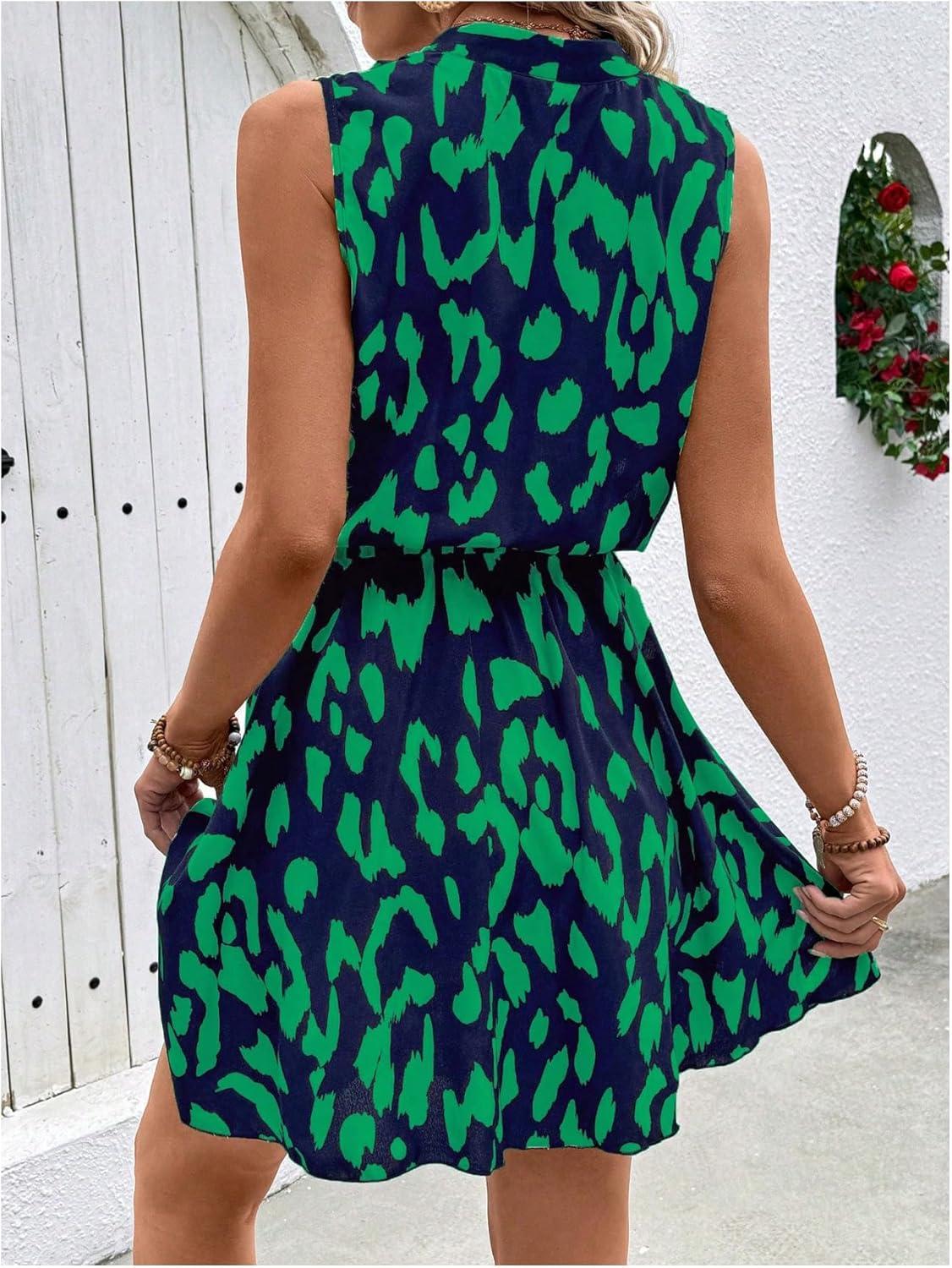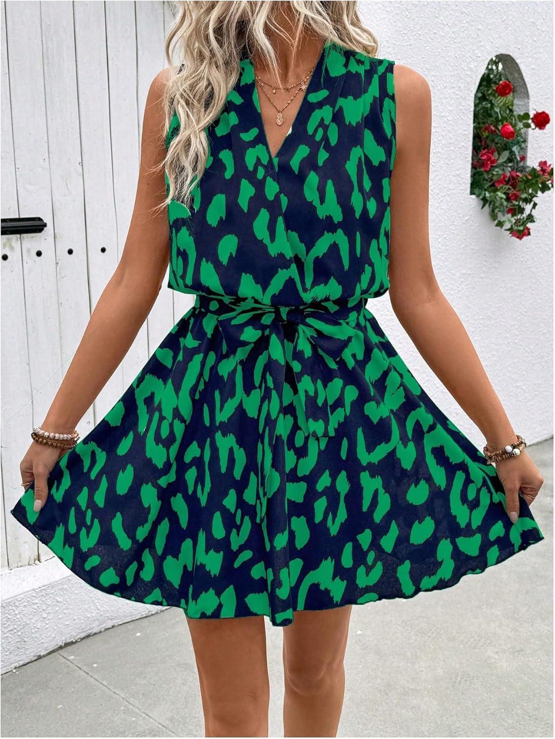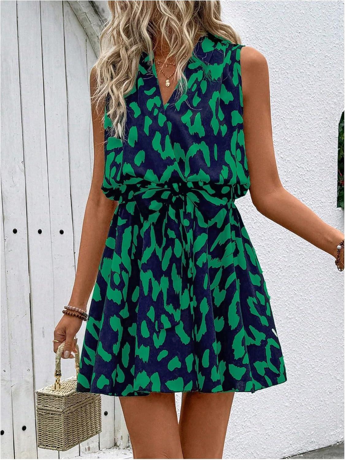 SOLY HUX Women’s Summer Dress Printed Sleeveless V Neck Wrap A Line Flowy Belted Vacation Short Dresses(Green Printed)