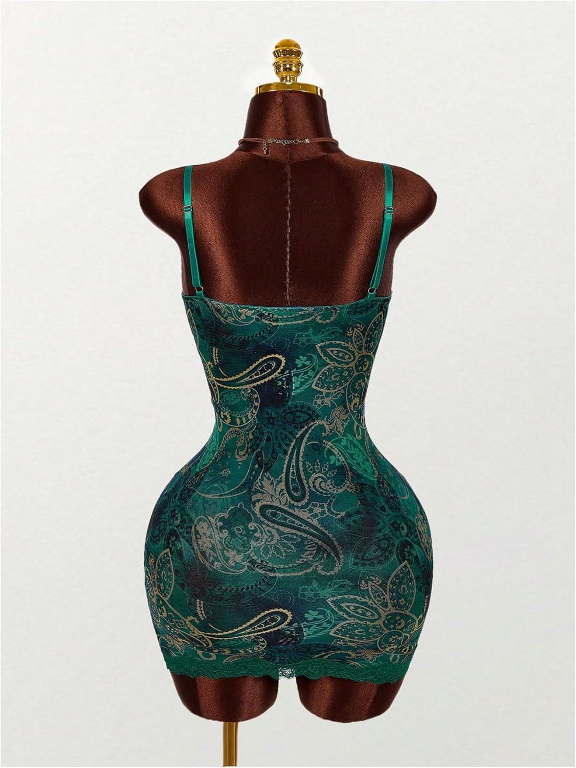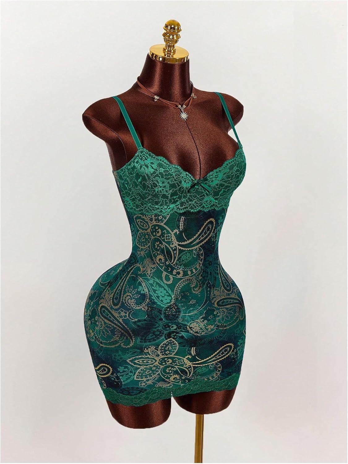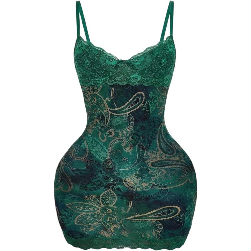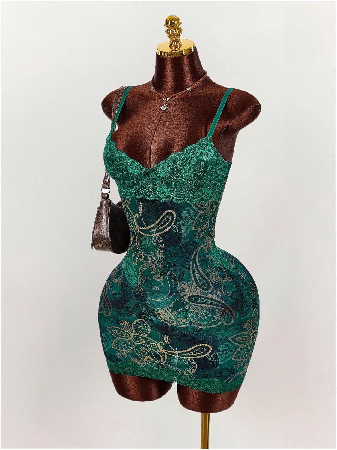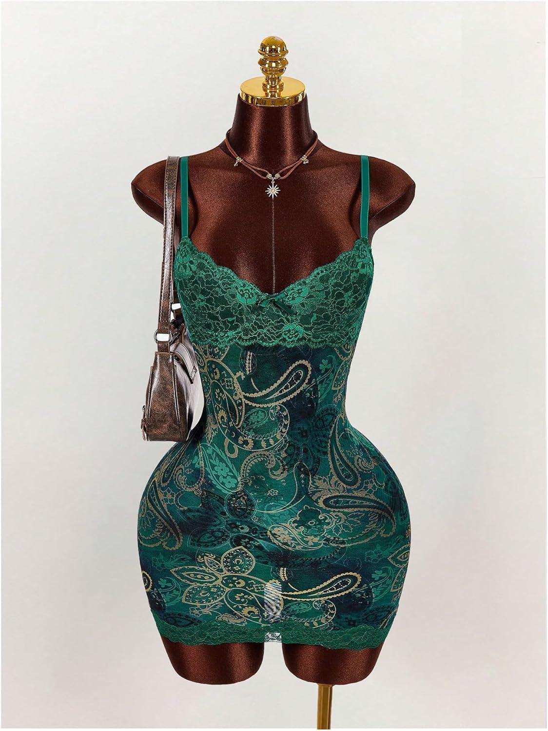 SOLY HUX Women’s Summer Floral Lace Trim Mini Dress Spaghetti Strap Bodycon Party Cami Dresses(Green Paisley)
