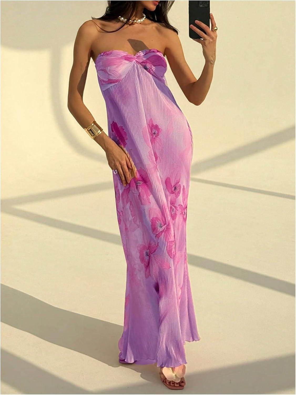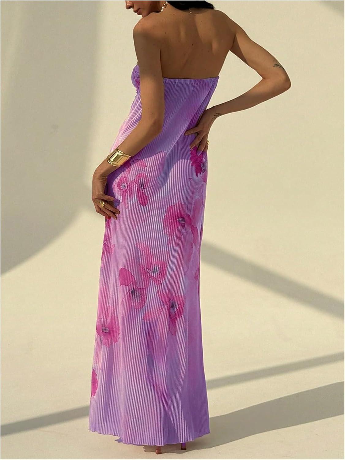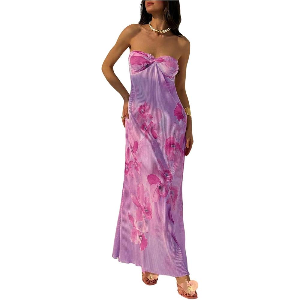 SOLY HUX Women’s Summer Floral Tube Dress Twist Front Strapless Vacation Beach Dresses Maxi Dress(Multi Purple)