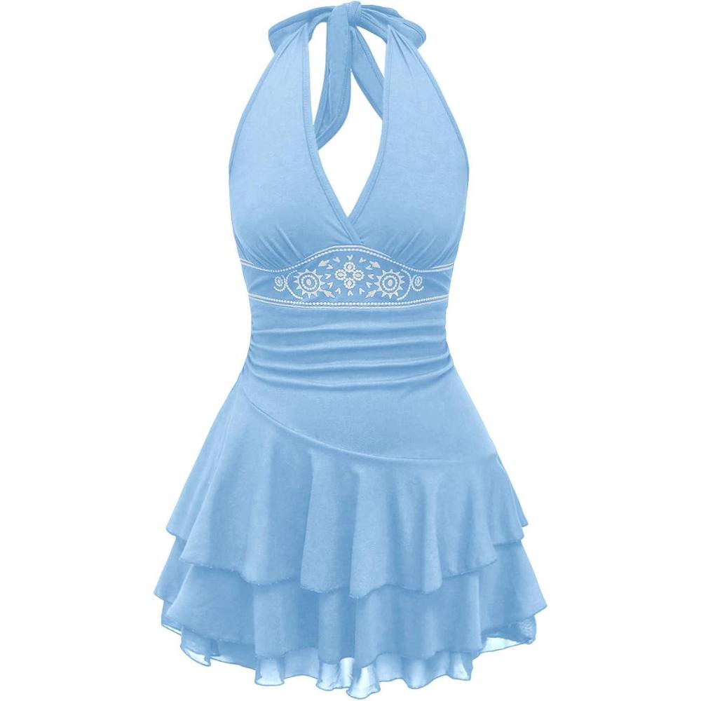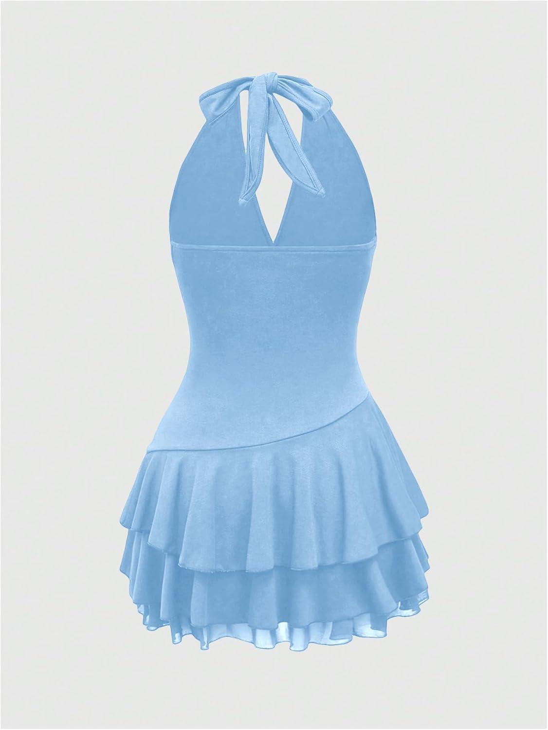 SOLY HUX Women’s Summer Halter Backless Mini Dress Flowy Sleeveless V Neck Tie Back A Line Western Casual Sun Dresses(Light Blue)