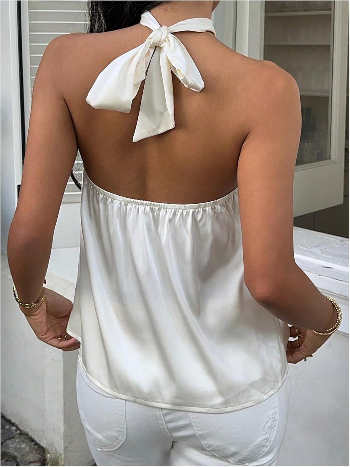 SOLY HUX Women’s Summer Halter Tops Silk Satin Tie Backless Sleeveless Going Out Top(Plain White)