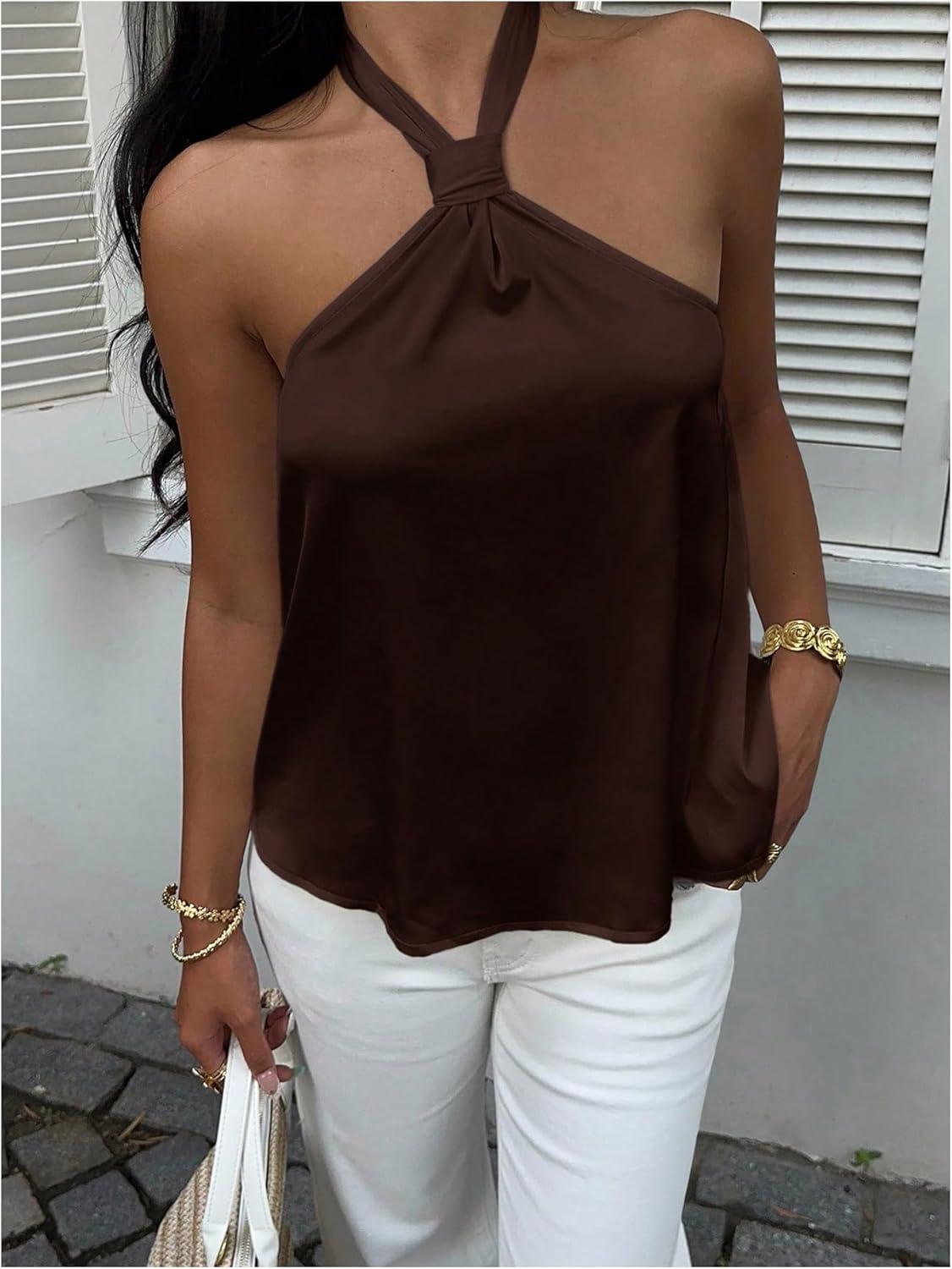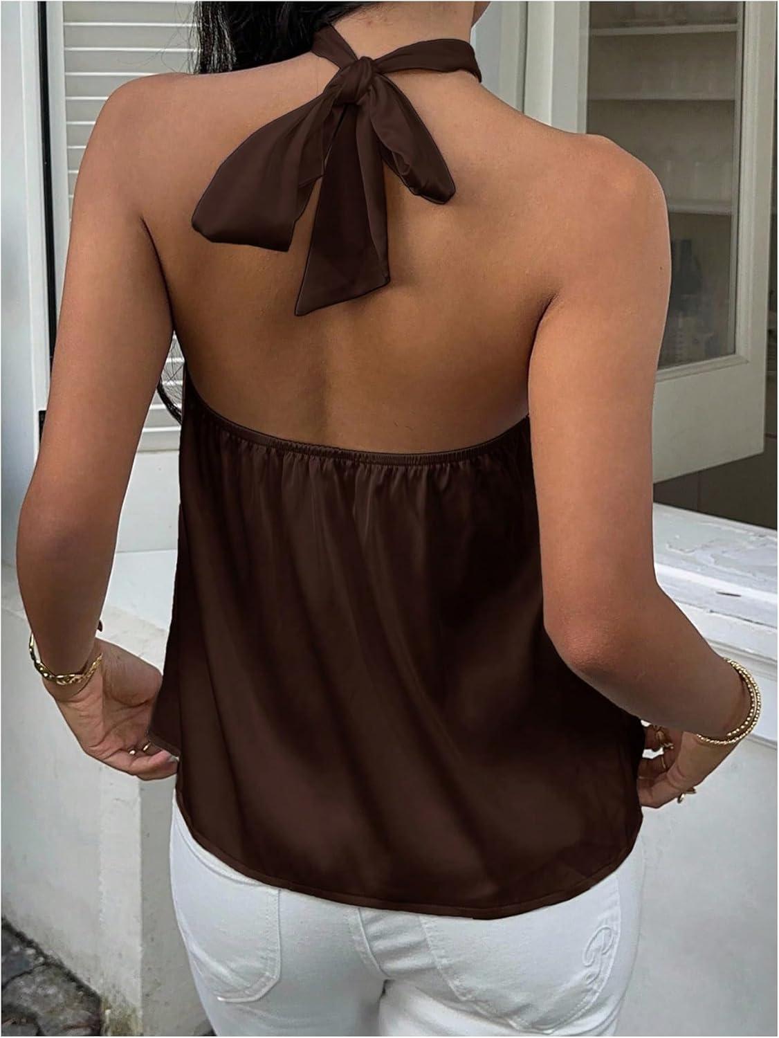 SOLY HUX Women’s Summer Halter Tops Silk Satin Tie Backless Sleeveless Going Out Top(Pure Chocolate Brown)