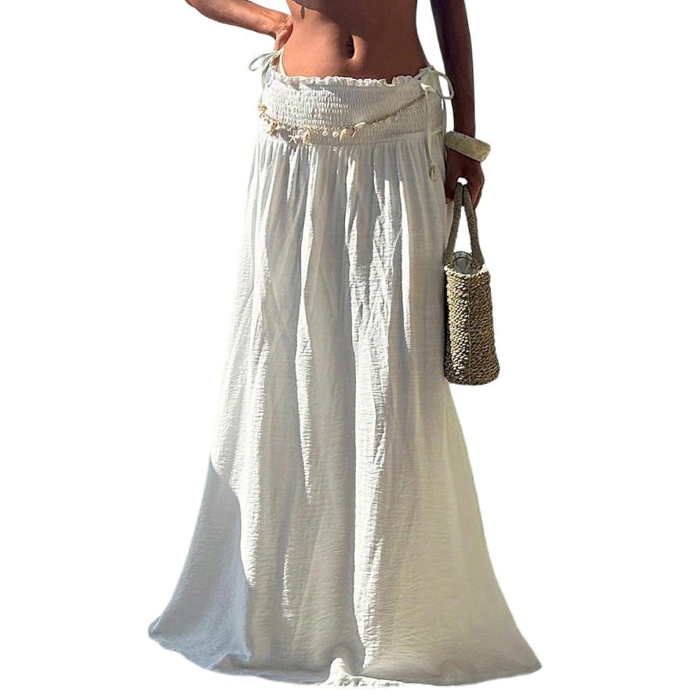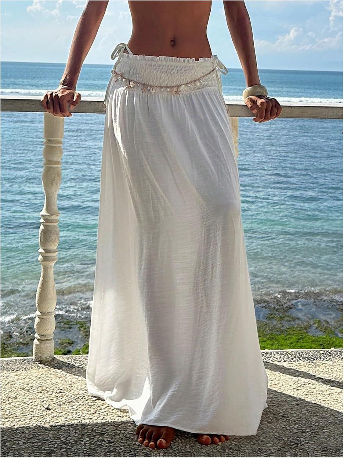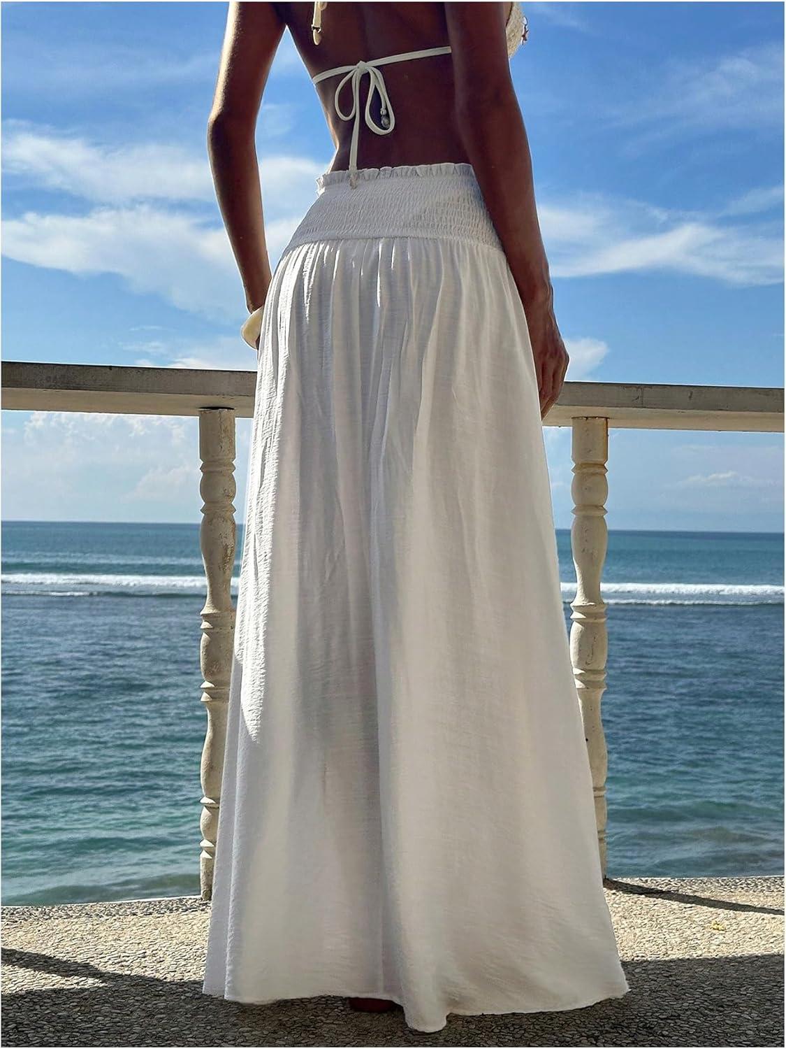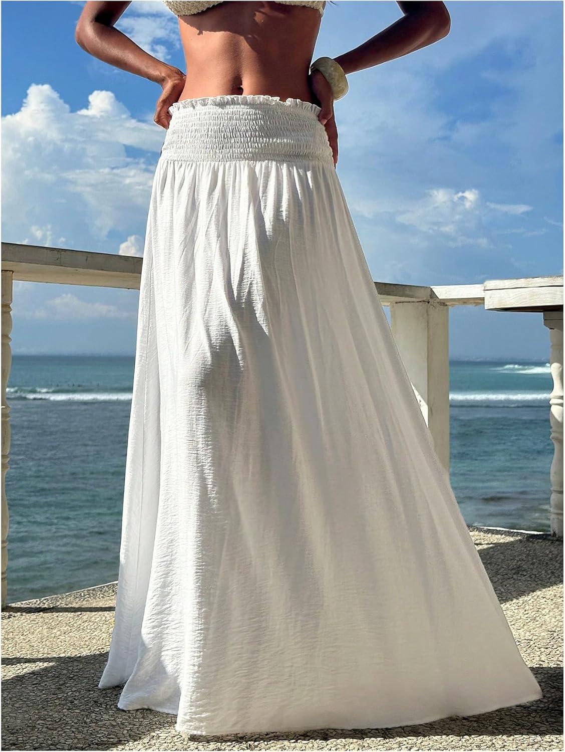 SOLY HUX Women’s Summer Maxi Skirts High Waisted Shirred Swing Flowy Boho Vacation Skirt(Plain White)