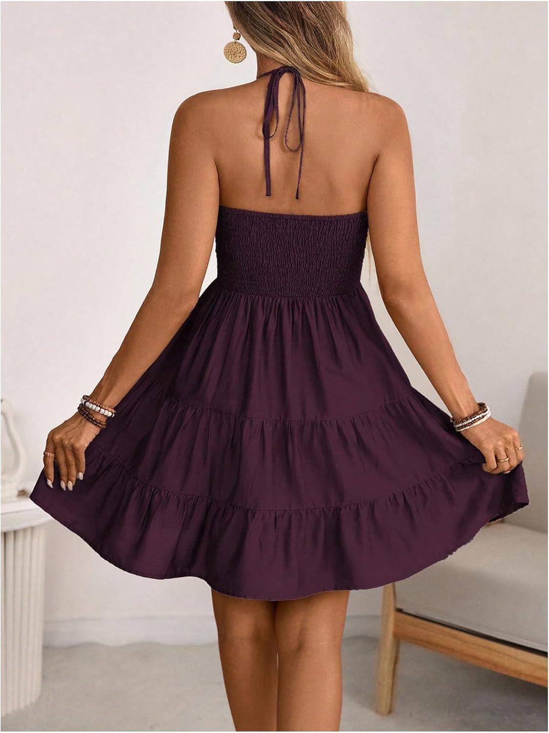SOLY HUX Women’s Summer Mini Dress Halter Backless Sleeveless A Line Ruffle Hem Flowy Cami Dresses Sundress(Pure Maroon)