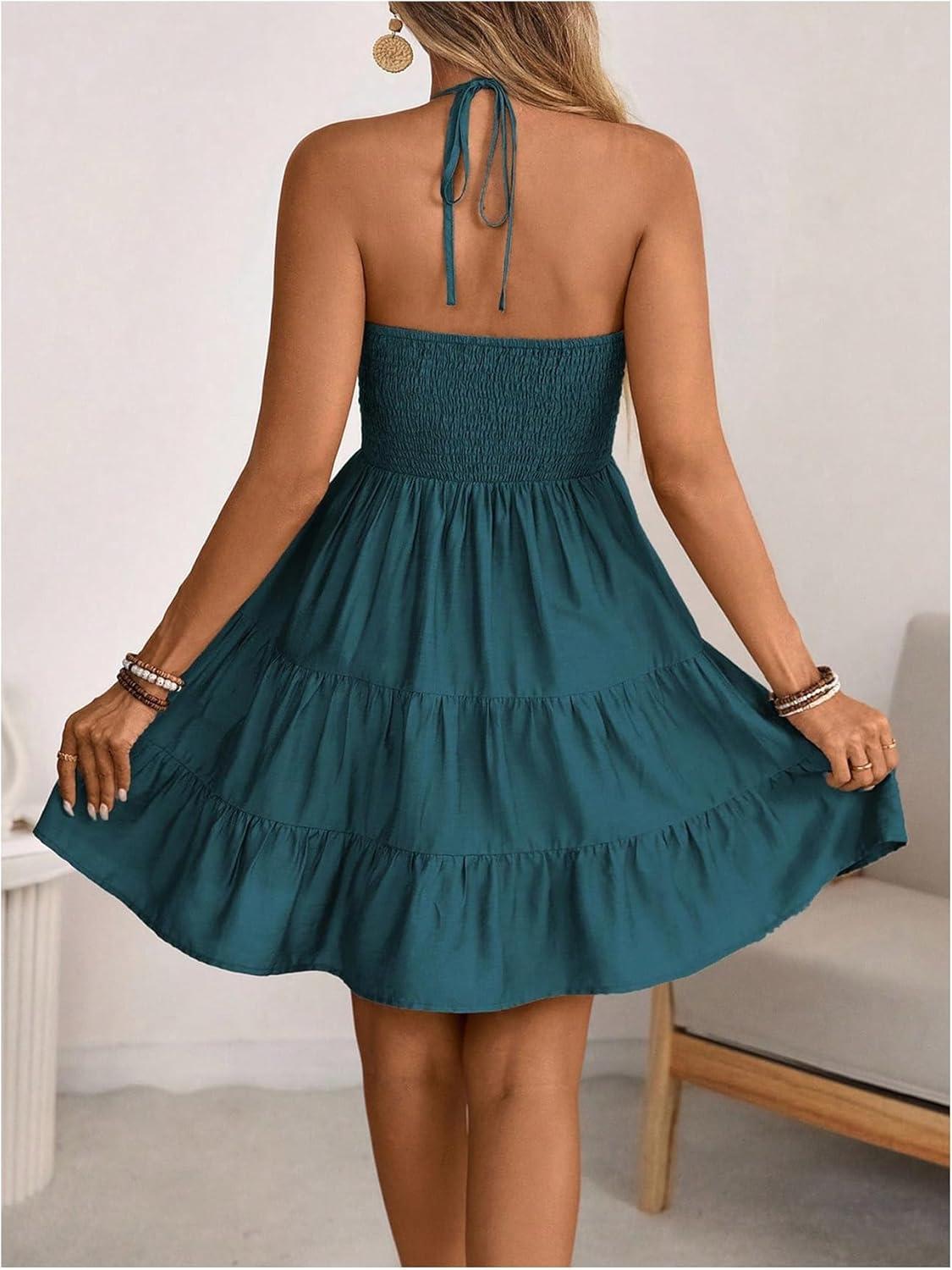 SOLY HUX Women’s Summer Mini Dress Halter Backless Sleeveless A Line Ruffle Hem Flowy Cami Dresses Sundress(Pure Teal Blue)