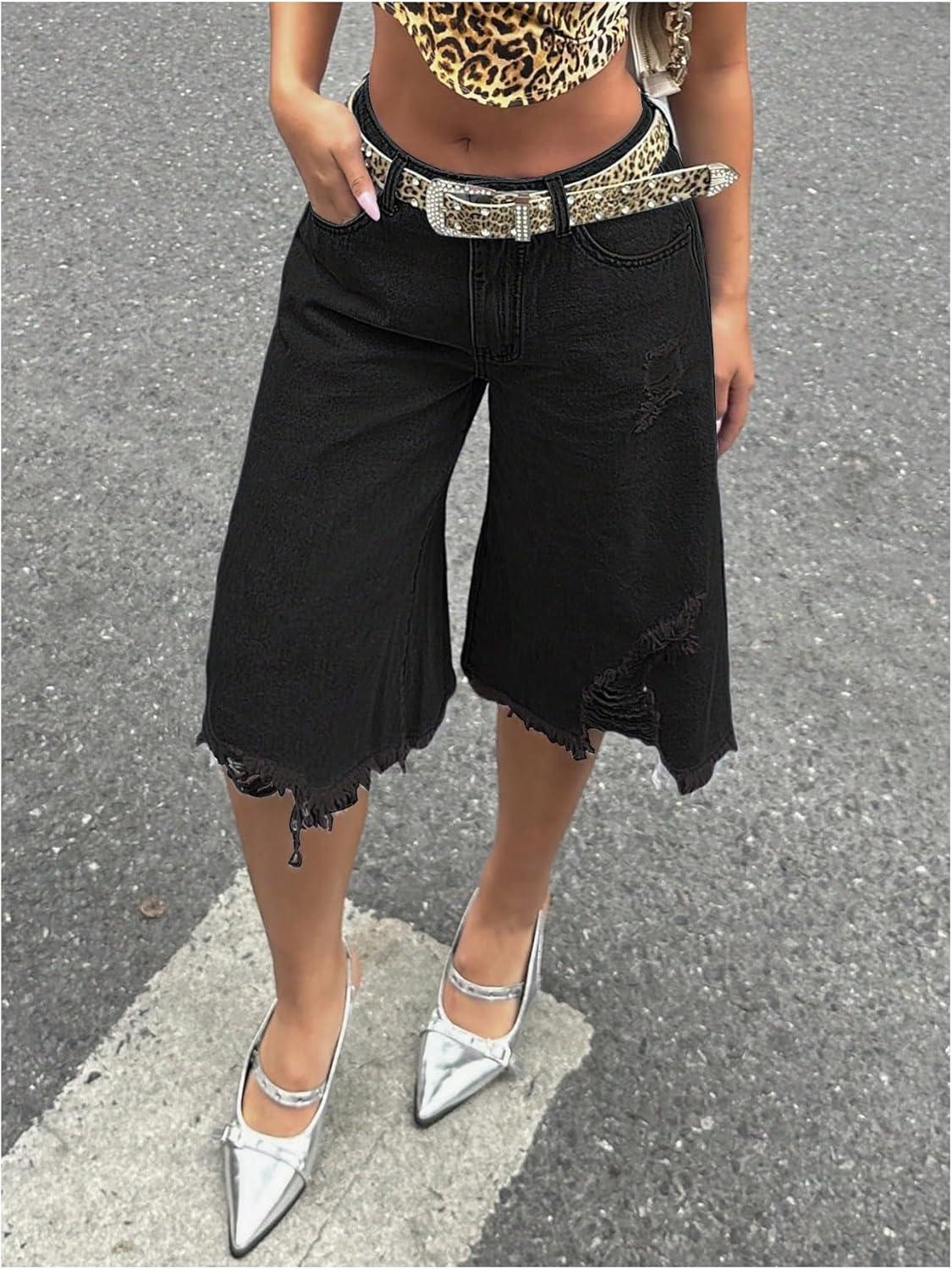 SOLY HUX Women’s Summer Ripped Denim Shorts Y2k Wide Leg Baggy Cropped Jeans Capris Pants(Pure Black)