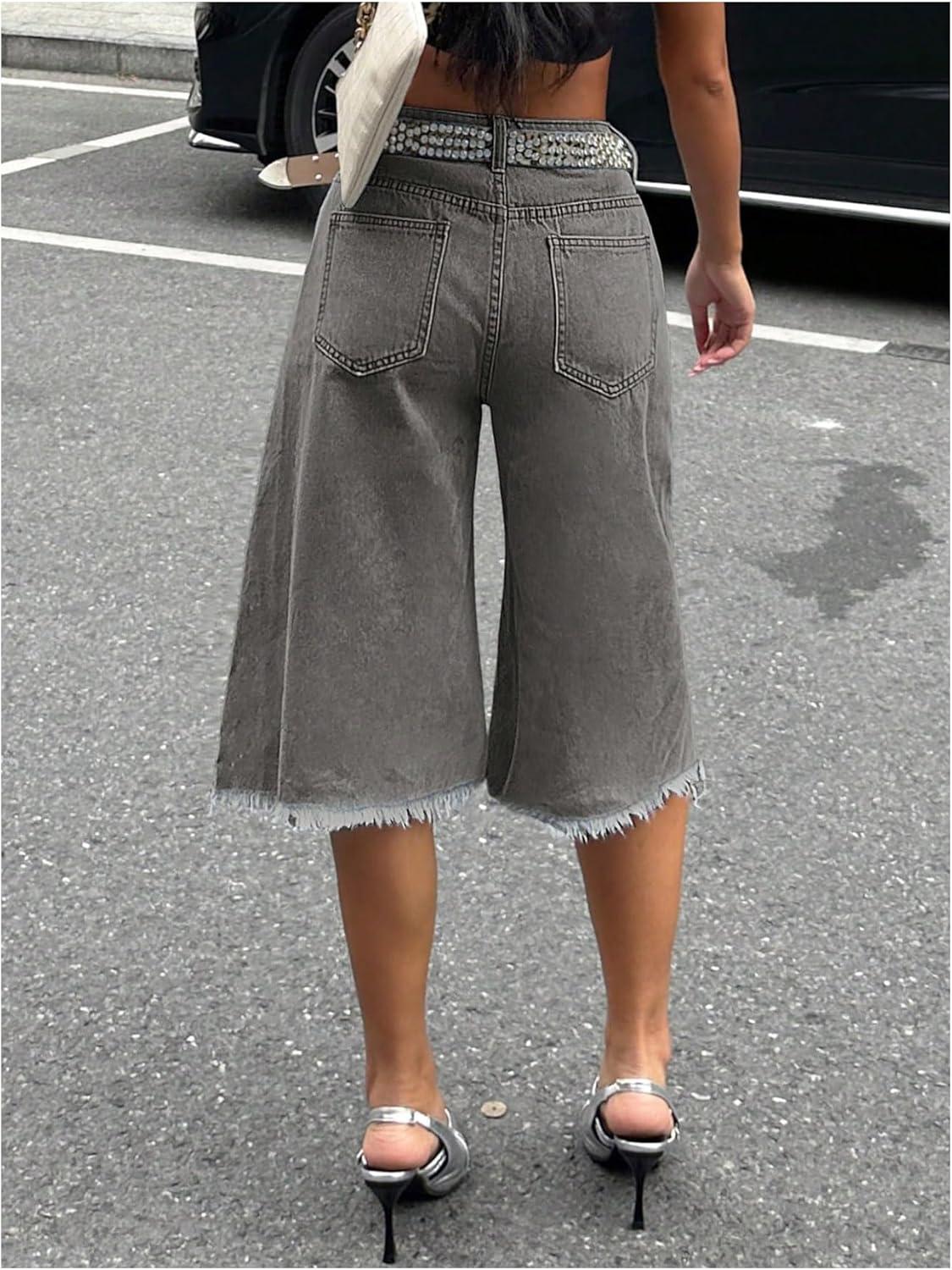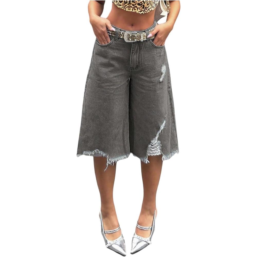 SOLY HUX Women’s Summer Ripped Denim Shorts Y2k Wide Leg Baggy Cropped Jeans Capris Pants(Pure Grey)