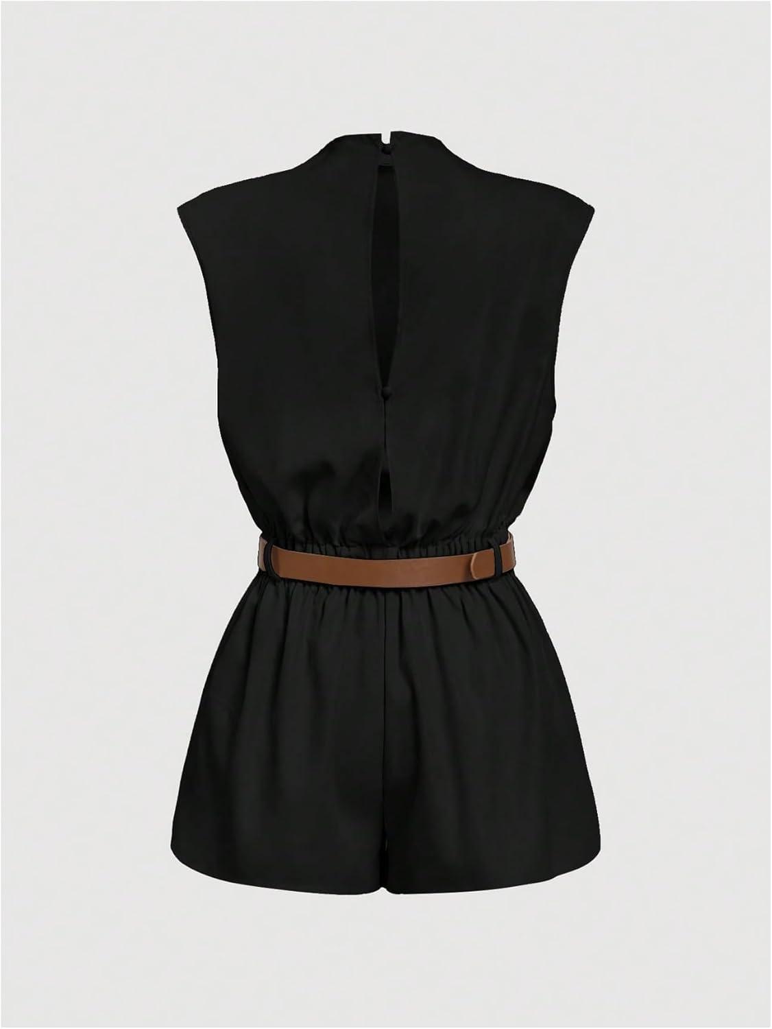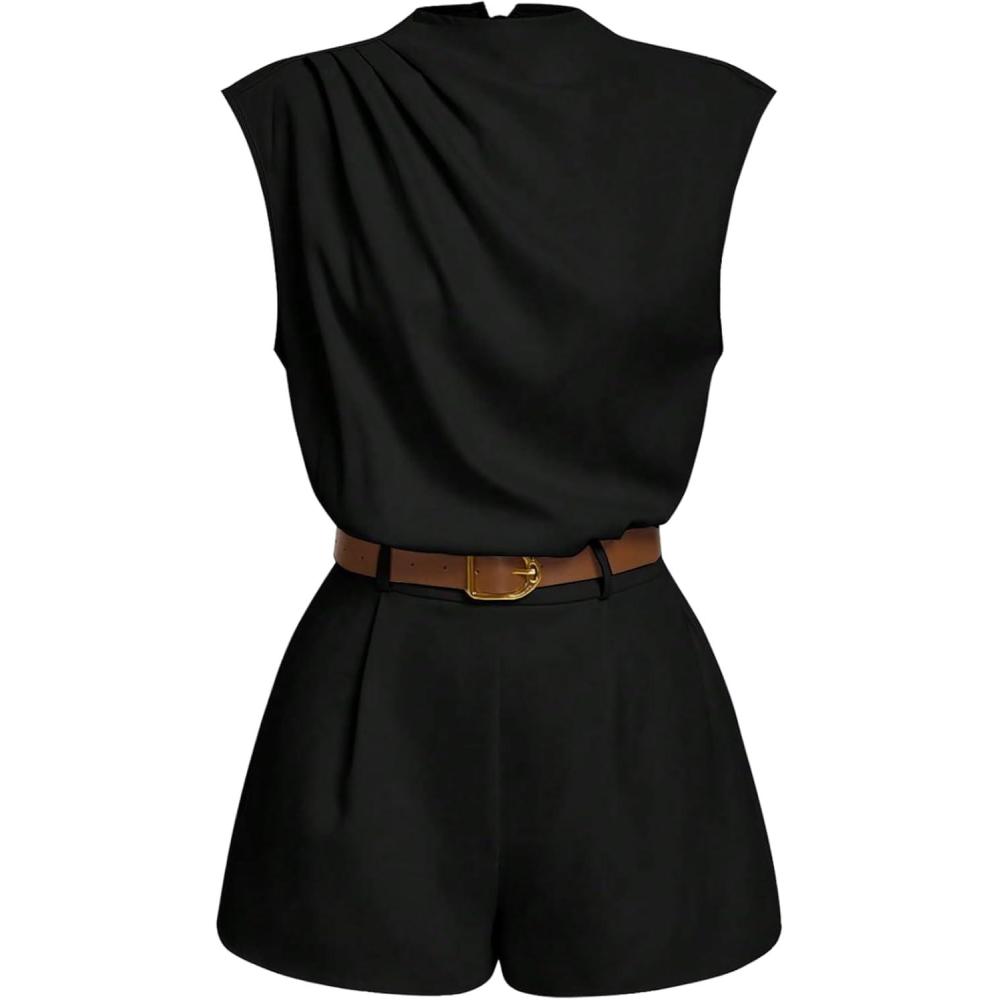 SOLY HUX Women’s Summer Ruched Mock Neck Romper Elegant Cap Sleeve Belted Work Short Jumpsuits(Pure Black)