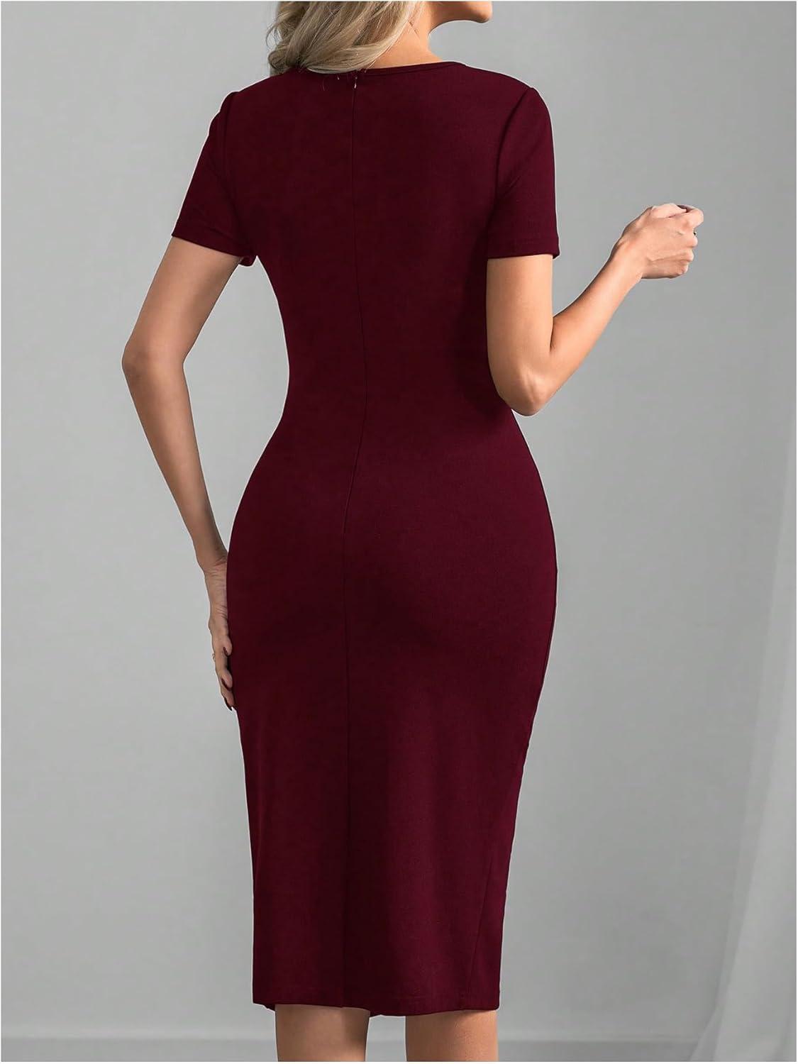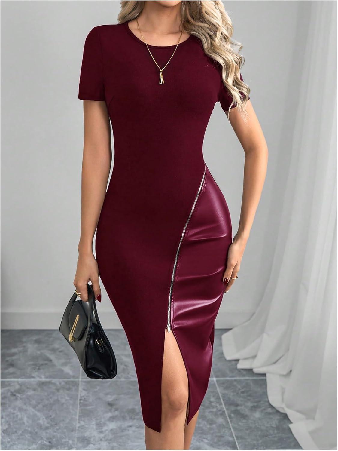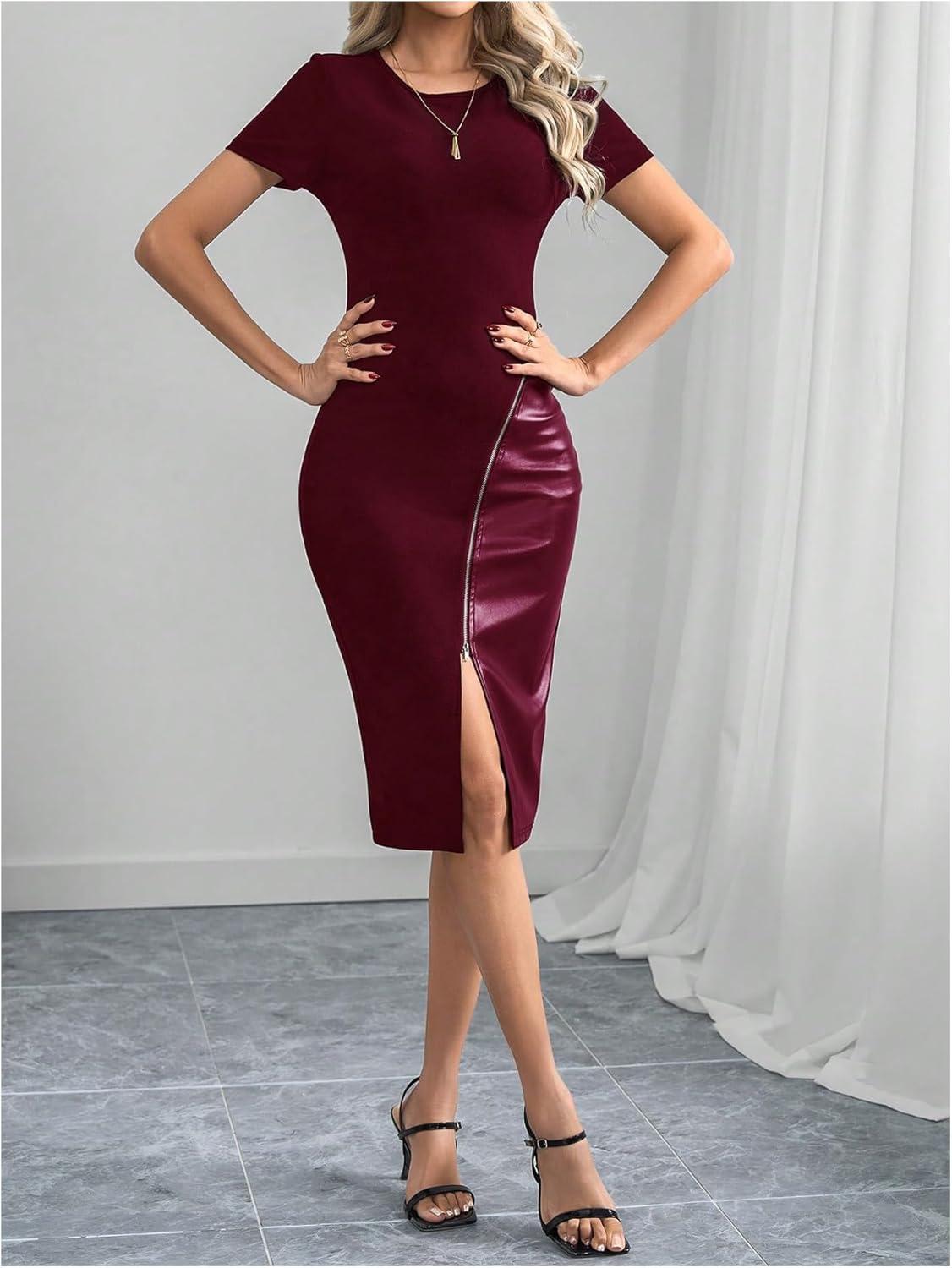 SOLY HUX Women’s Summer Short Sleeve Midi Dress PU Leather Zipper Split Bodycon Dresses(Plain Burgundy)