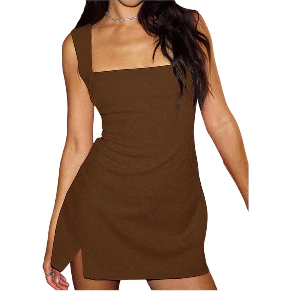 SOLY HUX Women’s Summer Sleeveless Mini Dress Square Neck Split Hem Bodycon Party Club Dresses(Solid Brown)