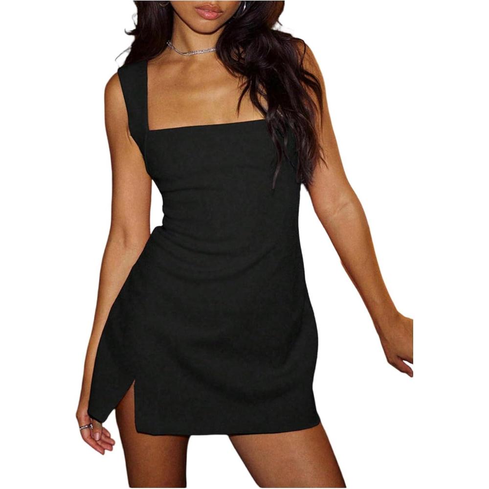 SOLY HUX Women’s Summer Sleeveless Mini Dress Square Neck Split Hem Bodycon Party Club Dresses(Solid Black)