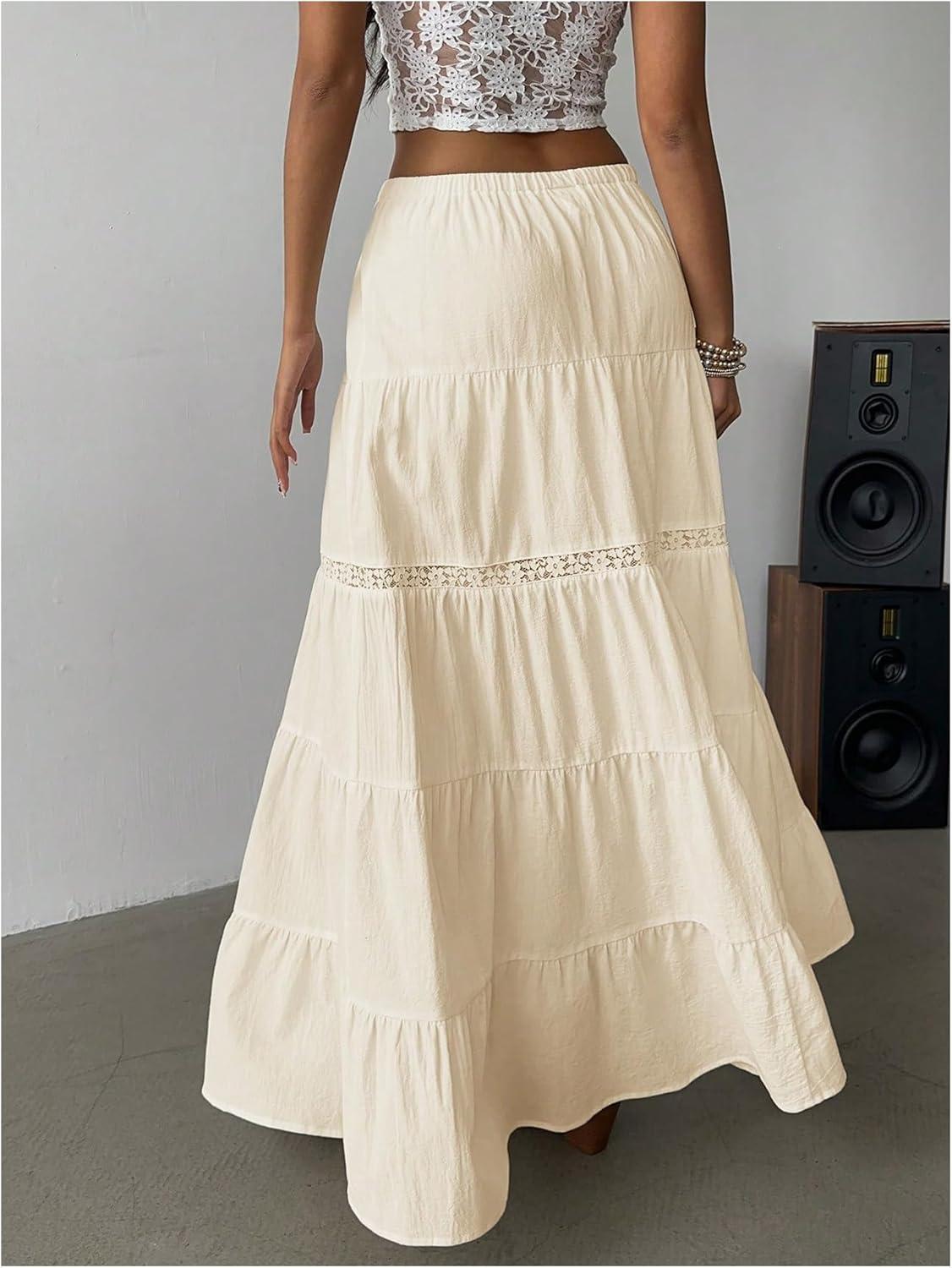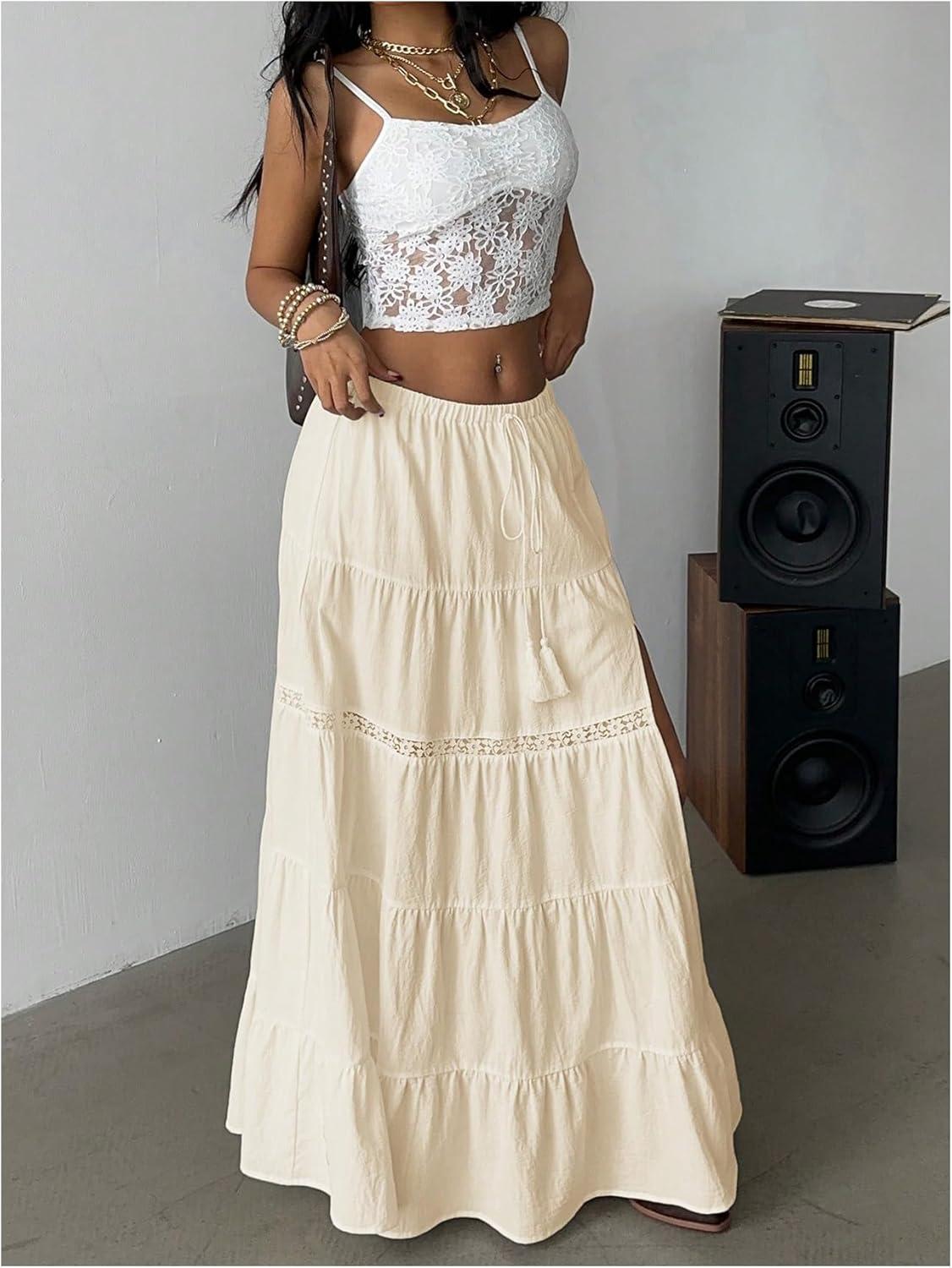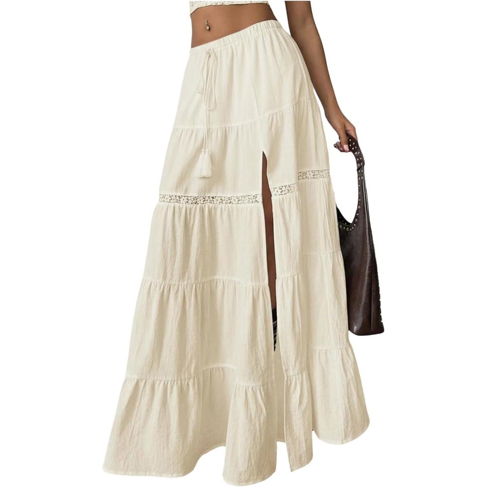 SOLY HUX Women’s Summer Split Maxi Skirt Tie Front Elastic Waist Lace Ruffle Hem Long Flowy Skirts(Pure Apricot)