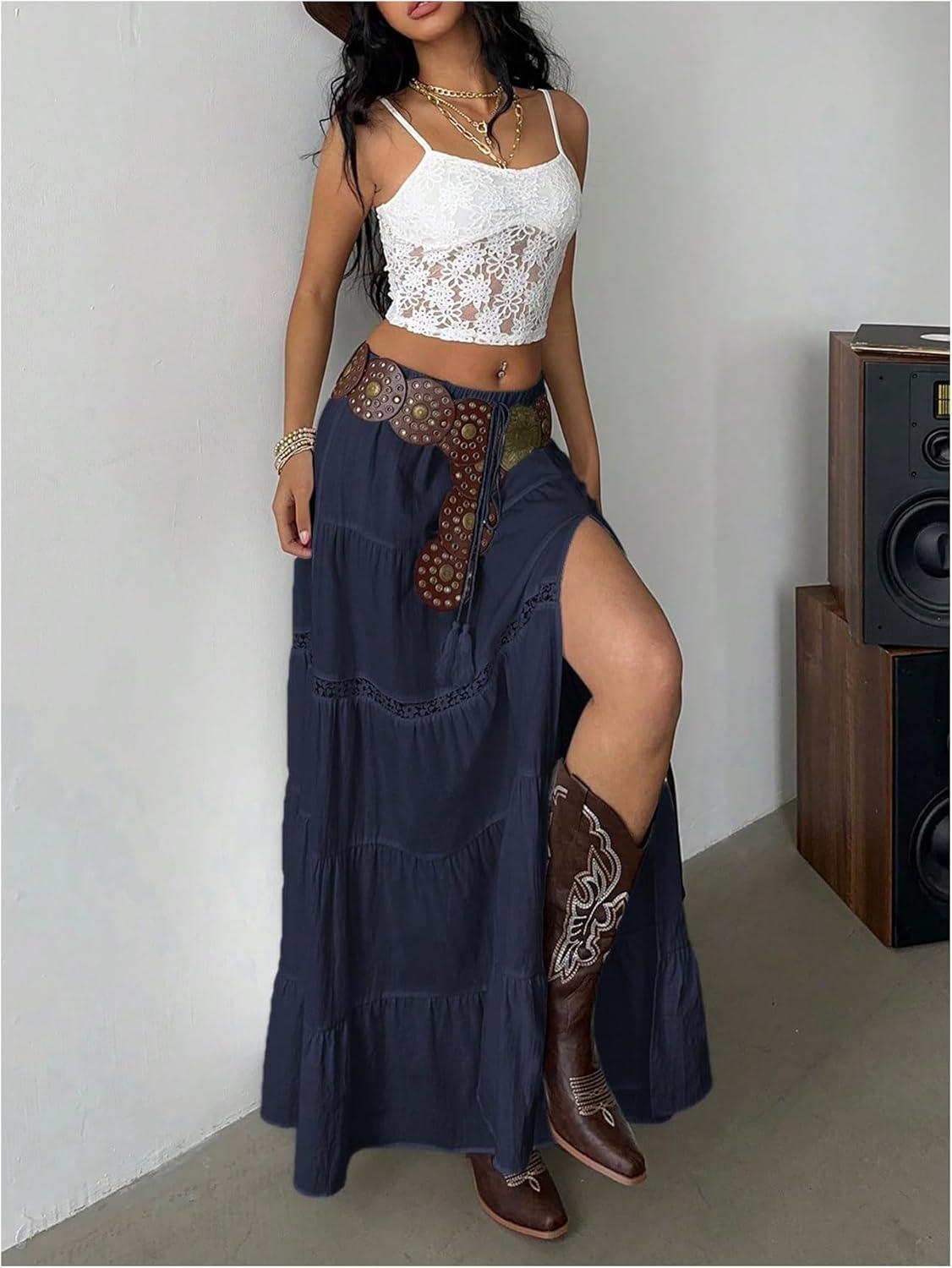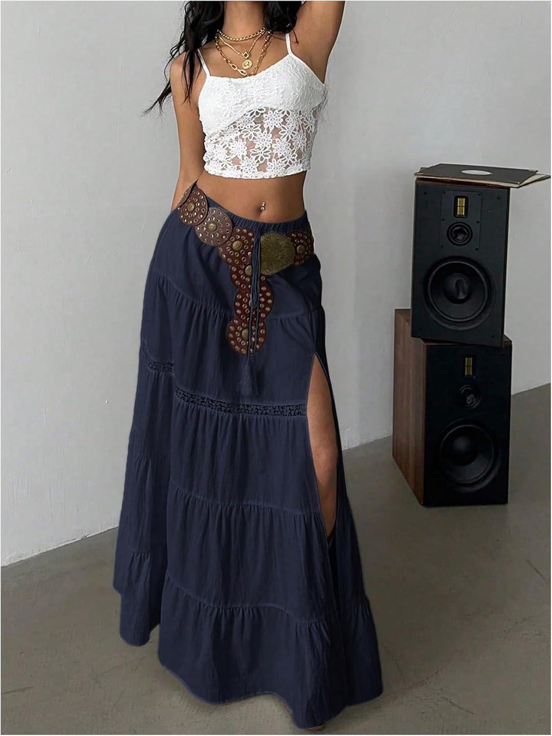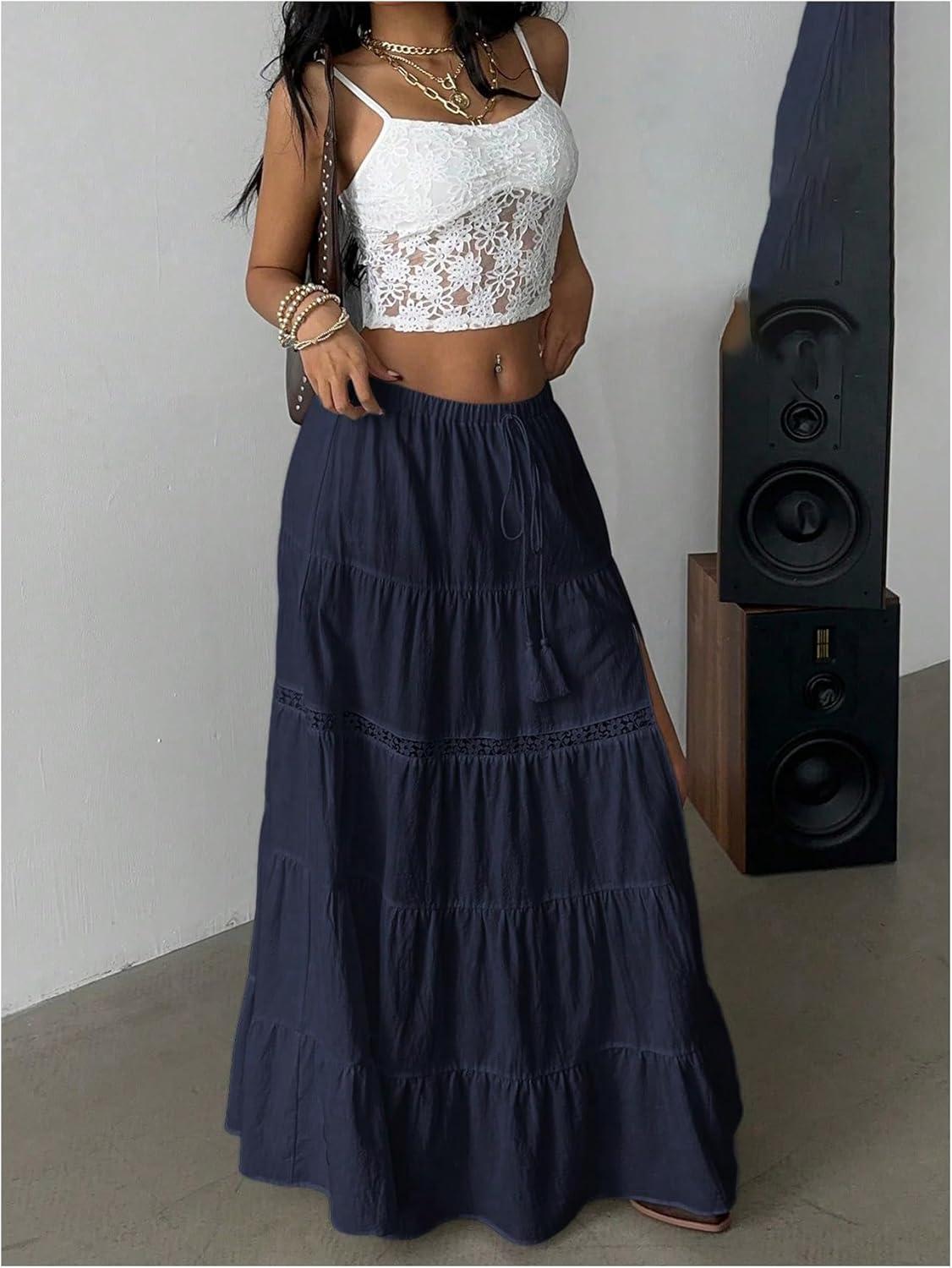 SOLY HUX Women’s Summer Split Maxi Skirt Tie Front Elastic Waist Lace Ruffle Hem Long Flowy Skirts(Pure Dark Blue)